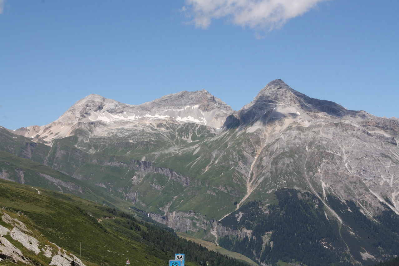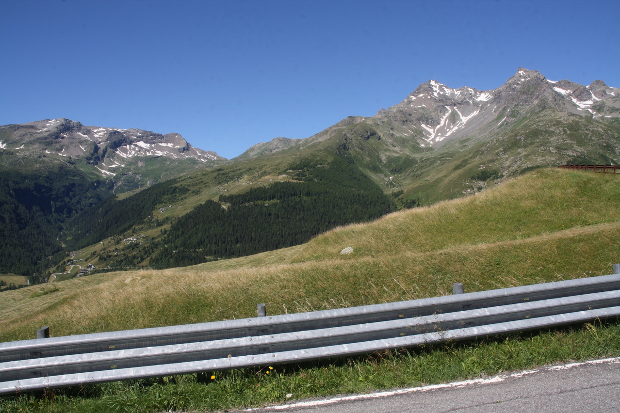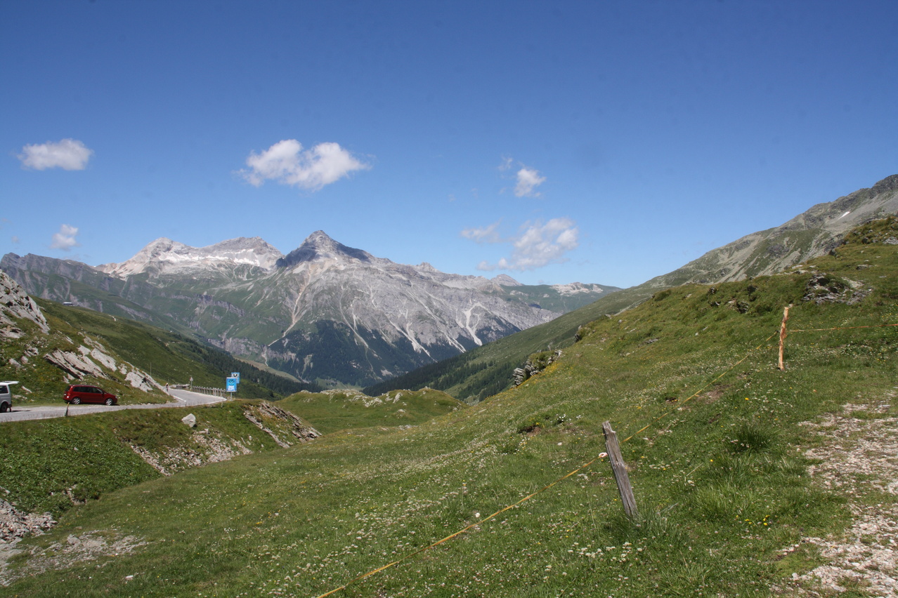 die hier deutlich suboptimal gegen den Abgrund gesicherte Splügenstraße, dahinter v. l. n. r.: Mittler Schwarzhorn, Surettahorn und Inner Schwarzhorn ![]() 300 dpi JPEG |