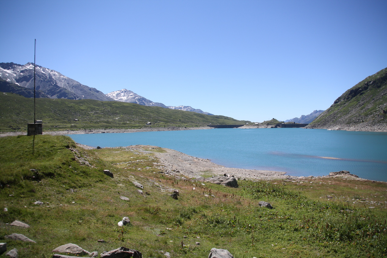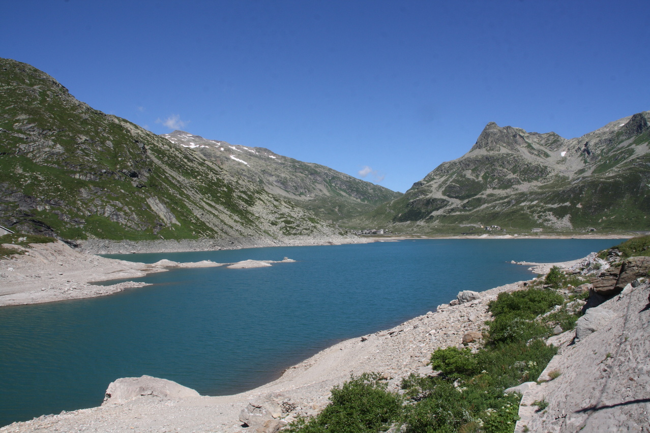 Blick über den Lago di Monte Spluga auf den zweiteiligen Staudamm mit integriertem Felsen in der Mitte ![]() 300 dpi JPEG |
