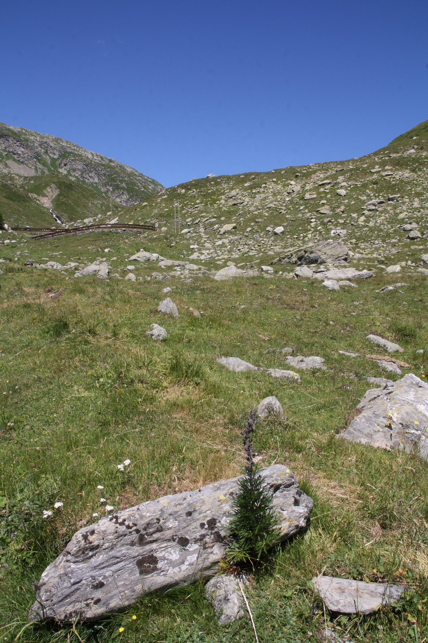 Blauer Eisenhut (Aconitum napellus) ☠, im Hintergrund die Splügenstraße oberhalb von Monte Spluga ![]() 300 dpi JPEG |