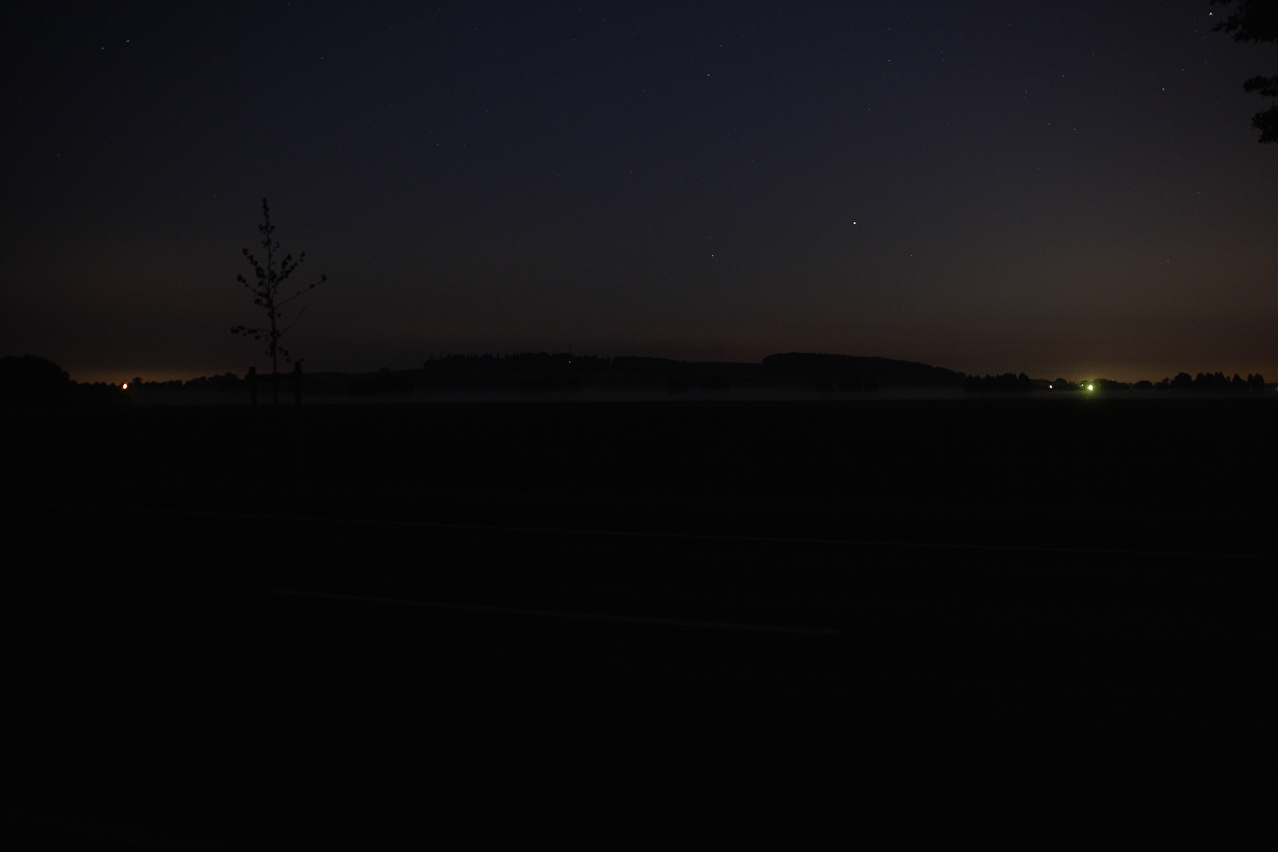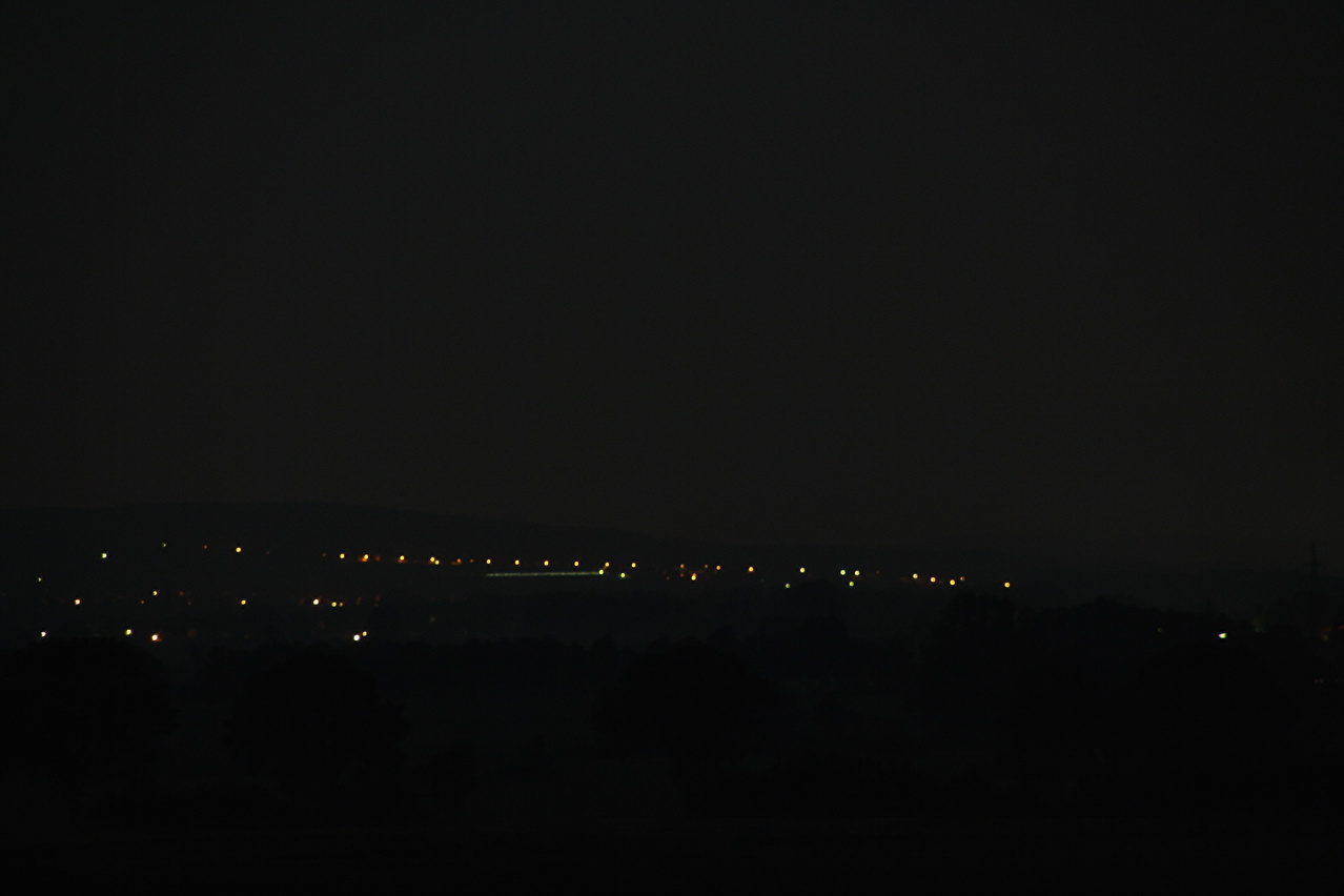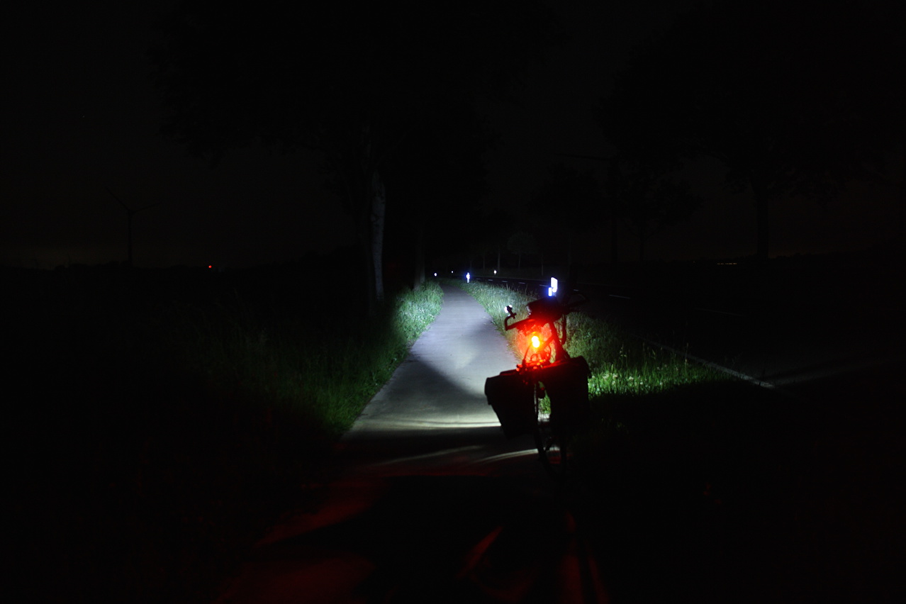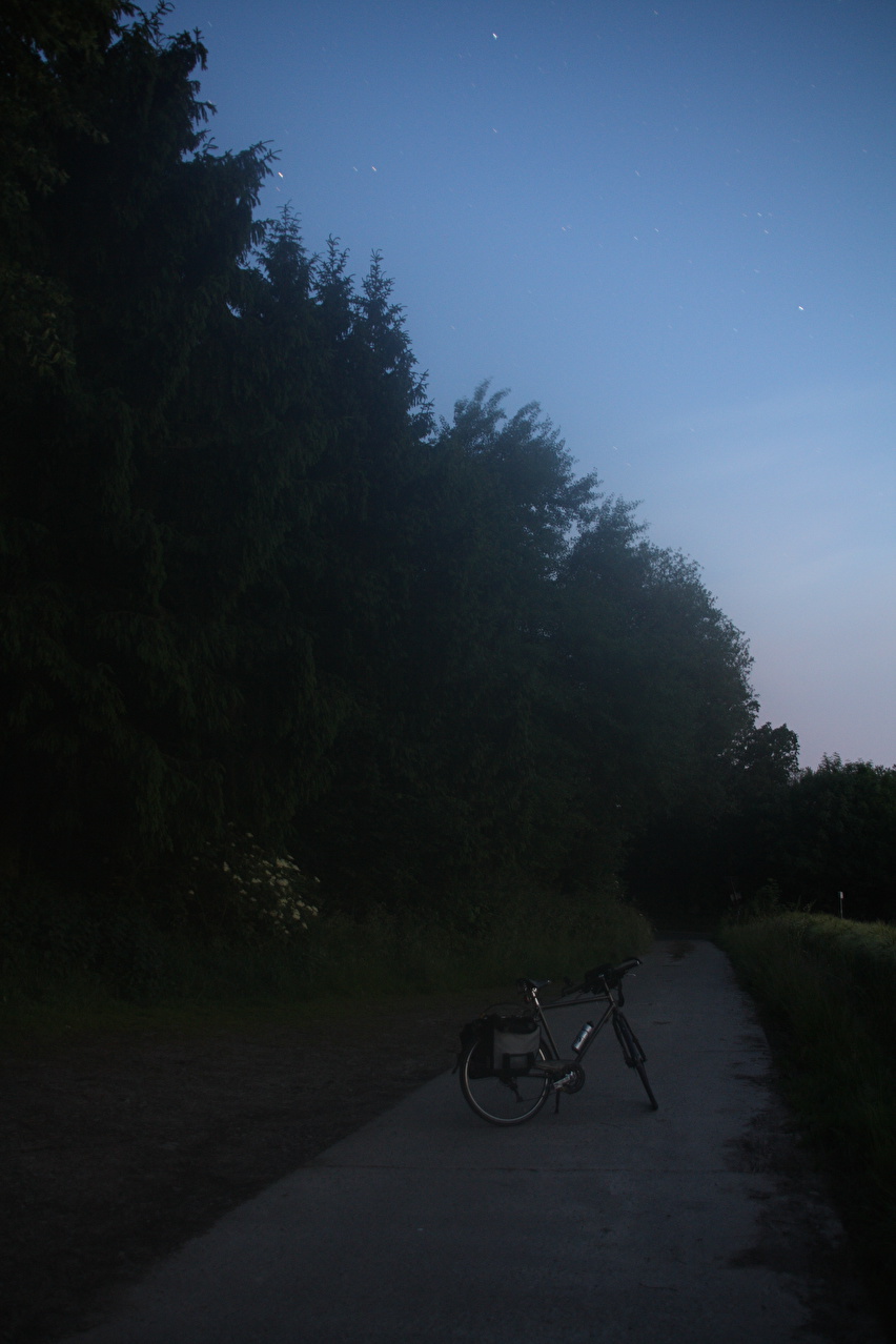 Beschreibung | An diesem Wochenende war es zu heiß für Tagestouren. Daher wurde, nachdem sich im Jahr zuvor keine Gelegenheit aufgedrängt hatte, wieder zu einer Nachtfahrt gestartet. Als Route wurde eine Runde "vor der Haustür" gewählt, die bei Tage gefahren bestens bekannt ist. Fahrtechnisch war diese Tour wenig anspruchsvoll, da die Fotopausen mit Stativauf- und abbau das Ganze sehr in die Länge zogen. An der Grenze zwischen Deutscher Mittelgebirgsschwelle und Norddeutscher Tiefebene, dessen Grenze im Tourverlauf mit dem Stemmer Berg überquert wurde, lag in der Nacht auch eine Wettergrenze. Südlich dieser Grenze war die Luft zwar spürbar feuchter als am Tage, dafür aber angenehm kühl. Nördlich dieser Grenze war die Luft etwas wärmer und vor allem so feucht, dass der Südrand der Norddeutschen Tiefebene mehr oder weniger eingenebelt war. Bei der Fotopause am Nordhang des Stemmer Berges beschlug das Objektiv der Kamera sofort. |