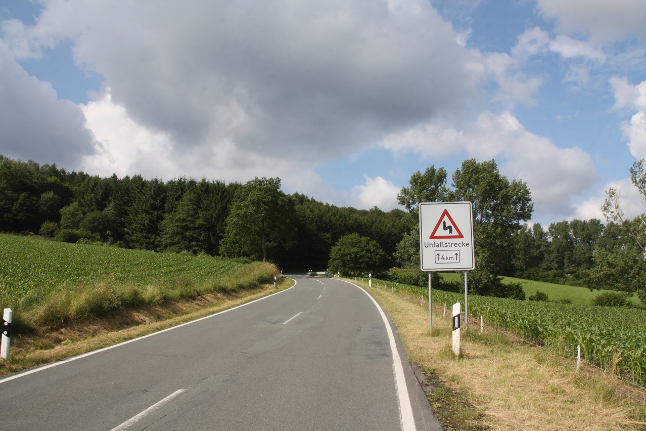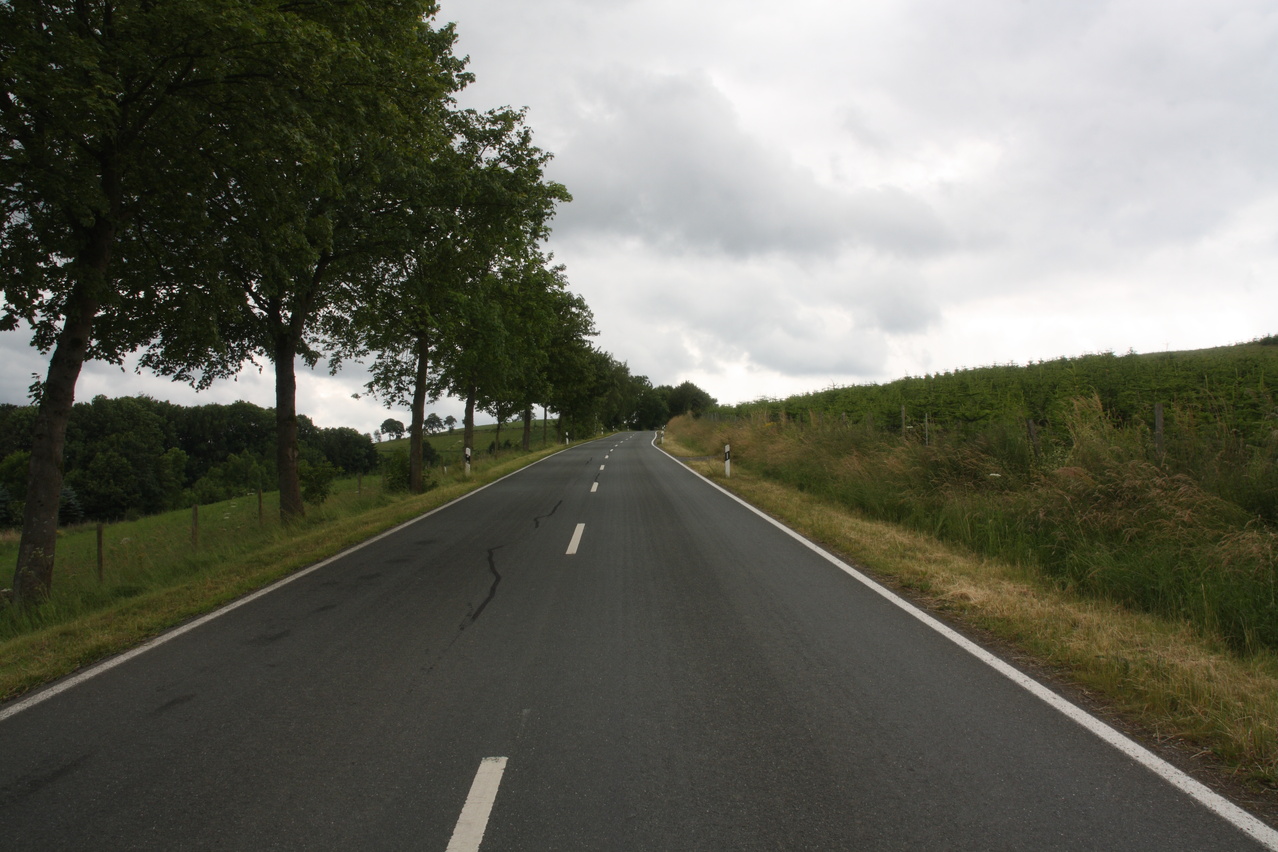 Beschreibung | Die zunehmenden Auflockerungen am Vorabend hatten Hoffnung auf besseres Wetter gemacht, aber diese Hoffnung wurde auch an diesem Tag jäh enttäuscht. Die Temperaturen erforderten selbst in der Ebene und bergauf ein langes Oberteil. Die Sonne kam wieder erst am späteren Nachmittag vermehrt durch, und so konnte wenigstens der letzte Anstieg der Tour in kurzen Klamotten gefahren werden. Immerhin blieb es anders als am Vortag bis auf ein wenig Gedröppel trocken. Obwohl diese Etappe reichlich Höhenmeter bot, enthielt sie keinen richtig langen Anstieg. Die Höhenmeter verteilten sich auf sechs Anstiege, von denen der erste der längste und der fünfte der steilste waren. Dass niedrig gelegene "Dach der Etappe" zeigt auf, dass die Berge im mit dieser Etappe durchquerten Homert nicht so hoch sind wie die Berge im Rothaargebirge. Daher erweckte auch jeder Sattelpunkt das Gefühl, ziemlich weit oben angekommen zu sein. Die Brachter Höhe erfüllt die Kriterien an einen Bergpass. Sie verbindet zwei Talorte, Bracht und Cobbenrode, und überquert den Höhenzug zwischen diesen beiden Orten an der niedrigsten Stelle. Die absoluten Höhendifferenzen sind im Vergleich mit Hochgebirgspässen natürlich geradzu lächerlich gering. Bei den anderen fünf Sattelpunkten dieser Tour ist die jeweilige Situation nicht so eindeutig wie bei der Brachter Höhe. Im unteren Bereich der Abfahrt von Hellefeld nach Arnsberg dominiert Laubwald zunehmend das Landschaftbild. Dies war ein deutliches Zeichen, dass die Etappe nicht noch weiter nach unten hätte führen dürfen. In Arnsberg wurde der nächste Zug nach Hannover über Dortmund und Minden genommen. Dies war in mehrerer Hinsicht ein Fehler. Zum einen führt diese Verbindung weitgehend durch unendlich öde flache Landschaft, zum Anderen war in Minden fahrplanmäßig nur 5 Minuten Umsteigezeit, und da der Zug von Dortmund nach Minden unterwegs 11 Minuten Verspätung eingesammelt hatte, war der Anschlusszug nach Hannover natürlich weg. Mit dem nächst späteren Zug ab Arnsberg über Warburg und Altenbeken wäre die Ankunft in Hannover fahrplanmäßig auch nicht später gewesen. Dafür hätte die Fahrt bis Bennigsen durch wesentlich attraktivere Landschaften geführt. |