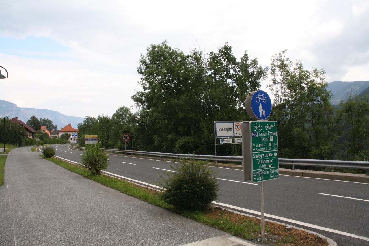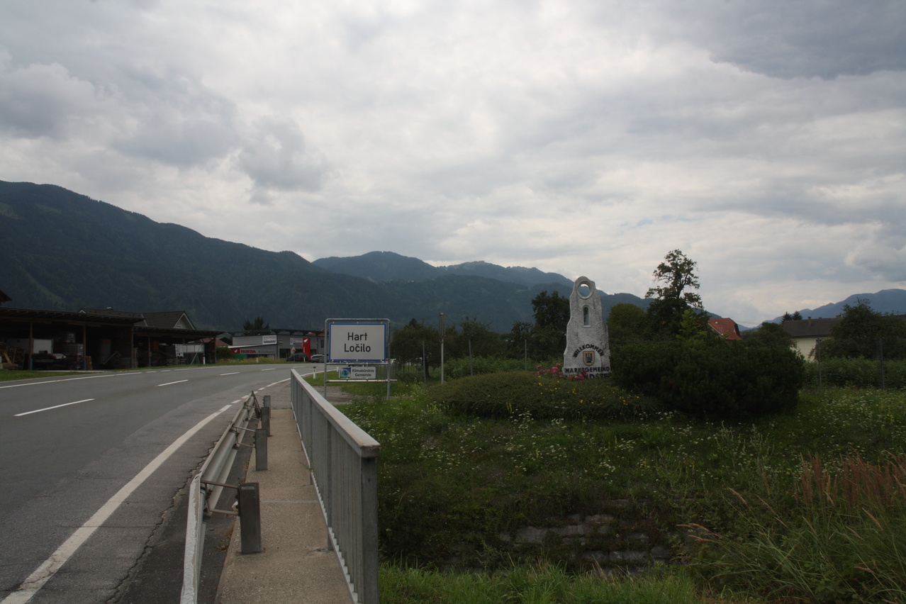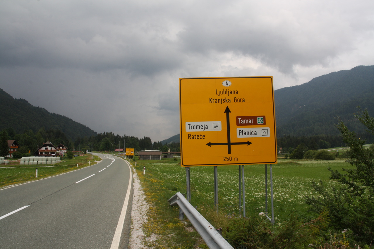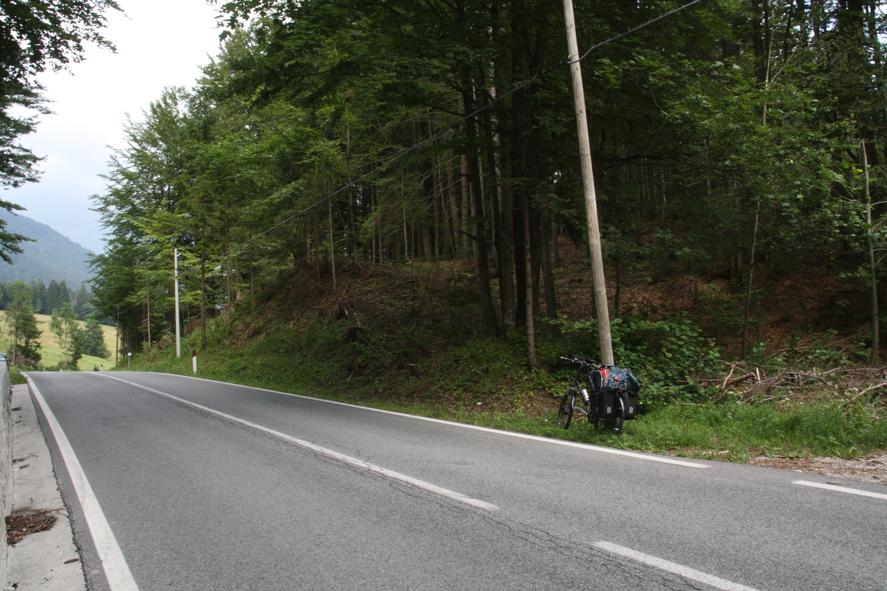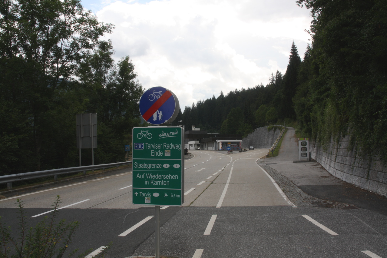 Beschreibung | Nun endlich wurde die erste Etappe in den Alpen gestartet, die gleich durch drei Staaten führen sollte. Da in Villach bereits das Volksfest tobte, dessen Aufbau am Vorabend die Quartiersuche behindert hatte, zog sich die Ausfahrt aus Villach unnötig in die Länge. In Fürnitz war dann Schluss mit Lustig, das Hinterrad blockierte bei einem Anfahrversuch. ☹ Nach ein paar mal Hin- und Herschieben knackte es im Hinterrad einmal laut und danach rollte es wieder. Da äußerlich kein Grund für das Blockieren erkennbar war, lag der Verdacht nahe, dass der Freilaufkörper hinüber sei. Also wurde umgedreht und die nächstgelegene Fahrradwerkstatt in Warmbad Villach angefahren, wo der Freilaufkörper ausgetauscht wurde. Die Zwangspause wurde gleich zum Mittagessen genutzt. Danach begann der zweite "Anlauf". Wegen des Zeitverlustes wurde die kürzeste Strecke über Tarvisio gewählt. Über den Wurzenpass wäre es noch kürzer gewesen, aber eine Zeitersparnis hätte der wohl nicht gebracht. Der wäre auch richtig auf's Material gegangen, da auf der Nordrampe längere Abschnitte mit über 10 % und bis zu 18 % und auf der Südrampe Abschnitte mit bis zu 16 % Neigung liegen. Und im Rahmen einer ersten Etappe im Hochgebirge muss so etwas schon gar nicht sein. Bei der Einfahrt nach Hart fällt das zweisprachige Ortsschild mit deutschem und slowenischem Ortsnahmen auf. Bei Thörl-Maglern erfolgte der erste Grenzübertritt von Österreich nach Italien. Bei Coccau wird die Passhöhe mit einen Scheiteltunnel unterquert, der aus Zeitgründen auch benutzt wurde. Von Tarvisio aus ging es mit etwas welligem Profil tendenziell bergauf, bis noch auf italienischer Seite zwischen Fusine in Valromana und Rateče der höchste Punkt der Etappe erreicht wurde. Danach folgten keine Steigungen mehr bis zum Etappenziel. Nach dem "Dach der Etappe" erfolgte bald der zweite Grenzübertritt von Italien nach Slowenien. Vom "Eisernen Vorhang" ist an der Grenze nichts mehr zu sehen. Nach Osten hin wurden die Wolken immer dunkler, am westlichen Ortsrand von Kranjska Gora setzte Regen ein. |