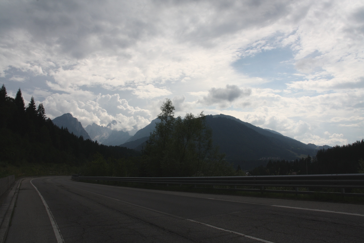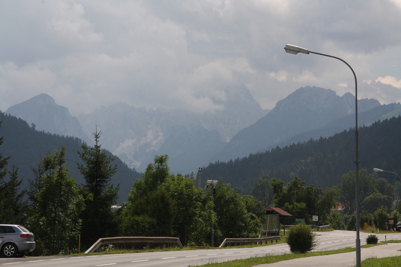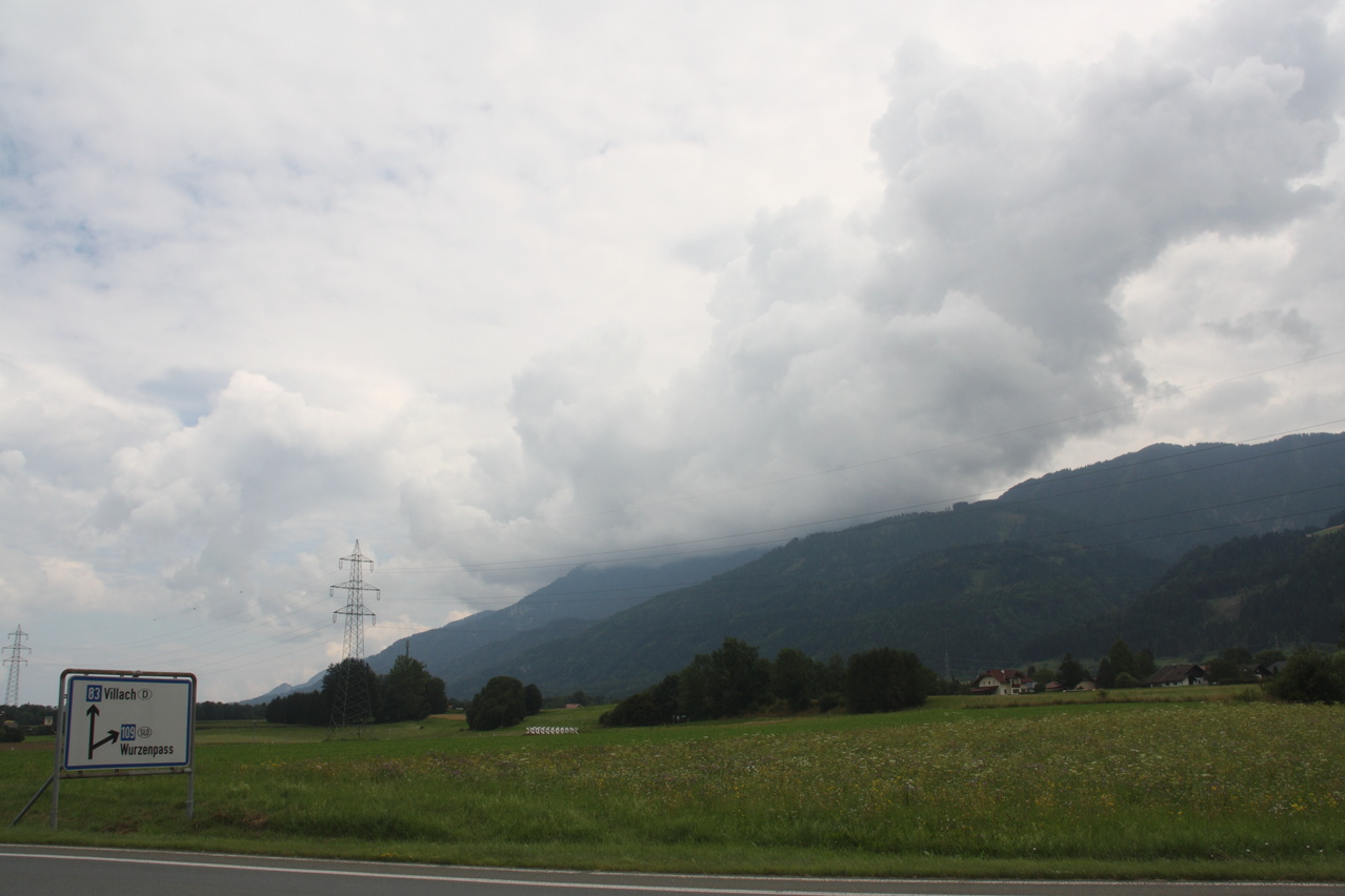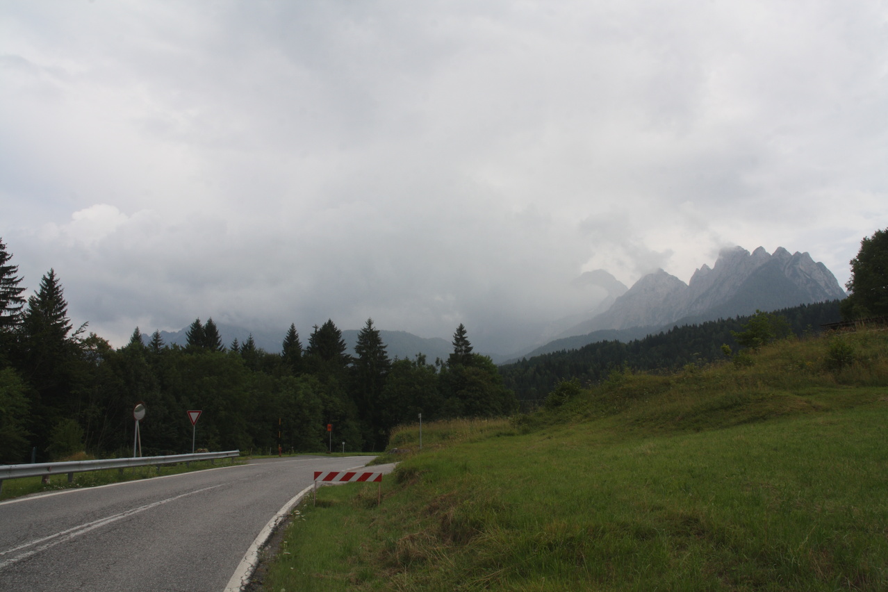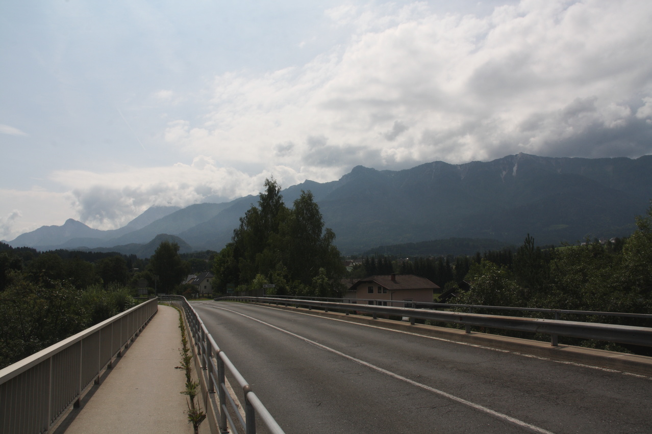 Beschreibung | Nun endlich wurde die erste Etappe in den Alpen gestartet, die gleich durch drei Staaten führen sollte. Da in Villach bereits das Volksfest tobte, dessen Aufbau am Vorabend die Quartiersuche behindert hatte, zog sich die Ausfahrt aus Villach unnötig in die Länge. In Fürnitz war dann Schluss mit Lustig, das Hinterrad blockierte bei einem Anfahrversuch. ☹ Nach ein paar mal Hin- und Herschieben knackte es im Hinterrad einmal laut und danach rollte es wieder. Da äußerlich kein Grund für das Blockieren erkennbar war, lag der Verdacht nahe, dass der Freilaufkörper hinüber sei. Also wurde umgedreht und die nächstgelegene Fahrradwerkstatt in Warmbad Villach angefahren, wo der Freilaufkörper ausgetauscht wurde. Die Zwangspause wurde gleich zum Mittagessen genutzt. Danach begann der zweite "Anlauf". Wegen des Zeitverlustes wurde die kürzeste Strecke über Tarvisio gewählt. Über den Wurzenpass wäre es noch kürzer gewesen, aber eine Zeitersparnis hätte der wohl nicht gebracht. Der wäre auch richtig auf's Material gegangen, da auf der Nordrampe längere Abschnitte mit über 10 % und bis zu 18 % und auf der Südrampe Abschnitte mit bis zu 16 % Neigung liegen. Und im Rahmen einer ersten Etappe im Hochgebirge muss so etwas schon gar nicht sein. Bei der Einfahrt nach Hart fällt das zweisprachige Ortsschild mit deutschem und slowenischem Ortsnahmen auf. Bei Thörl-Maglern erfolgte der erste Grenzübertritt von Österreich nach Italien. Bei Coccau wird die Passhöhe mit einen Scheiteltunnel unterquert, der aus Zeitgründen auch benutzt wurde. Von Tarvisio aus ging es mit etwas welligem Profil tendenziell bergauf, bis noch auf italienischer Seite zwischen Fusine in Valromana und Rateče der höchste Punkt der Etappe erreicht wurde. Danach folgten keine Steigungen mehr bis zum Etappenziel. Nach dem "Dach der Etappe" erfolgte bald der zweite Grenzübertritt von Italien nach Slowenien. Vom "Eisernen Vorhang" ist an der Grenze nichts mehr zu sehen. Nach Osten hin wurden die Wolken immer dunkler, am westlichen Ortsrand von Kranjska Gora setzte Regen ein. |