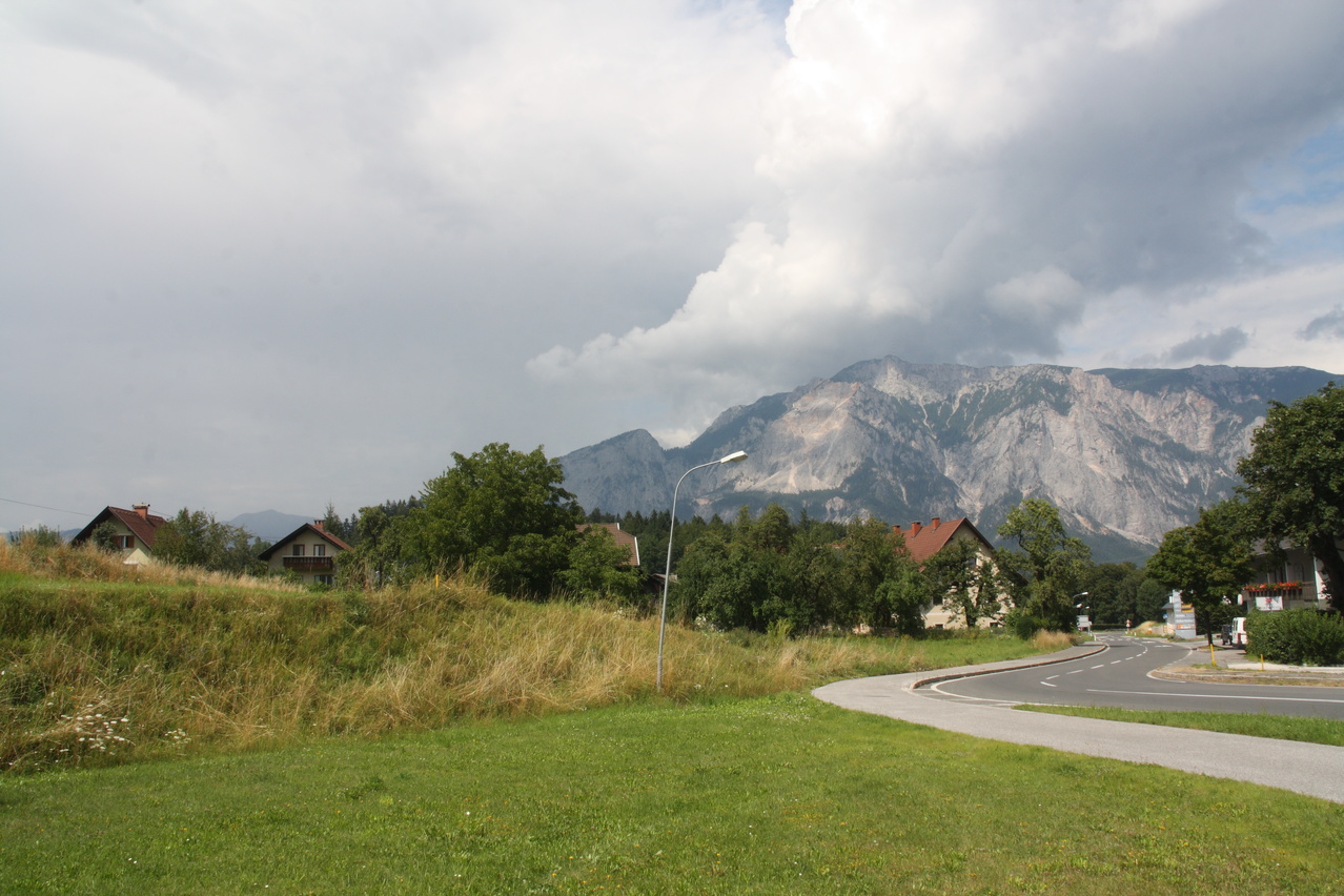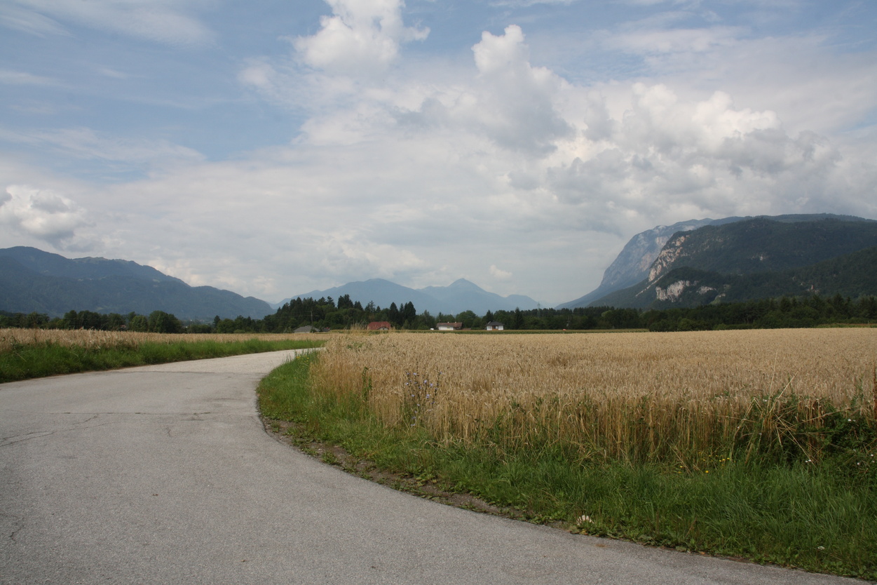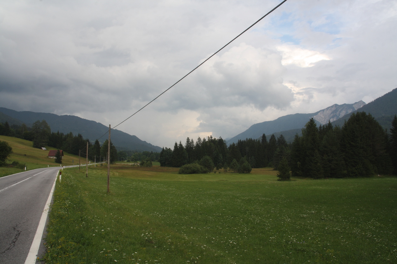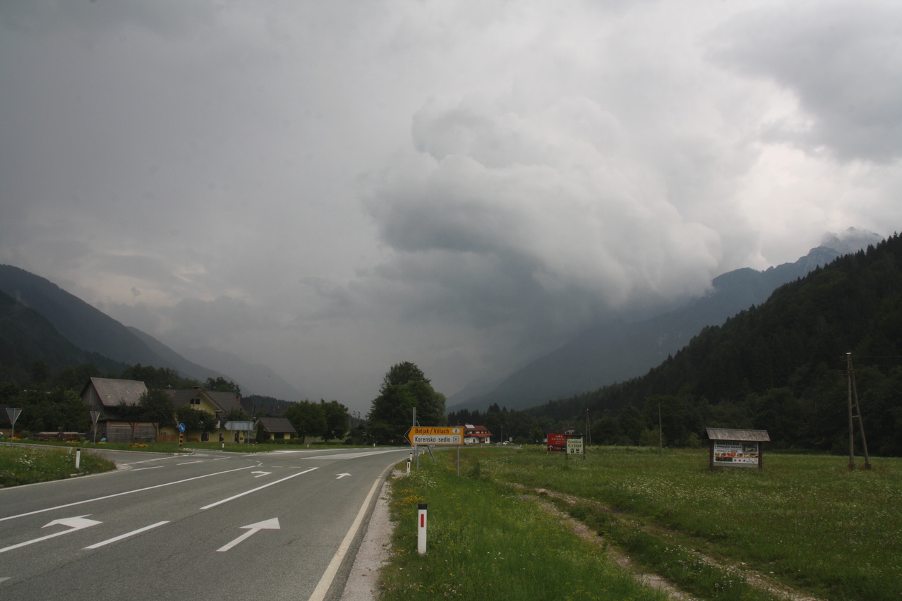 unteres Ende der Südrampe zum Korensko sedlo — und Regen über Kranjska Gora ![]() 300 dpi JPEG |