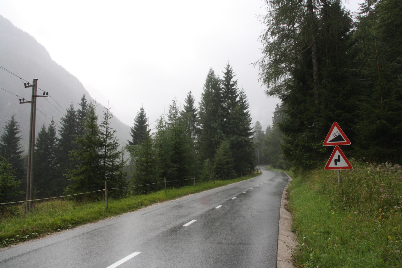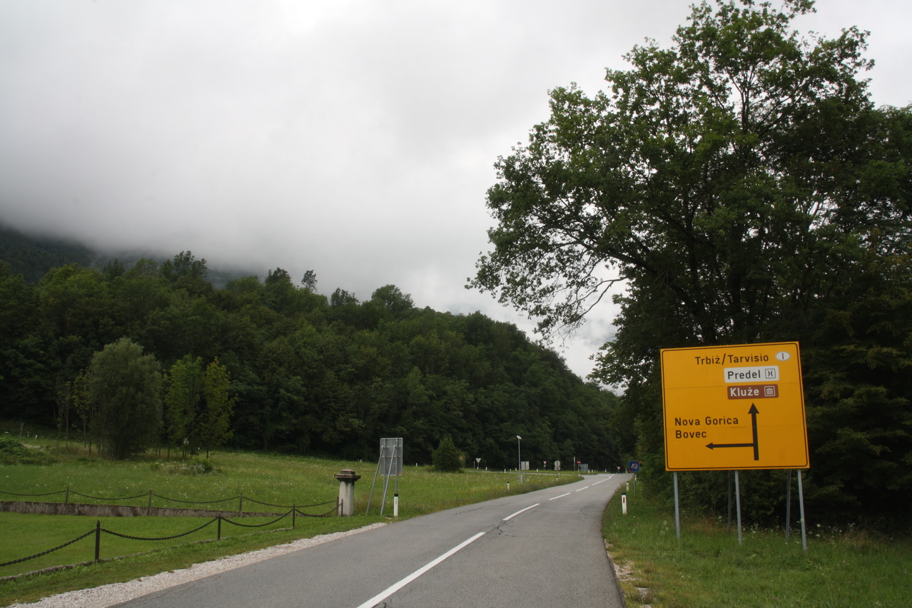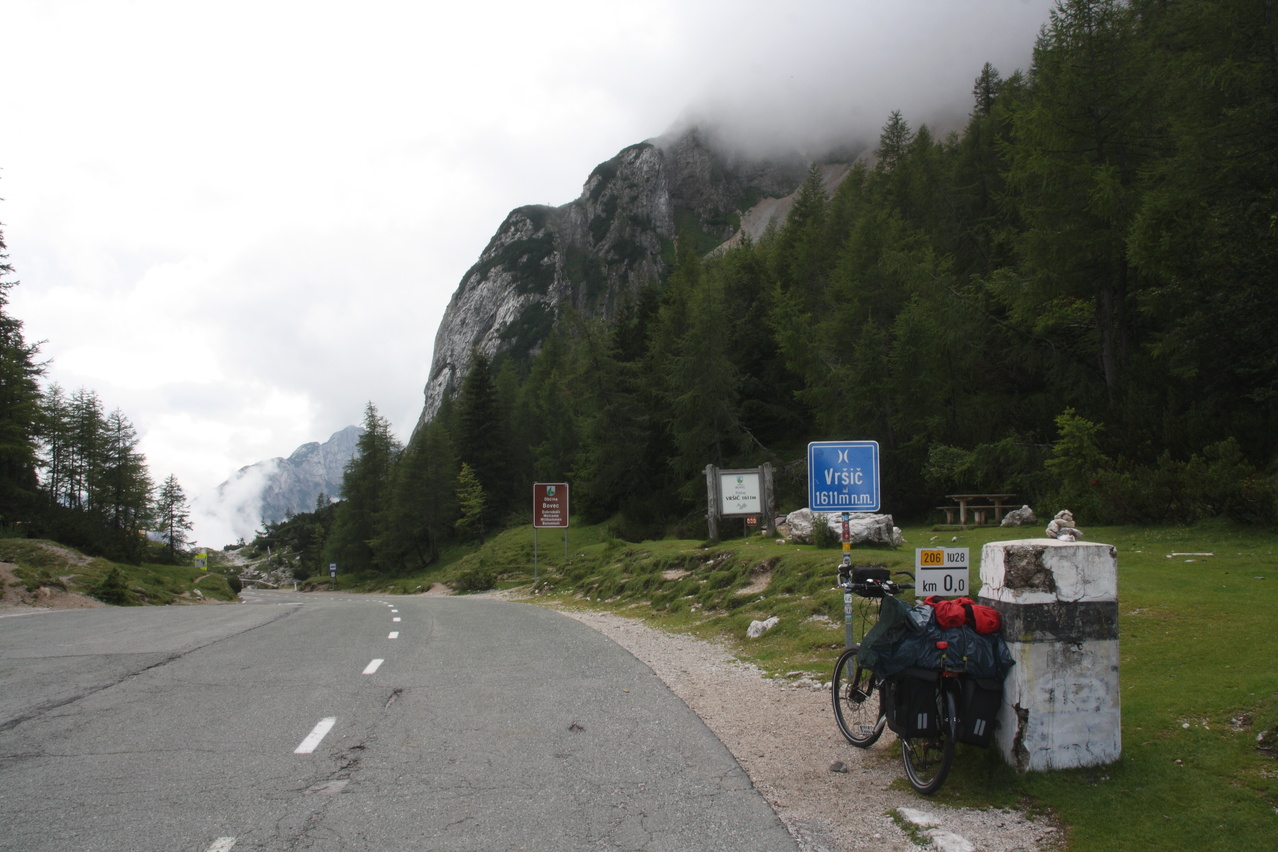Beschreibung | Mit dem Vršič stand der höchstgelegene befahrbare Pass Sloweniens auf dem Programm. Die Etappe wurde bereits im Regen gestartet und der hielt sich längere Zeit. Die Temperaturen erlaubten die Bergauffahrt nur mit Regenjacke. Erst nach einer Rast in einer Jausenstation an der Nordrampe blieb es bis zur Passhöhe trocken. Dort setzte aber wieder Regen ein. Für die Abfahrt musste "Vollschutz", also Regenhelmüberzieher, Regenjacke, Regenüberhandschuhe, Regenhose und Regengamaschen angelegt werden, um nicht in Folge von Durchnässung auszukühlen. Der Vollschutz konnte erst kurz vor dem Etappenziel wieder abgelegt werden. Die mit dem Regen einhergehende tief liegende Bewölkung verhinderte einen Blick durch das natürliche Fenster im Prisojnik. Die Passstraße über den Vršič enthält 49 durchnummerierte Kehren, wobei die Nummerierung bei der tiefstgelegenen Kehre der Nordrampe beginnt. Die Kehren verteilen sich gleichmäßig über die beiden Rampen, 24 Kehren liegen in der Nordrampe, 25 Kehren in der Südrampe. Die Kehren in der Nordrampe sind im Gegensatz zur ansonsten asphaltierten Straße mit Kopfsteinpflaster ausgelegt, welches sich aber bergauf auch bei Nässe gut befahren lässt. Die Berghütte am Vršič liegt nicht genau auf der Passhöhe, sondern etwa 100 Meter östlich und 9 Meter höher. Der Weg von der Passhöhe zur Berghütte zweigt an der Passhöhe mit einer extrem steilen Rampe ab und verläuft danach als Schotterweg am Hang. Auf diesem Weg wurde sicherheitshalber geschoben, was auch die anderen anwesenden Fahrradfahrer taten. Wegen des schlechten Wetters wurde auf eine Fahrt zur Sočaquelle verzichtet, um die Etappe zeitlich nicht in die Länge zu ziehen, zudem möglicherweise Wolken oder Nebel die Sicht auf die Quelle versperrt hätten. Kurz vor dem Etappenziel fand sich ein Wegweiser zum ersten Pass der folgenden Etappe. In Bovec war das Quartier schwierig zu finden, da an der Hauptstraße kein Wegweiser stand, das Quartier selbst nicht weithin sichtbar als solches zu erkennen war und die Adresse, die sich wie Straßenname und Hausnummer liest, anders zu interpretieren ist. Der "Straßenname" ist nämlich der Name des Ortsteils, in dem die Hausnummern über mehrere Straßen fortlaufend vergeben sind. So wurde unnötigerweise bis ins Zentrum von Bovec gefahren, obwohl das Quartier gleich am östlichen Ortseingang liegt. |