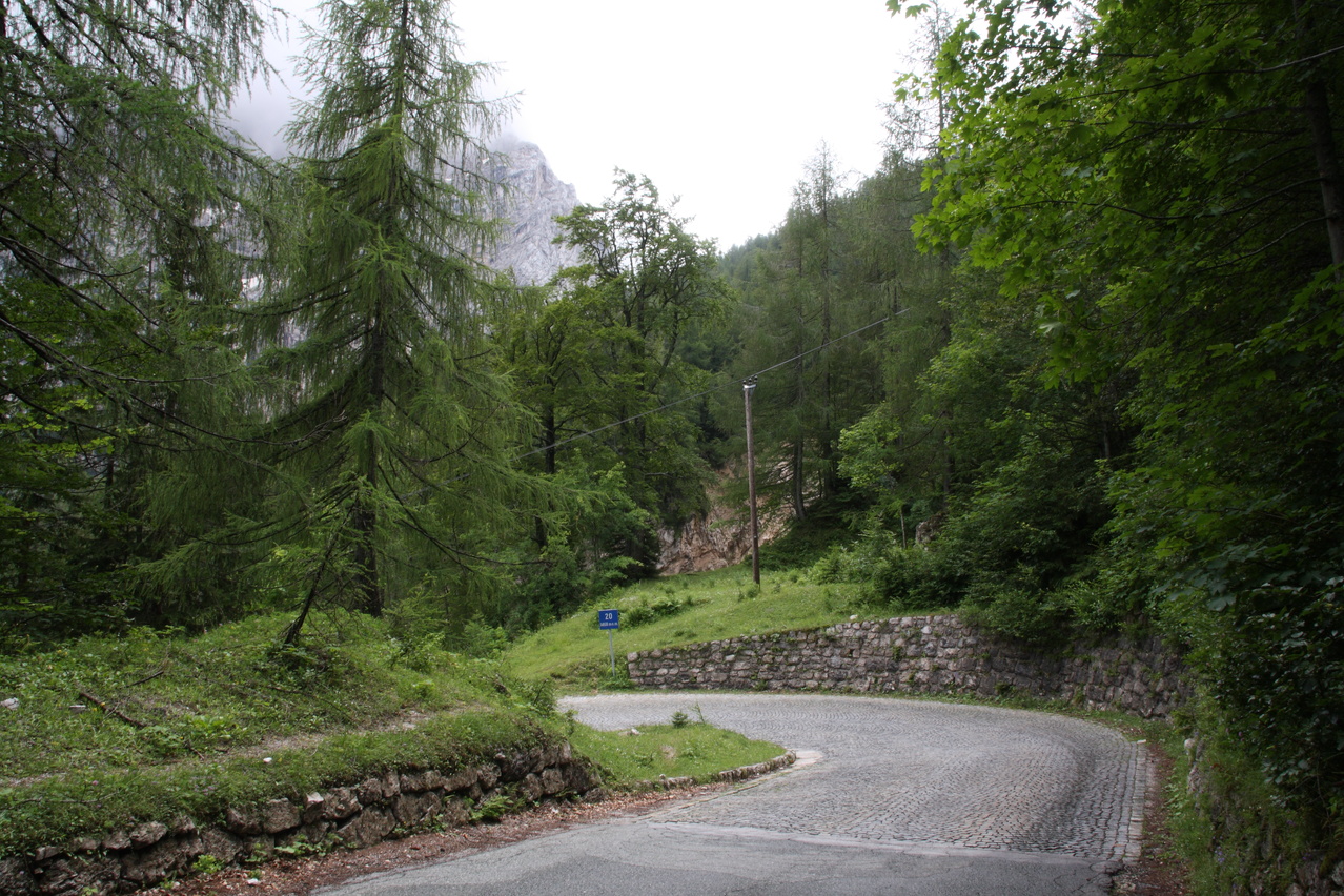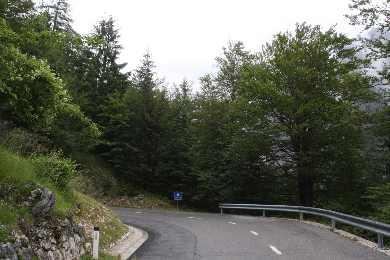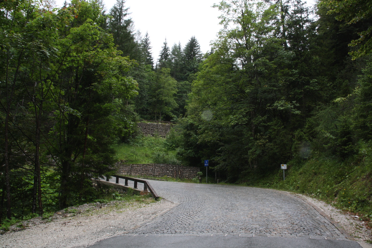 Beschreibung | Mit dem Vršič stand der höchstgelegene befahrbare Pass Sloweniens auf dem Programm. Die Etappe wurde bereits im Regen gestartet und der hielt sich längere Zeit. Die Temperaturen erlaubten die Bergauffahrt nur mit Regenjacke. Erst nach einer Rast in einer Jausenstation an der Nordrampe blieb es bis zur Passhöhe trocken. Dort setzte aber wieder Regen ein. Für die Abfahrt musste "Vollschutz", also Regenhelmüberzieher, Regenjacke, Regenüberhandschuhe, Regenhose und Regengamaschen angelegt werden, um nicht in Folge von Durchnässung auszukühlen. Der Vollschutz konnte erst kurz vor dem Etappenziel wieder abgelegt werden. Die mit dem Regen einhergehende tief liegende Bewölkung verhinderte einen Blick durch das natürliche Fenster im Prisojnik. Die Passstraße über den Vršič enthält 49 durchnummerierte Kehren, wobei die Nummerierung bei der tiefstgelegenen Kehre der Nordrampe beginnt. Die Kehren verteilen sich gleichmäßig über die beiden Rampen, 24 Kehren liegen in der Nordrampe, 25 Kehren in der Südrampe. Die Kehren in der Nordrampe sind im Gegensatz zur ansonsten asphaltierten Straße mit Kopfsteinpflaster ausgelegt, welches sich aber bergauf auch bei Nässe gut befahren lässt. Die Berghütte am Vršič liegt nicht genau auf der Passhöhe, sondern etwa 100 Meter östlich und 9 Meter höher. Der Weg von der Passhöhe zur Berghütte zweigt an der Passhöhe mit einer extrem steilen Rampe ab und verläuft danach als Schotterweg am Hang. Auf diesem Weg wurde sicherheitshalber geschoben, was auch die anderen anwesenden Fahrradfahrer taten. Wegen des schlechten Wetters wurde auf eine Fahrt zur Sočaquelle verzichtet, um die Etappe zeitlich nicht in die Länge zu ziehen, zudem möglicherweise Wolken oder Nebel die Sicht auf die Quelle versperrt hätten. Kurz vor dem Etappenziel fand sich ein Wegweiser zum ersten Pass der folgenden Etappe. In Bovec war das Quartier schwierig zu finden, da an der Hauptstraße kein Wegweiser stand, das Quartier selbst nicht weithin sichtbar als solches zu erkennen war und die Adresse, die sich wie Straßenname und Hausnummer liest, anders zu interpretieren ist. Der "Straßenname" ist nämlich der Name des Ortsteils, in dem die Hausnummern über mehrere Straßen fortlaufend vergeben sind. So wurde unnötigerweise bis ins Zentrum von Bovec gefahren, obwohl das Quartier gleich am östlichen Ortseingang liegt. |
