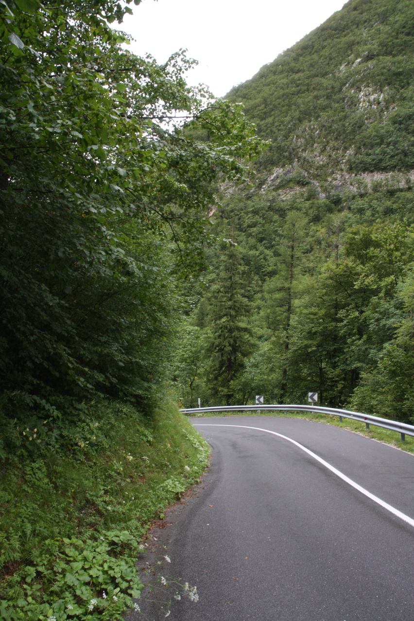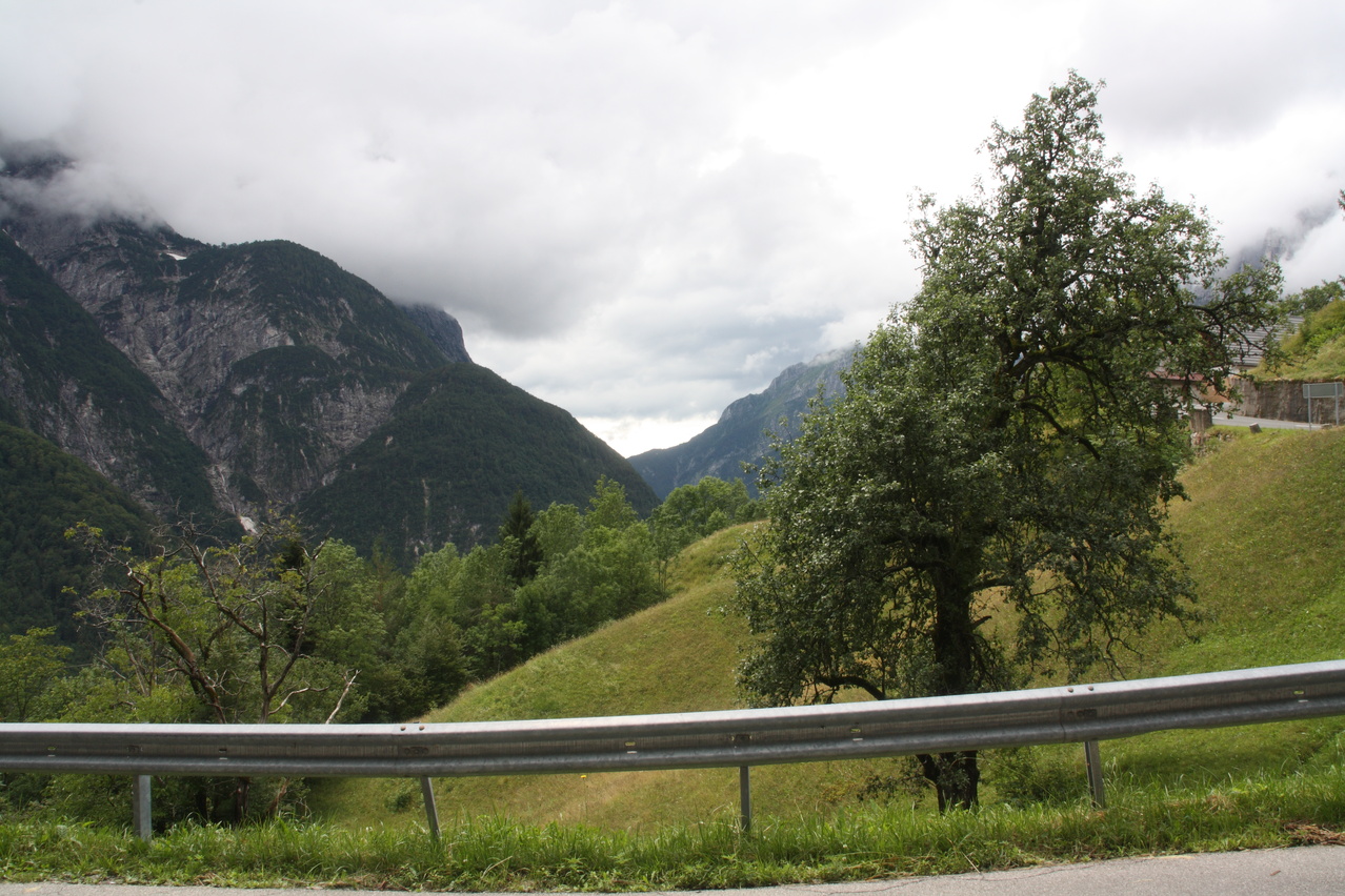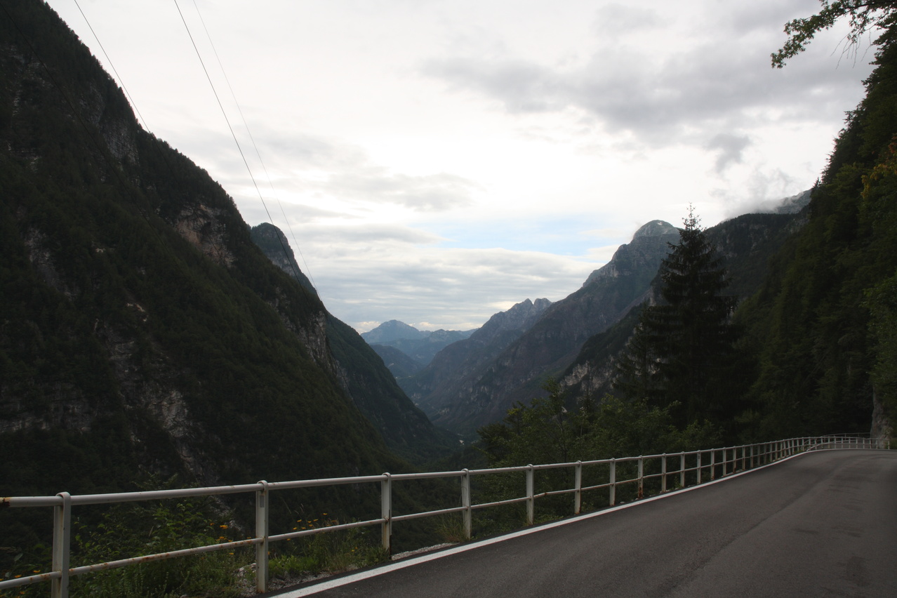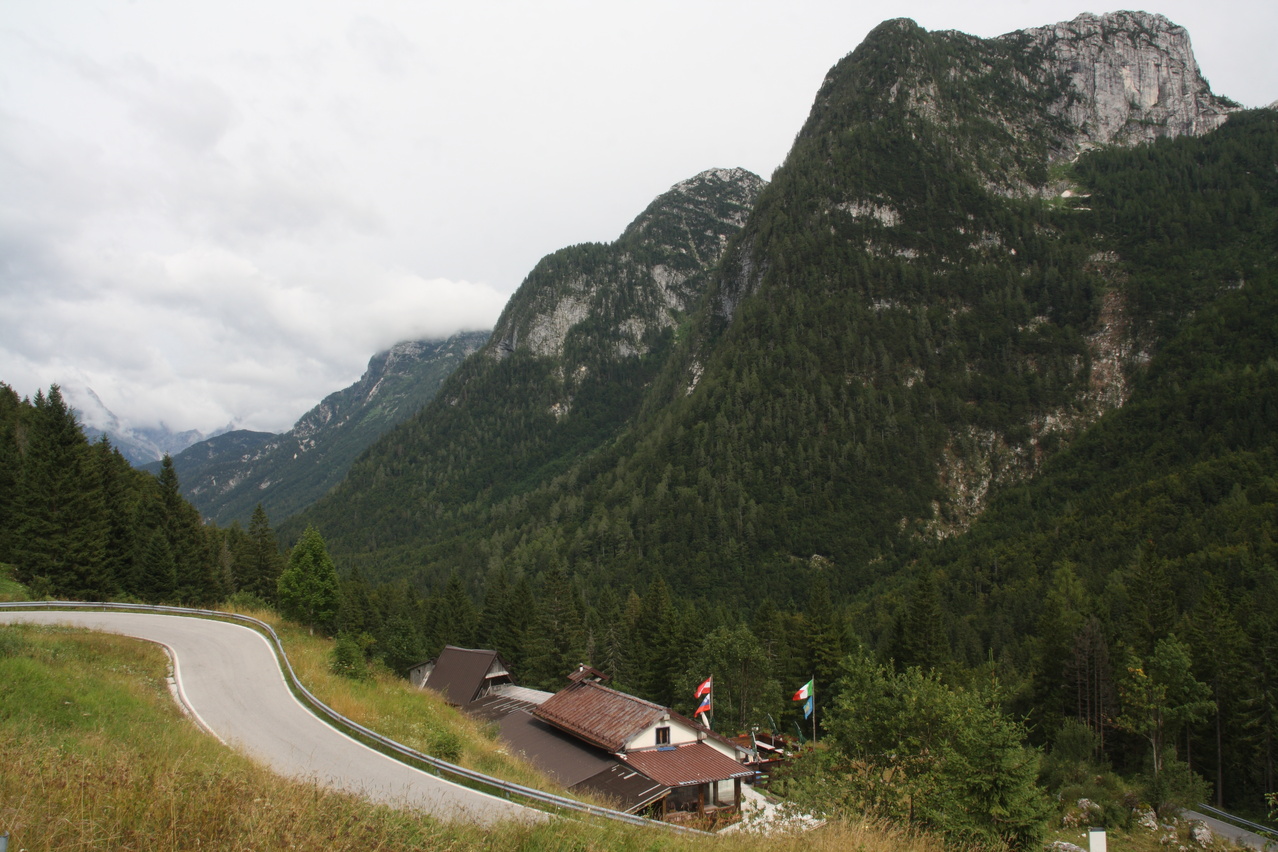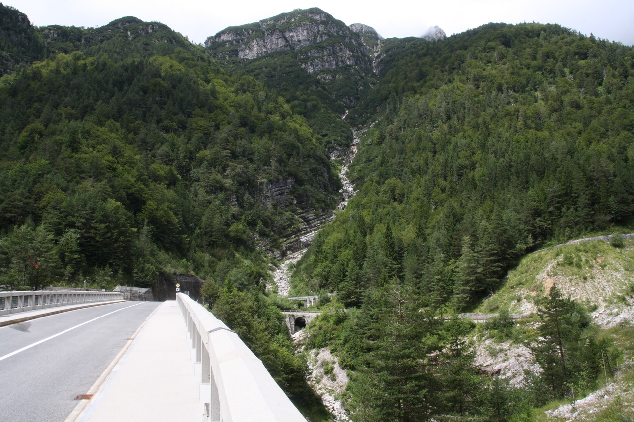 Beschreibung | Mit dieser Etappe stand die Königsetappe an! Sie bot die meisten Höhenmeter bergauf, obwohl alle folgenden Etappen jeweils höher gelegene Orte erreichen sollten. Auch war sie die längste Etappe, was aber nicht beabsichtigt war, sondern auf einen Zahlendreher bei der Planung im Vorfeld zurückzuführen war. Der Start verzögerte sich etwas, da morgens starker Regen fiel. Dem entsprechend war das Wetter auch nicht sonderlich schön. Bis zur Passhöhe des Predel fiel immer wieder etwas Regen. Ab Log pod Mangrtom kam vereinzelt mal die Sonne zwischen den Wolken durch, aber durchweg trocken blieb es erst nach der Überquerung des Predel. Lediglich die Temperaturen bewegten sich im angenehmen Bereich. Die Straße von Bovec zum Predel steigt zunächst nur leicht an und bietet leider auch einige verlorene Höhenmeter. Beeindruckend ist ein Blick von der Brücke über die Koritnica, die dort durch eine tiefe Schlucht fließt. Mitten in Log pod Mangrtom zieht die Steigung fast abrupt merklich an, woran sich bis auf kurze flachere Abschnitte auch bis zur Passhöhe nichts mehr ändert. Die Straße zum Mangrt, die höchste befahrbare Straße Sloweniens, die von der Passstraße abzweigt, wurde nicht gefahren, denn das hätte jeden zeitlichen Rahmen gesprengt. Vor Ort bog auch nur ein Rennradfahrer ohne Gepäck am Fahrrad auf diese Straße ab. Auf der Passhöhe des Predel erfolgte der Grenzübertritt nach Italien. Auch hier ist nichts mehr vom "Eisernen Vorhang" zu sehen. Die Festungsbauwerke an der Passstraße, von denen das am tiefsten gelegene gut erhalten ist und heute noch zivil genutzt wird, die beiden nahe der Passhöhe aber nur noch Ruinen sind, erlebten ihren letzten militärischen Einsatz während des 1. Weltkrieges. Nach der Abfahrt zum Lago del Predil begann der Anstieg zum Sella Nevea, der bis auf einen kürzeren Abschnitt sehr moderat verläuft. Am Straßenrand fanden sich die Reste einer vom im letzten Winter abgegangenen Lawine. Der Schnee der Lawine war trotz der geringen Höhe dieses Ortes noch nicht komplett geschmolzen, während auf der den Schnee bedeckenden Schicht bereits neue Pflanzen wuchsen. Der Sella Nevea ist ein eigenartiger Pass. Die eigentliche "Passhöhe", also der Ort, an dem die Passstraße vom einen ins andere Tal, hier vom Val Rio del Lago ins Val Raccolana, wechselt, ist nicht gekennzeichnet. Westlich dieses Ortes steigt die Passstraße noch einige Meter an, bevor sie zum Ort Sella Nevea abfällt. Auch an diesem Ort findet sich keine Kennzeichnung. Als "Passhöhe" wird häufig das Ortschild am östlichen Ortseingang von Sella Nevea gezeigt, was aber falsch ist, da dieser Punkt bereits auf der Westrampe zum Sella Nevea liegt und auch nicht den höchsten Punkt der Passstraße markiert. Trotz der geringen Höhe des Sella Nevea fällt die Westrampe über zahlreiche Kehren steil ins Val Raccolana ab. Derartige "Serpentinenknäuel" finden sich meist erst im Verlauf deutlich höher gelegener Passstraßen. Hier behindert allerdings der Wald die Sicht auf den Straßenverlauf. Nach der Fahrt durch die Kehrengruppe an der Tallinie angelangt verlief der Rest der Etappe mehr oder weniger flach. Bis Chiusaforte machte sich das geringe Gefälle beim Treten zwar ganz angenehm bemerkbar, aber zum Rollen reichte es nicht mehr. Auf einigen Kilometern bis kurz vor Chiusaforte fielen am Hang oberhalb des Nordufers des Torrente Raccolana größere Flächen mit abgestorbenem Bergwald auf. Ab Chiusaforte wurde auf recht breiten Straßen gefahren, die mit entsprechend Stinkeverkehr belastet waren, dafür aber eine recht hohe Fahrgeschwindigkeit ermöglichten. Diese Straßen bieten rechts am Fahrbahnrand Mehrzweckstreifen, sodass enge Begegnungen mit den Stinkekisten aus blieben. Aufgrund der schon deutlich vorgerückten Tageszeit wurde auf irgendwelche Experimente mit Fahrradwegen konsequent verzichtet. Am südlichsten Punkt dieser Tour zeigte ein Blick nach Süden, dass dort die Alpen bald enden. Trotz der Höhenmeter und der Länge der Etappe wurde das Etappenziel noch vor 21:00 Uhr erreicht und dieses Mal war das Quartier auch leicht zu finden. Die Flüsse Fella und Tagliamento sind noch weitgehend im naturbelassenen Zustand und zeigen, wie früher wohl auch die übrigen, mittlerweile überwiegend stark verbauten Alpenflüsse einmal ausgesehen haben. Uferbefestigungen, die auch gegen Hochwassser schützen, finden sich nur direkt an den Ortschaften und den wenigen Stellen, wo Straßen oder Schienen direkt am Fluss verlaufen. Weitere Hochwasserschutzbauwerke sind im Großen und Ganzen überflüssig, weil die Flüsse genug Platz haben. Dafür fallen die Brücken halt etwas länger aus. |
