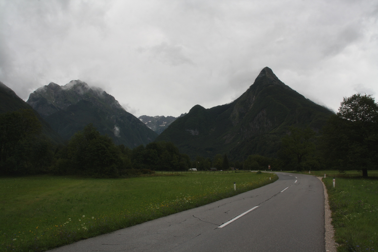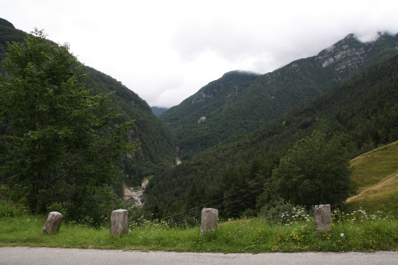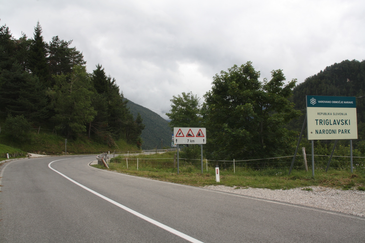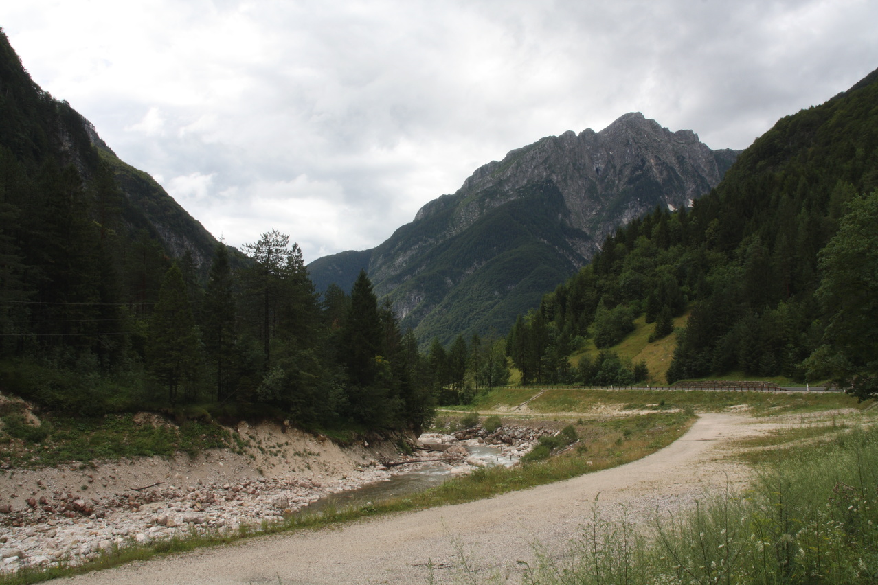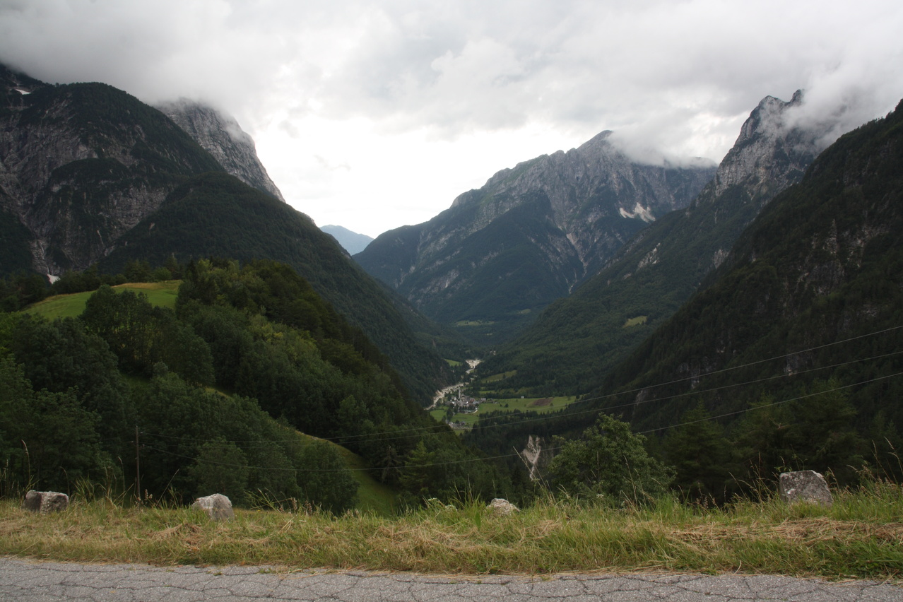 Beschreibung | Mit dieser Etappe stand die Königsetappe an! Sie bot die meisten Höhenmeter bergauf, obwohl alle folgenden Etappen jeweils höher gelegene Orte erreichen sollten. Auch war sie die längste Etappe, was aber nicht beabsichtigt war, sondern auf einen Zahlendreher bei der Planung im Vorfeld zurückzuführen war. Der Start verzögerte sich etwas, da morgens starker Regen fiel. Dem entsprechend war das Wetter auch nicht sonderlich schön. Bis zur Passhöhe des Predel fiel immer wieder etwas Regen. Ab Log pod Mangrtom kam vereinzelt mal die Sonne zwischen den Wolken durch, aber durchweg trocken blieb es erst nach der Überquerung des Predel. Lediglich die Temperaturen bewegten sich im angenehmen Bereich. Die Straße von Bovec zum Predel steigt zunächst nur leicht an und bietet leider auch einige verlorene Höhenmeter. Beeindruckend ist ein Blick von der Brücke über die Koritnica, die dort durch eine tiefe Schlucht fließt. Mitten in Log pod Mangrtom zieht die Steigung fast abrupt merklich an, woran sich bis auf kurze flachere Abschnitte auch bis zur Passhöhe nichts mehr ändert. Die Straße zum Mangrt, die höchste befahrbare Straße Sloweniens, die von der Passstraße abzweigt, wurde nicht gefahren, denn das hätte jeden zeitlichen Rahmen gesprengt. Vor Ort bog auch nur ein Rennradfahrer ohne Gepäck am Fahrrad auf diese Straße ab. Auf der Passhöhe des Predel erfolgte der Grenzübertritt nach Italien. Auch hier ist nichts mehr vom "Eisernen Vorhang" zu sehen. Die Festungsbauwerke an der Passstraße, von denen das am tiefsten gelegene gut erhalten ist und heute noch zivil genutzt wird, die beiden nahe der Passhöhe aber nur noch Ruinen sind, erlebten ihren letzten militärischen Einsatz während des 1. Weltkrieges. Nach der Abfahrt zum Lago del Predil begann der Anstieg zum Sella Nevea, der bis auf einen kürzeren Abschnitt sehr moderat verläuft. Am Straßenrand fanden sich die Reste einer vom im letzten Winter abgegangenen Lawine. Der Schnee der Lawine war trotz der geringen Höhe dieses Ortes noch nicht komplett geschmolzen, während auf der den Schnee bedeckenden Schicht bereits neue Pflanzen wuchsen. Der Sella Nevea ist ein eigenartiger Pass. Die eigentliche "Passhöhe", also der Ort, an dem die Passstraße vom einen ins andere Tal, hier vom Val Rio del Lago ins Val Raccolana, wechselt, ist nicht gekennzeichnet. Westlich dieses Ortes steigt die Passstraße noch einige Meter an, bevor sie zum Ort Sella Nevea abfällt. Auch an diesem Ort findet sich keine Kennzeichnung. Als "Passhöhe" wird häufig das Ortschild am östlichen Ortseingang von Sella Nevea gezeigt, was aber falsch ist, da dieser Punkt bereits auf der Westrampe zum Sella Nevea liegt und auch nicht den höchsten Punkt der Passstraße markiert. Trotz der geringen Höhe des Sella Nevea fällt die Westrampe über zahlreiche Kehren steil ins Val Raccolana ab. Derartige "Serpentinenknäuel" finden sich meist erst im Verlauf deutlich höher gelegener Passstraßen. Hier behindert allerdings der Wald die Sicht auf den Straßenverlauf. Nach der Fahrt durch die Kehrengruppe an der Tallinie angelangt verlief der Rest der Etappe mehr oder weniger flach. Bis Chiusaforte machte sich das geringe Gefälle beim Treten zwar ganz angenehm bemerkbar, aber zum Rollen reichte es nicht mehr. Auf einigen Kilometern bis kurz vor Chiusaforte fielen am Hang oberhalb des Nordufers des Torrente Raccolana größere Flächen mit abgestorbenem Bergwald auf. Ab Chiusaforte wurde auf recht breiten Straßen gefahren, die mit entsprechend Stinkeverkehr belastet waren, dafür aber eine recht hohe Fahrgeschwindigkeit ermöglichten. Diese Straßen bieten rechts am Fahrbahnrand Mehrzweckstreifen, sodass enge Begegnungen mit den Stinkekisten aus blieben. Aufgrund der schon deutlich vorgerückten Tageszeit wurde auf irgendwelche Experimente mit Fahrradwegen konsequent verzichtet. Am südlichsten Punkt dieser Tour zeigte ein Blick nach Süden, dass dort die Alpen bald enden. Trotz der Höhenmeter und der Länge der Etappe wurde das Etappenziel noch vor 21:00 Uhr erreicht und dieses Mal war das Quartier auch leicht zu finden. Die Flüsse Fella und Tagliamento sind noch weitgehend im naturbelassenen Zustand und zeigen, wie früher wohl auch die übrigen, mittlerweile überwiegend stark verbauten Alpenflüsse einmal ausgesehen haben. Uferbefestigungen, die auch gegen Hochwassser schützen, finden sich nur direkt an den Ortschaften und den wenigen Stellen, wo Straßen oder Schienen direkt am Fluss verlaufen. Weitere Hochwasserschutzbauwerke sind im Großen und Ganzen überflüssig, weil die Flüsse genug Platz haben. Dafür fallen die Brücken halt etwas länger aus. |