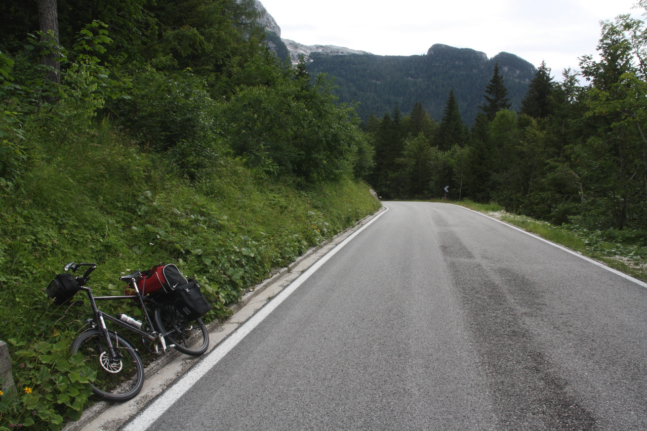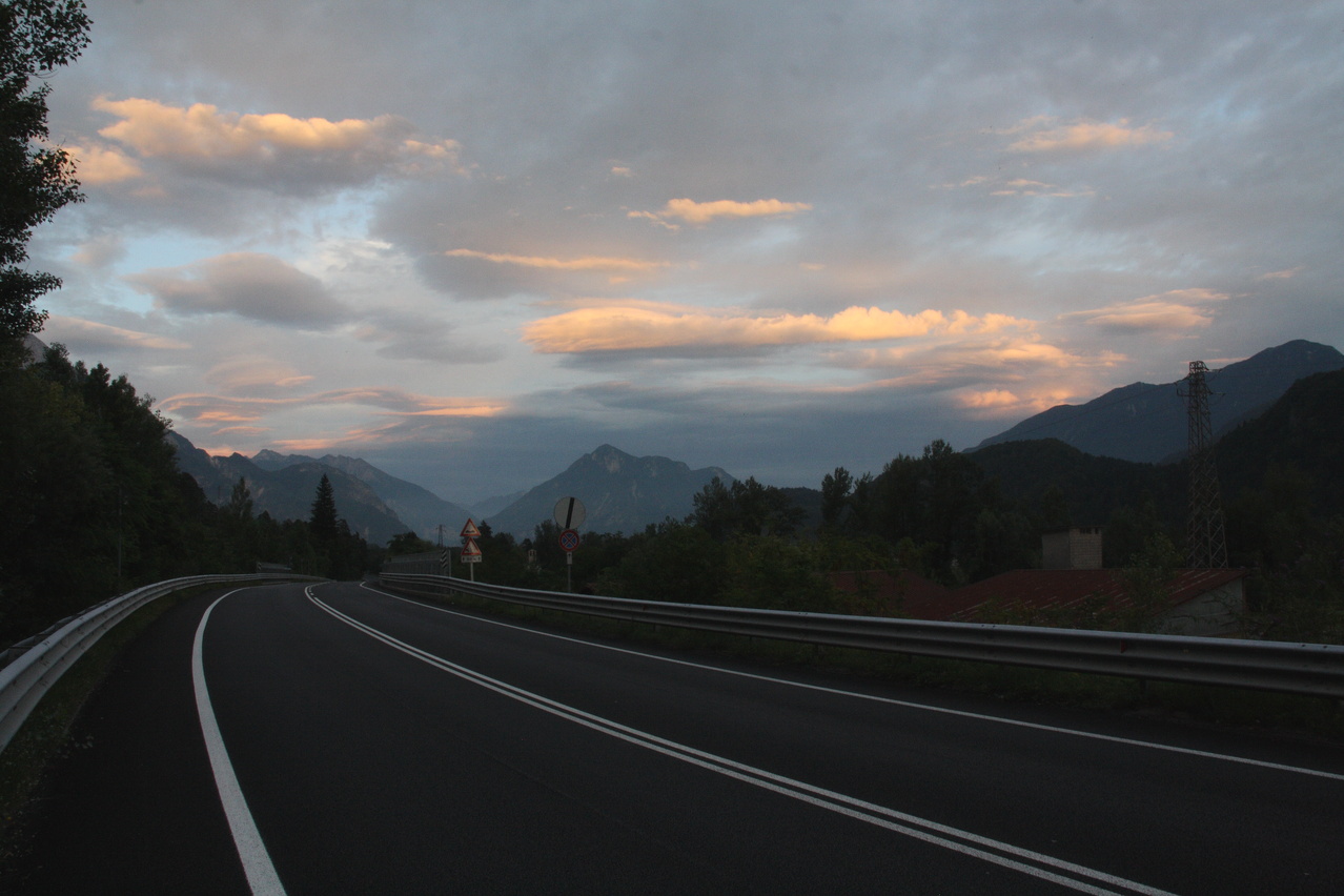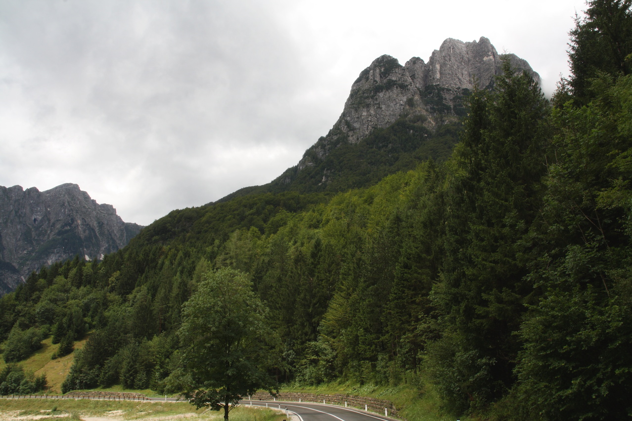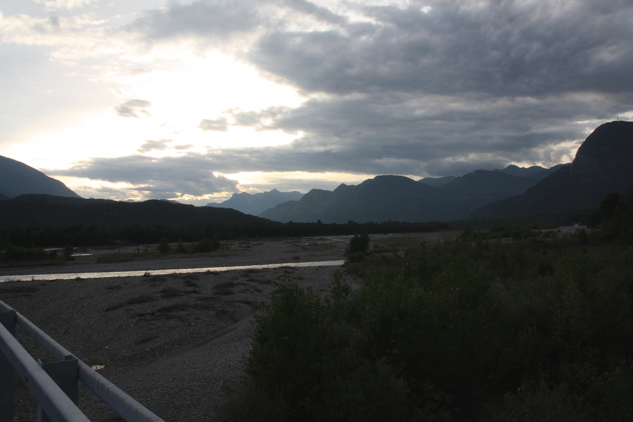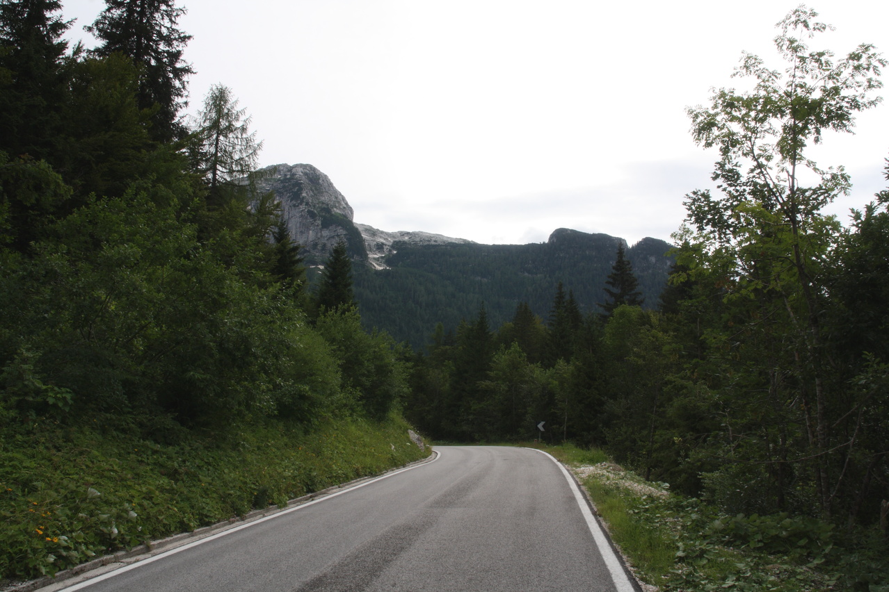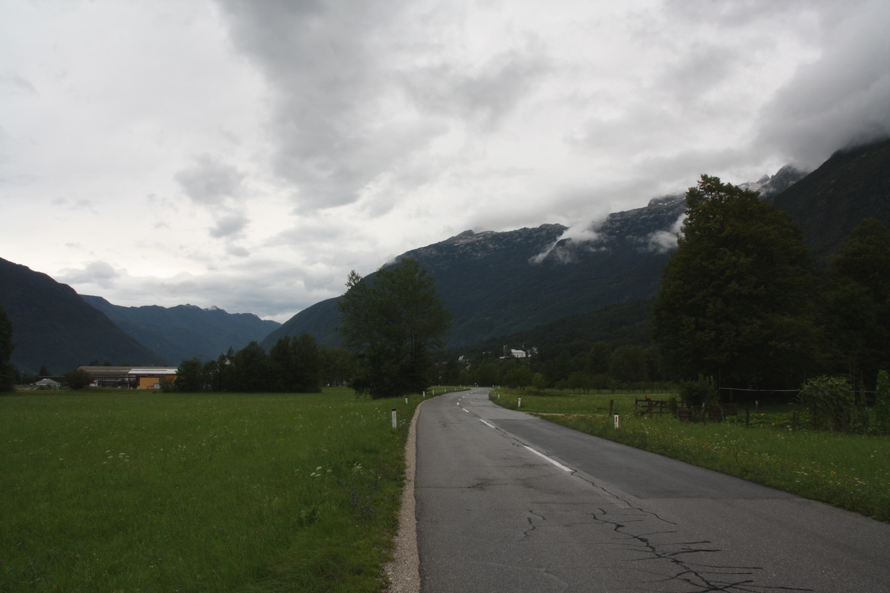 Beschreibung | Mit dieser Etappe stand die Königsetappe an! Sie bot die meisten Höhenmeter bergauf, obwohl alle folgenden Etappen jeweils höher gelegene Orte erreichen sollten. Auch war sie die längste Etappe, was aber nicht beabsichtigt war, sondern auf einen Zahlendreher bei der Planung im Vorfeld zurückzuführen war. Der Start verzögerte sich etwas, da morgens starker Regen fiel. Dem entsprechend war das Wetter auch nicht sonderlich schön. Bis zur Passhöhe des Predel fiel immer wieder etwas Regen. Ab Log pod Mangrtom kam vereinzelt mal die Sonne zwischen den Wolken durch, aber durchweg trocken blieb es erst nach der Überquerung des Predel. Lediglich die Temperaturen bewegten sich im angenehmen Bereich. Die Straße von Bovec zum Predel steigt zunächst nur leicht an und bietet leider auch einige verlorene Höhenmeter. Beeindruckend ist ein Blick von der Brücke über die Koritnica, die dort durch eine tiefe Schlucht fließt. Mitten in Log pod Mangrtom zieht die Steigung fast abrupt merklich an, woran sich bis auf kurze flachere Abschnitte auch bis zur Passhöhe nichts mehr ändert. Die Straße zum Mangrt, die höchste befahrbare Straße Sloweniens, die von der Passstraße abzweigt, wurde nicht gefahren, denn das hätte jeden zeitlichen Rahmen gesprengt. Vor Ort bog auch nur ein Rennradfahrer ohne Gepäck am Fahrrad auf diese Straße ab. Auf der Passhöhe des Predel erfolgte der Grenzübertritt nach Italien. Auch hier ist nichts mehr vom "Eisernen Vorhang" zu sehen. Die Festungsbauwerke an der Passstraße, von denen das am tiefsten gelegene gut erhalten ist und heute noch zivil genutzt wird, die beiden nahe der Passhöhe aber nur noch Ruinen sind, erlebten ihren letzten militärischen Einsatz während des 1. Weltkrieges. Nach der Abfahrt zum Lago del Predil begann der Anstieg zum Sella Nevea, der bis auf einen kürzeren Abschnitt sehr moderat verläuft. Am Straßenrand fanden sich die Reste einer vom im letzten Winter abgegangenen Lawine. Der Schnee der Lawine war trotz der geringen Höhe dieses Ortes noch nicht komplett geschmolzen, während auf der den Schnee bedeckenden Schicht bereits neue Pflanzen wuchsen. Der Sella Nevea ist ein eigenartiger Pass. Die eigentliche "Passhöhe", also der Ort, an dem die Passstraße vom einen ins andere Tal, hier vom Val Rio del Lago ins Val Raccolana, wechselt, ist nicht gekennzeichnet. Westlich dieses Ortes steigt die Passstraße noch einige Meter an, bevor sie zum Ort Sella Nevea abfällt. Auch an diesem Ort findet sich keine Kennzeichnung. Als "Passhöhe" wird häufig das Ortschild am östlichen Ortseingang von Sella Nevea gezeigt, was aber falsch ist, da dieser Punkt bereits auf der Westrampe zum Sella Nevea liegt und auch nicht den höchsten Punkt der Passstraße markiert. Trotz der geringen Höhe des Sella Nevea fällt die Westrampe über zahlreiche Kehren steil ins Val Raccolana ab. Derartige "Serpentinenknäuel" finden sich meist erst im Verlauf deutlich höher gelegener Passstraßen. Hier behindert allerdings der Wald die Sicht auf den Straßenverlauf. Nach der Fahrt durch die Kehrengruppe an der Tallinie angelangt verlief der Rest der Etappe mehr oder weniger flach. Bis Chiusaforte machte sich das geringe Gefälle beim Treten zwar ganz angenehm bemerkbar, aber zum Rollen reichte es nicht mehr. Auf einigen Kilometern bis kurz vor Chiusaforte fielen am Hang oberhalb des Nordufers des Torrente Raccolana größere Flächen mit abgestorbenem Bergwald auf. Ab Chiusaforte wurde auf recht breiten Straßen gefahren, die mit entsprechend Stinkeverkehr belastet waren, dafür aber eine recht hohe Fahrgeschwindigkeit ermöglichten. Diese Straßen bieten rechts am Fahrbahnrand Mehrzweckstreifen, sodass enge Begegnungen mit den Stinkekisten aus blieben. Aufgrund der schon deutlich vorgerückten Tageszeit wurde auf irgendwelche Experimente mit Fahrradwegen konsequent verzichtet. Am südlichsten Punkt dieser Tour zeigte ein Blick nach Süden, dass dort die Alpen bald enden. Trotz der Höhenmeter und der Länge der Etappe wurde das Etappenziel noch vor 21:00 Uhr erreicht und dieses Mal war das Quartier auch leicht zu finden. Die Flüsse Fella und Tagliamento sind noch weitgehend im naturbelassenen Zustand und zeigen, wie früher wohl auch die übrigen, mittlerweile überwiegend stark verbauten Alpenflüsse einmal ausgesehen haben. Uferbefestigungen, die auch gegen Hochwassser schützen, finden sich nur direkt an den Ortschaften und den wenigen Stellen, wo Straßen oder Schienen direkt am Fluss verlaufen. Weitere Hochwasserschutzbauwerke sind im Großen und Ganzen überflüssig, weil die Flüsse genug Platz haben. Dafür fallen die Brücken halt etwas länger aus. |