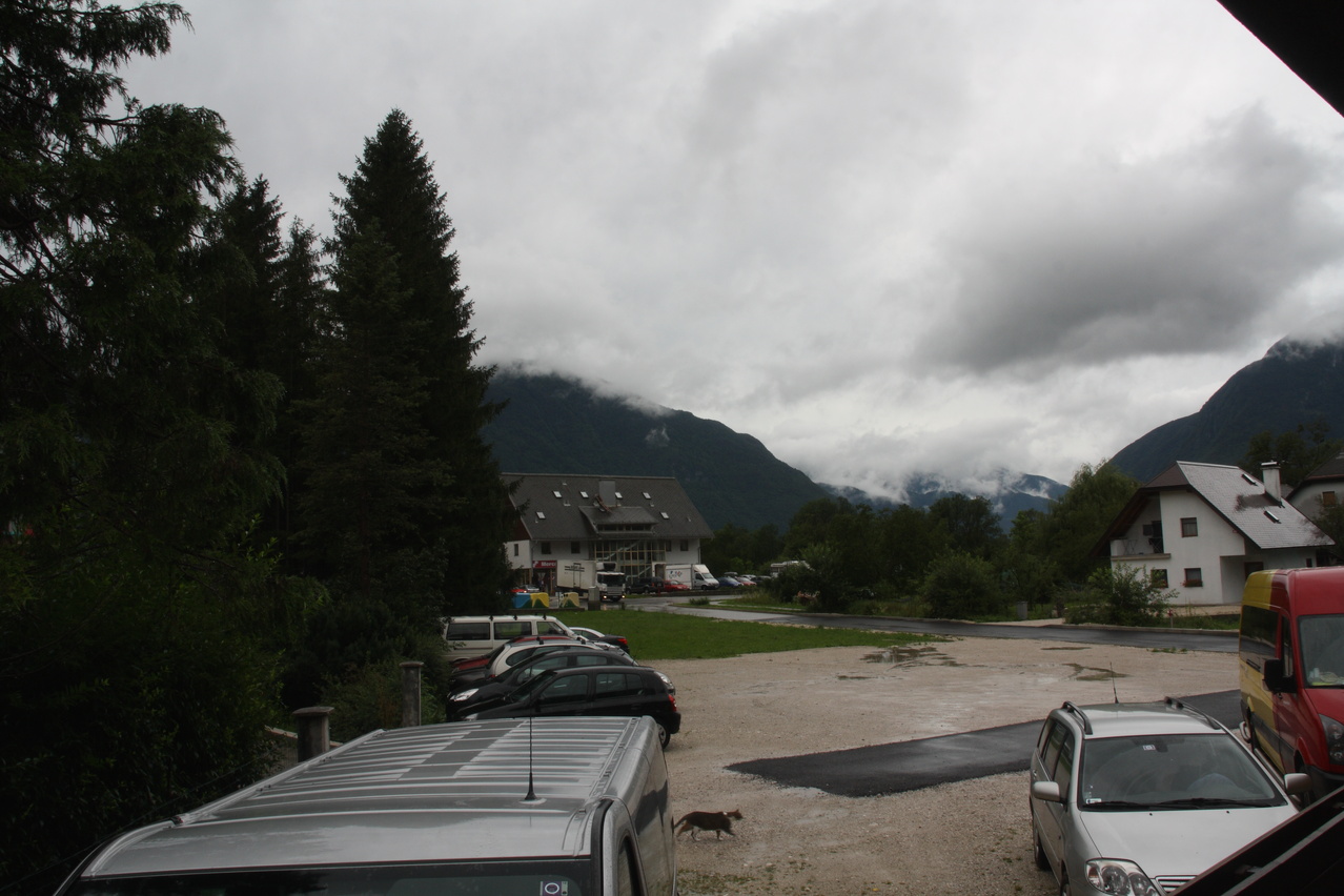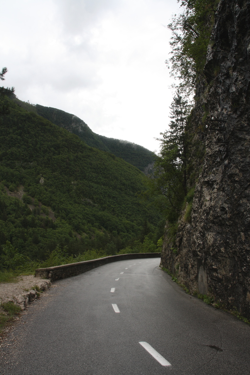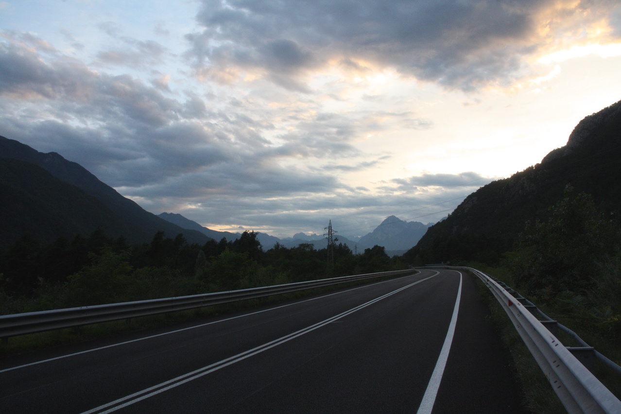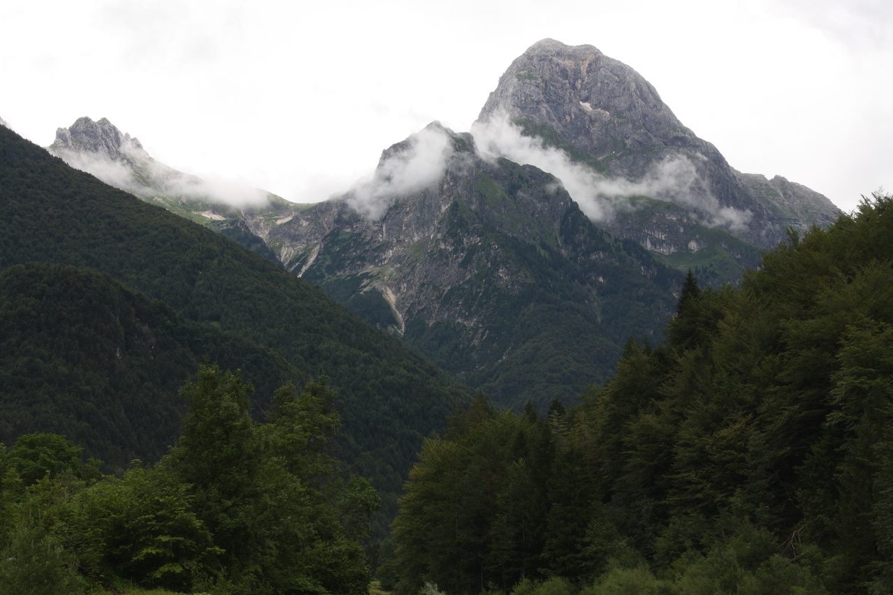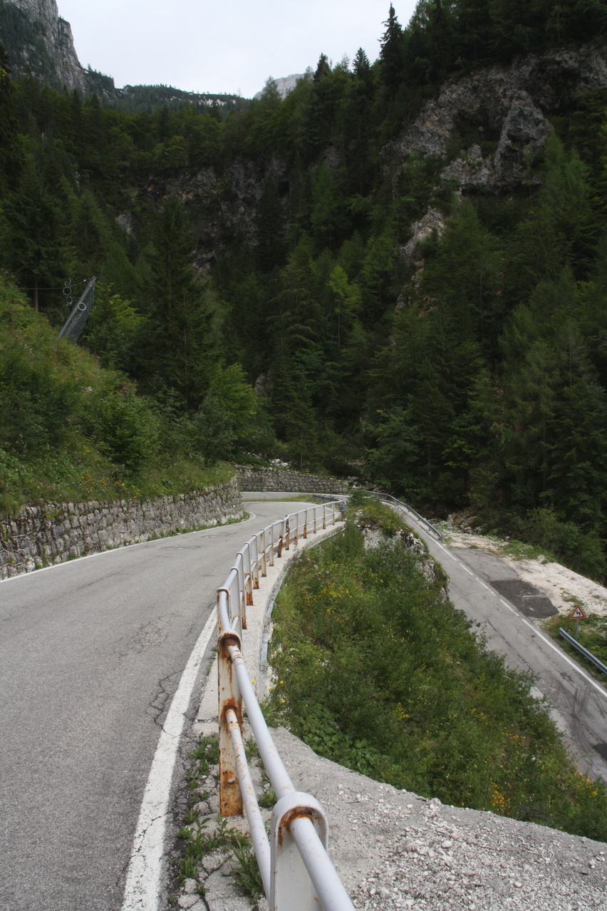 Beschreibung | Mit dieser Etappe stand die Königsetappe an! Sie bot die meisten Höhenmeter bergauf, obwohl alle folgenden Etappen jeweils höher gelegene Orte erreichen sollten. Auch war sie die längste Etappe, was aber nicht beabsichtigt war, sondern auf einen Zahlendreher bei der Planung im Vorfeld zurückzuführen war. Der Start verzögerte sich etwas, da morgens starker Regen fiel. Dem entsprechend war das Wetter auch nicht sonderlich schön. Bis zur Passhöhe des Predel fiel immer wieder etwas Regen. Ab Log pod Mangrtom kam vereinzelt mal die Sonne zwischen den Wolken durch, aber durchweg trocken blieb es erst nach der Überquerung des Predel. Lediglich die Temperaturen bewegten sich im angenehmen Bereich. Die Straße von Bovec zum Predel steigt zunächst nur leicht an und bietet leider auch einige verlorene Höhenmeter. Beeindruckend ist ein Blick von der Brücke über die Koritnica, die dort durch eine tiefe Schlucht fließt. Mitten in Log pod Mangrtom zieht die Steigung fast abrupt merklich an, woran sich bis auf kurze flachere Abschnitte auch bis zur Passhöhe nichts mehr ändert. Die Straße zum Mangrt, die höchste befahrbare Straße Sloweniens, die von der Passstraße abzweigt, wurde nicht gefahren, denn das hätte jeden zeitlichen Rahmen gesprengt. Vor Ort bog auch nur ein Rennradfahrer ohne Gepäck am Fahrrad auf diese Straße ab. Auf der Passhöhe des Predel erfolgte der Grenzübertritt nach Italien. Auch hier ist nichts mehr vom "Eisernen Vorhang" zu sehen. Die Festungsbauwerke an der Passstraße, von denen das am tiefsten gelegene gut erhalten ist und heute noch zivil genutzt wird, die beiden nahe der Passhöhe aber nur noch Ruinen sind, erlebten ihren letzten militärischen Einsatz während des 1. Weltkrieges. Nach der Abfahrt zum Lago del Predil begann der Anstieg zum Sella Nevea, der bis auf einen kürzeren Abschnitt sehr moderat verläuft. Am Straßenrand fanden sich die Reste einer vom im letzten Winter abgegangenen Lawine. Der Schnee der Lawine war trotz der geringen Höhe dieses Ortes noch nicht komplett geschmolzen, während auf der den Schnee bedeckenden Schicht bereits neue Pflanzen wuchsen. Der Sella Nevea ist ein eigenartiger Pass. Die eigentliche "Passhöhe", also der Ort, an dem die Passstraße vom einen ins andere Tal, hier vom Val Rio del Lago ins Val Raccolana, wechselt, ist nicht gekennzeichnet. Westlich dieses Ortes steigt die Passstraße noch einige Meter an, bevor sie zum Ort Sella Nevea abfällt. Auch an diesem Ort findet sich keine Kennzeichnung. Als "Passhöhe" wird häufig das Ortschild am östlichen Ortseingang von Sella Nevea gezeigt, was aber falsch ist, da dieser Punkt bereits auf der Westrampe zum Sella Nevea liegt und auch nicht den höchsten Punkt der Passstraße markiert. Trotz der geringen Höhe des Sella Nevea fällt die Westrampe über zahlreiche Kehren steil ins Val Raccolana ab. Derartige "Serpentinenknäuel" finden sich meist erst im Verlauf deutlich höher gelegener Passstraßen. Hier behindert allerdings der Wald die Sicht auf den Straßenverlauf. Nach der Fahrt durch die Kehrengruppe an der Tallinie angelangt verlief der Rest der Etappe mehr oder weniger flach. Bis Chiusaforte machte sich das geringe Gefälle beim Treten zwar ganz angenehm bemerkbar, aber zum Rollen reichte es nicht mehr. Auf einigen Kilometern bis kurz vor Chiusaforte fielen am Hang oberhalb des Nordufers des Torrente Raccolana größere Flächen mit abgestorbenem Bergwald auf. Ab Chiusaforte wurde auf recht breiten Straßen gefahren, die mit entsprechend Stinkeverkehr belastet waren, dafür aber eine recht hohe Fahrgeschwindigkeit ermöglichten. Diese Straßen bieten rechts am Fahrbahnrand Mehrzweckstreifen, sodass enge Begegnungen mit den Stinkekisten aus blieben. Aufgrund der schon deutlich vorgerückten Tageszeit wurde auf irgendwelche Experimente mit Fahrradwegen konsequent verzichtet. Am südlichsten Punkt dieser Tour zeigte ein Blick nach Süden, dass dort die Alpen bald enden. Trotz der Höhenmeter und der Länge der Etappe wurde das Etappenziel noch vor 21:00 Uhr erreicht und dieses Mal war das Quartier auch leicht zu finden. Die Flüsse Fella und Tagliamento sind noch weitgehend im naturbelassenen Zustand und zeigen, wie früher wohl auch die übrigen, mittlerweile überwiegend stark verbauten Alpenflüsse einmal ausgesehen haben. Uferbefestigungen, die auch gegen Hochwassser schützen, finden sich nur direkt an den Ortschaften und den wenigen Stellen, wo Straßen oder Schienen direkt am Fluss verlaufen. Weitere Hochwasserschutzbauwerke sind im Großen und Ganzen überflüssig, weil die Flüsse genug Platz haben. Dafür fallen die Brücken halt etwas länger aus. |