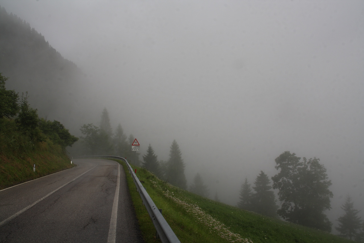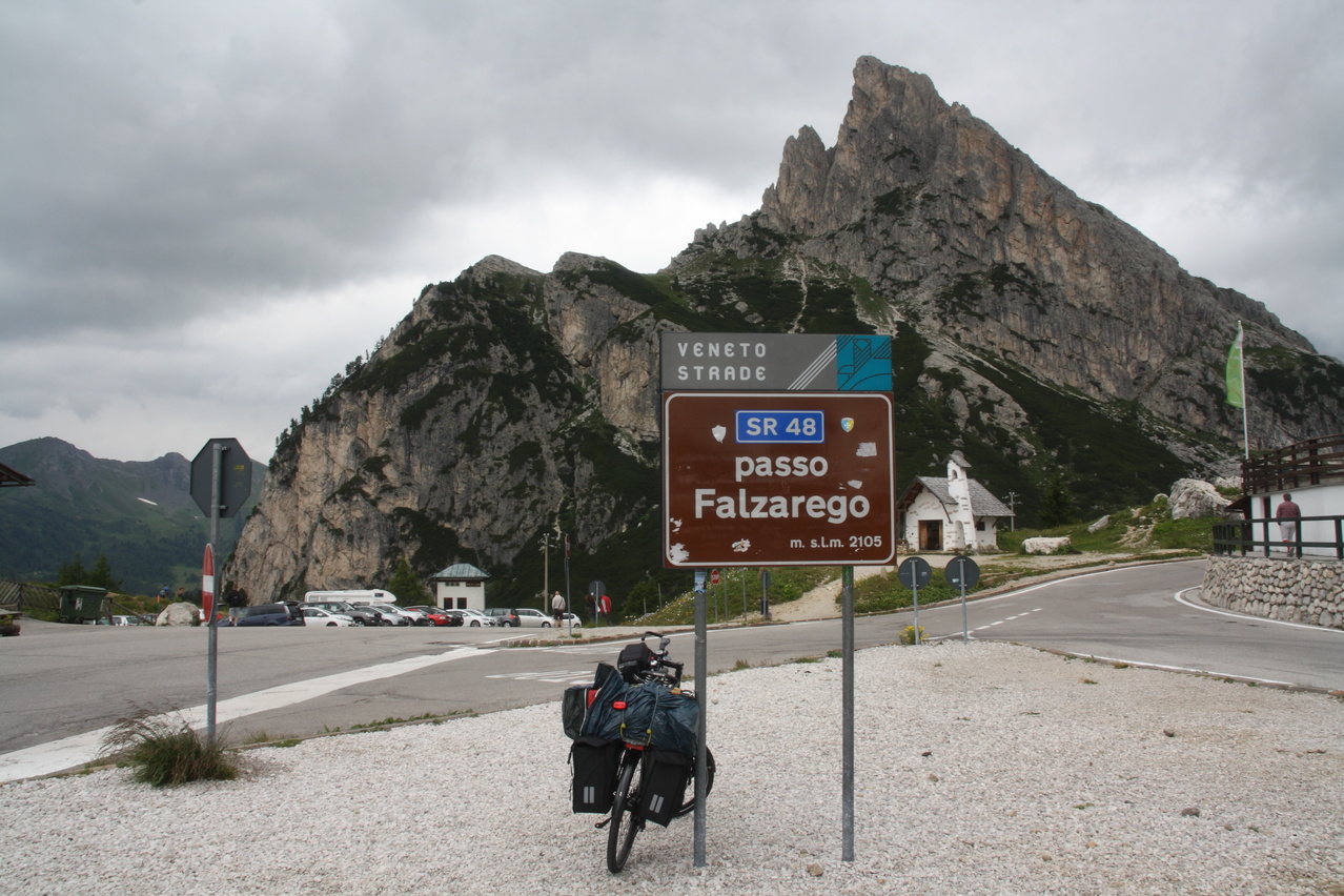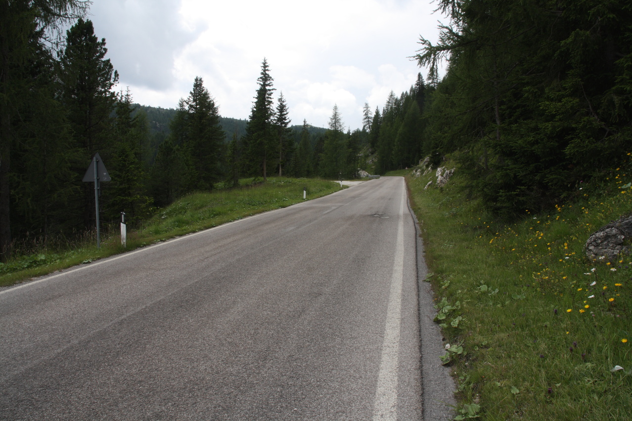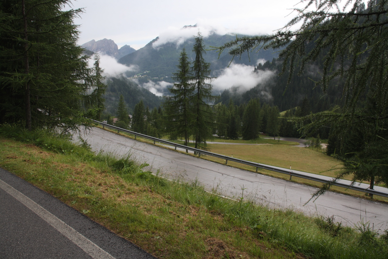 Beschreibung | Inverse Streckenwiederholung! Die Strecke dieser Etappe war in der Gegenrichtung bereits am 30.07.2010 gefahren worden. Anders als bei der Alpentour 2010, bei der noch höher gelegene Pässe überquert worden waren, war der Passo di Falzarego dieses Mal das "Dach der Tour". Eine Alternative wäre der höhere Passo di Giau gewesen, aber der ist vom Streckenprofil her für mit Mehrtagesgepäck beladene Fahrräder wenig geeignet. Wie schon die die beiden Etappen an den beiden Tagen zuvor wurde auch diese Etappe bei sonnigem Wetter gestartet. Aber wie schon an den beiden Tagen zuvor wurde auch an diesem Tag die Hoffnung auf eine trockene Etappe jäh enttäuscht. Wenigstens blieb es bis zur Passhöhe trocken. Dort setzte dann aber bald nach der Ankunft starker Regen ein, dessen Ende nicht absehbar war, weshalb die Abfahrt in "Vollschutz" in Angriff genommen wurde. Von Cortina d'Ampezzo aus geht es gleich stramm bergauf auf der Ostrampe, die bis Pocol auch Ostrampe des Passo di Giau ist. Strecke zum Einrollen gibt es nicht. Ab Pocol verläuft die Ostrampe flacher, zieht sich dafür aber in die Länge. Dieser Eindruck wird durch längere fast gerade Streckenabschnitte noch verstärkt. Kehren, die das Ganze etwas auflockern würden, sind auf der Ostrampe rar gesät Die Westrampe ist im oberen Bereich sehr viel interessanter trassiert. Zahlreiche Kehren und sogar Kehrtunnel sorgen für Abwechslung. Die Sicherung gegen den Abrund fällt mitunter etwas knapp aus und fehlt an einigen Stellen gänzlich. Nach der etwas langatmigen Auffahrt wurde die Abfahrt durch den Regen unerwartet anstrengend. Auf der nassen Straße musste sehr vorsichtig und entsprechend langsam gefahren werden, um die Wirkung der Sicherungen gegen den Abgrund oder den Abgrund selbst nicht "erfahren" zu müssen. Wegen des Regens konnten auch kaum Bilder geschossen werden, Bergpanorama gab es zudem auch nicht. Im unteren Bereich der Westrampe unterwegs endete endlich der Regen, und, nachdem die Sonne auch die klamme Luft vertrieben hatte, konnte der Vollschutz oberhalb von Caprile abgelegt werden. Das Quartier, das bereits bei der Alpentour 2010 genutzt worden war, war bei dieser Fahrtrichtung sehr ungünstig gelegen, denn bis dahin waren noch mal 200 Höhenmeter bergauf zu überwinden. Im Vorfeld der Tour war aber in den Talorten Caprile und Saviner di Laste einfach kein Quartier zu bekommen. Das ist auch nicht verwunderlich, denn dort gibt es erstaunlich wenig touristische Infrastruktur. Das ist sehr seltsam, denn von diesen Talorten aus können fünf(!) Pässe, von West nach Ost Passo di Fedaia, Passo Pordoi, Passo di Campolongo, Passo di Falzarego und Passo di Giau, direkt angefahren werden. Bei der Fahrt zum Quartier passierte es dann, der Freilauf versagte. ☹ Was auch immer die da in Warmbad Villach bei der 01. Etappe eingebaut haben, robust war das nicht. Das Quartier konnte dennoch fahrend erreicht werden, denn bergauf ging das auch ohne Freilauf. |