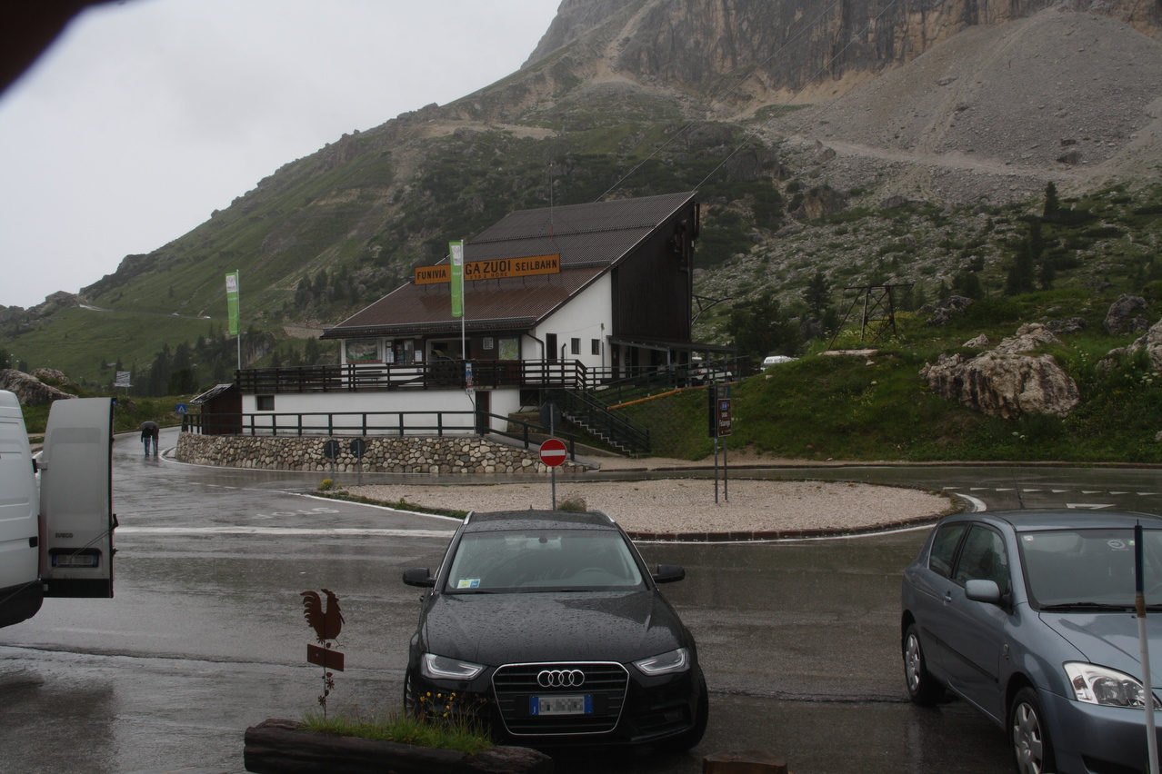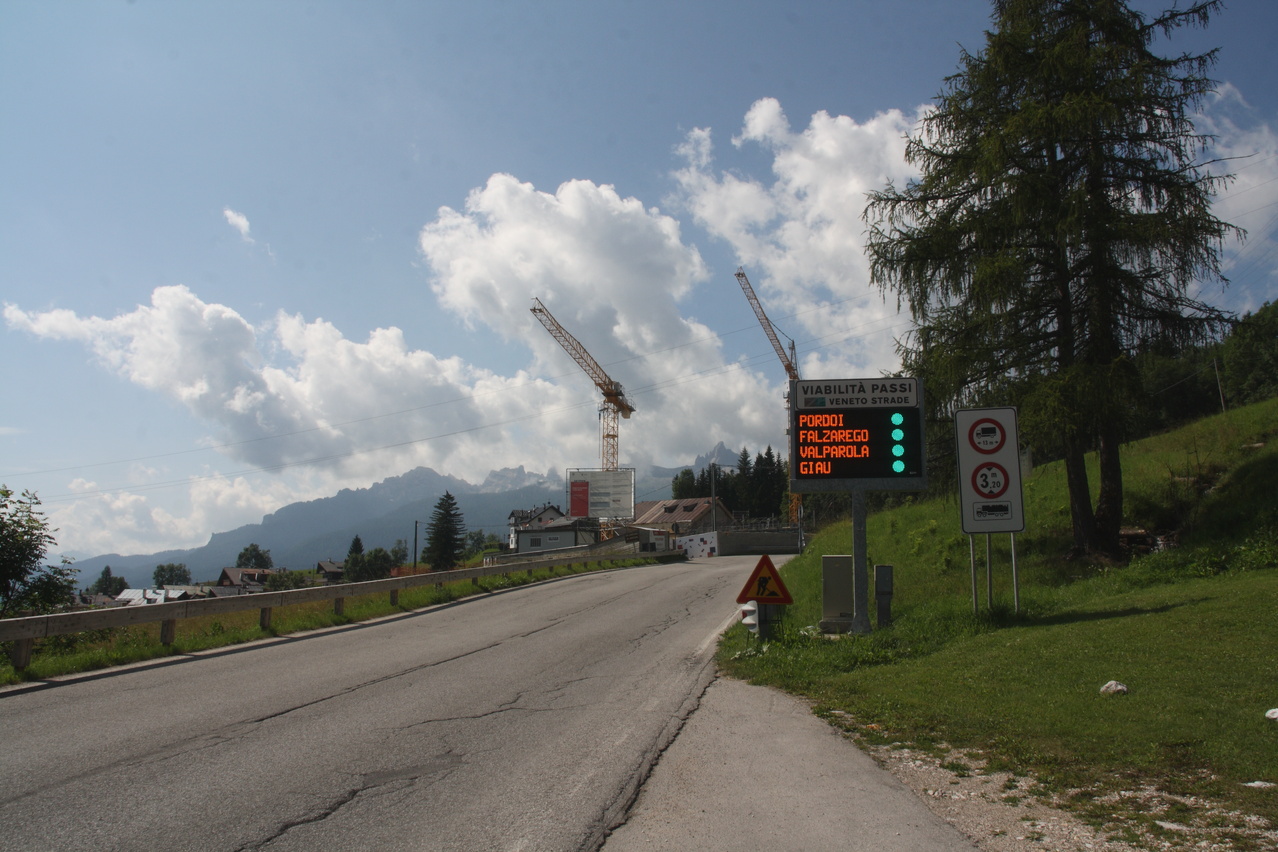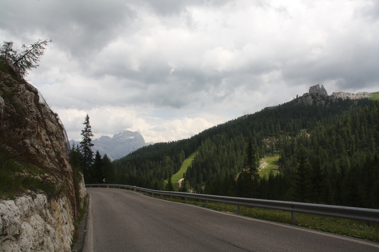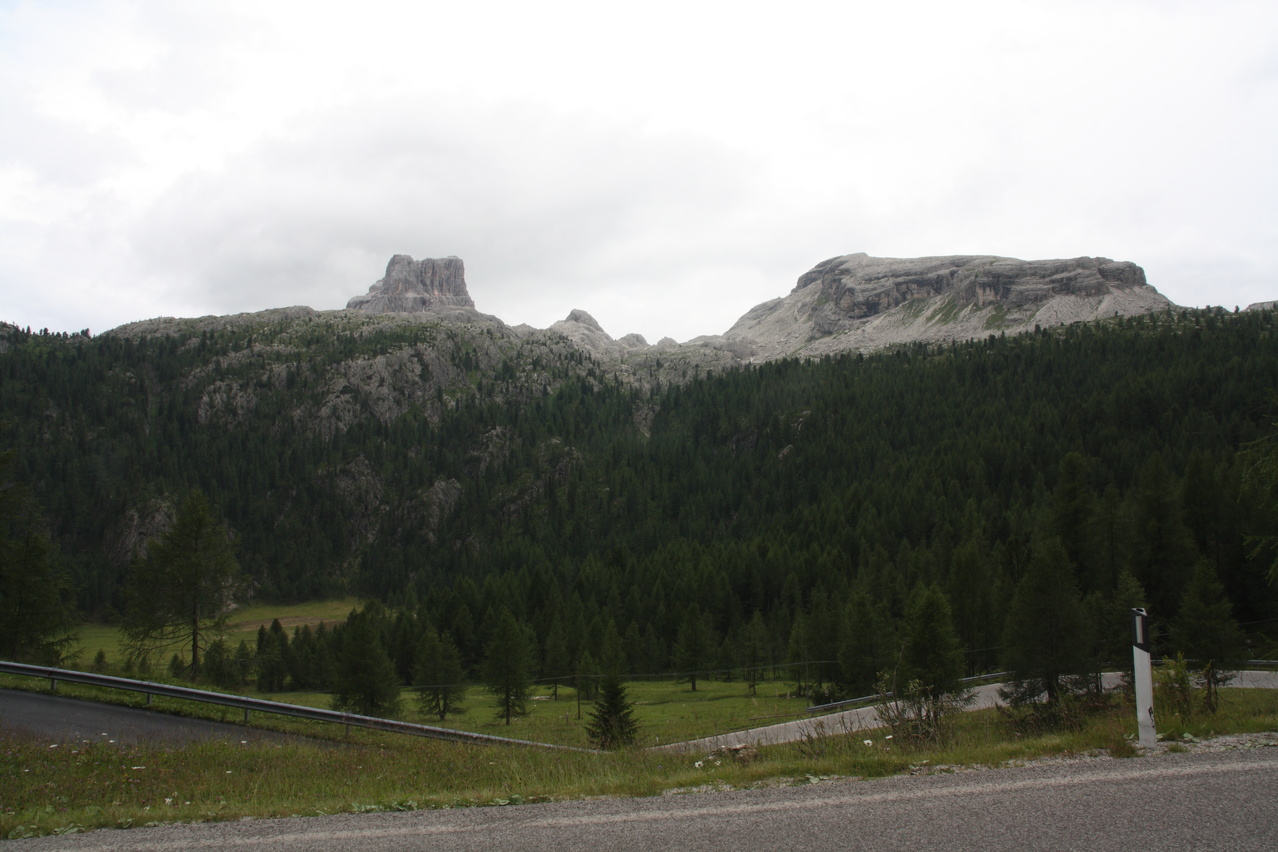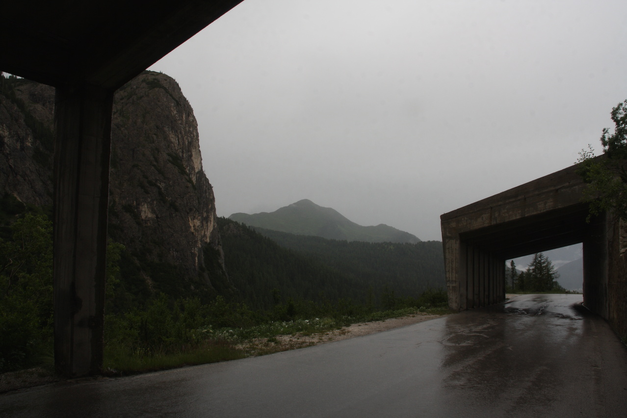 Beschreibung | Inverse Streckenwiederholung! Die Strecke dieser Etappe war in der Gegenrichtung bereits am 30.07.2010 gefahren worden. Anders als bei der Alpentour 2010, bei der noch höher gelegene Pässe überquert worden waren, war der Passo di Falzarego dieses Mal das "Dach der Tour". Eine Alternative wäre der höhere Passo di Giau gewesen, aber der ist vom Streckenprofil her für mit Mehrtagesgepäck beladene Fahrräder wenig geeignet. Wie schon die die beiden Etappen an den beiden Tagen zuvor wurde auch diese Etappe bei sonnigem Wetter gestartet. Aber wie schon an den beiden Tagen zuvor wurde auch an diesem Tag die Hoffnung auf eine trockene Etappe jäh enttäuscht. Wenigstens blieb es bis zur Passhöhe trocken. Dort setzte dann aber bald nach der Ankunft starker Regen ein, dessen Ende nicht absehbar war, weshalb die Abfahrt in "Vollschutz" in Angriff genommen wurde. Von Cortina d'Ampezzo aus geht es gleich stramm bergauf auf der Ostrampe, die bis Pocol auch Ostrampe des Passo di Giau ist. Strecke zum Einrollen gibt es nicht. Ab Pocol verläuft die Ostrampe flacher, zieht sich dafür aber in die Länge. Dieser Eindruck wird durch längere fast gerade Streckenabschnitte noch verstärkt. Kehren, die das Ganze etwas auflockern würden, sind auf der Ostrampe rar gesät Die Westrampe ist im oberen Bereich sehr viel interessanter trassiert. Zahlreiche Kehren und sogar Kehrtunnel sorgen für Abwechslung. Die Sicherung gegen den Abrund fällt mitunter etwas knapp aus und fehlt an einigen Stellen gänzlich. Nach der etwas langatmigen Auffahrt wurde die Abfahrt durch den Regen unerwartet anstrengend. Auf der nassen Straße musste sehr vorsichtig und entsprechend langsam gefahren werden, um die Wirkung der Sicherungen gegen den Abgrund oder den Abgrund selbst nicht "erfahren" zu müssen. Wegen des Regens konnten auch kaum Bilder geschossen werden, Bergpanorama gab es zudem auch nicht. Im unteren Bereich der Westrampe unterwegs endete endlich der Regen, und, nachdem die Sonne auch die klamme Luft vertrieben hatte, konnte der Vollschutz oberhalb von Caprile abgelegt werden. Das Quartier, das bereits bei der Alpentour 2010 genutzt worden war, war bei dieser Fahrtrichtung sehr ungünstig gelegen, denn bis dahin waren noch mal 200 Höhenmeter bergauf zu überwinden. Im Vorfeld der Tour war aber in den Talorten Caprile und Saviner di Laste einfach kein Quartier zu bekommen. Das ist auch nicht verwunderlich, denn dort gibt es erstaunlich wenig touristische Infrastruktur. Das ist sehr seltsam, denn von diesen Talorten aus können fünf(!) Pässe, von West nach Ost Passo di Fedaia, Passo Pordoi, Passo di Campolongo, Passo di Falzarego und Passo di Giau, direkt angefahren werden. Bei der Fahrt zum Quartier passierte es dann, der Freilauf versagte. ☹ Was auch immer die da in Warmbad Villach bei der 01. Etappe eingebaut haben, robust war das nicht. Das Quartier konnte dennoch fahrend erreicht werden, denn bergauf ging das auch ohne Freilauf. |