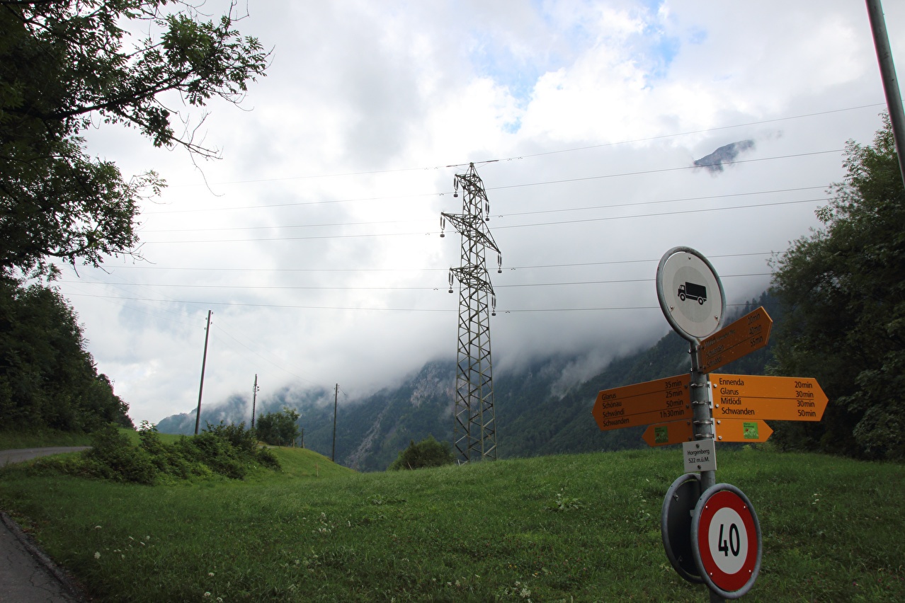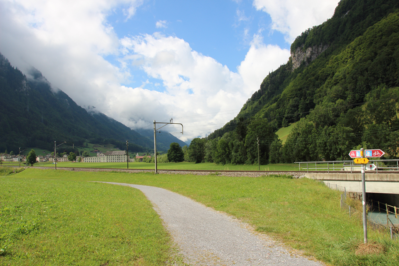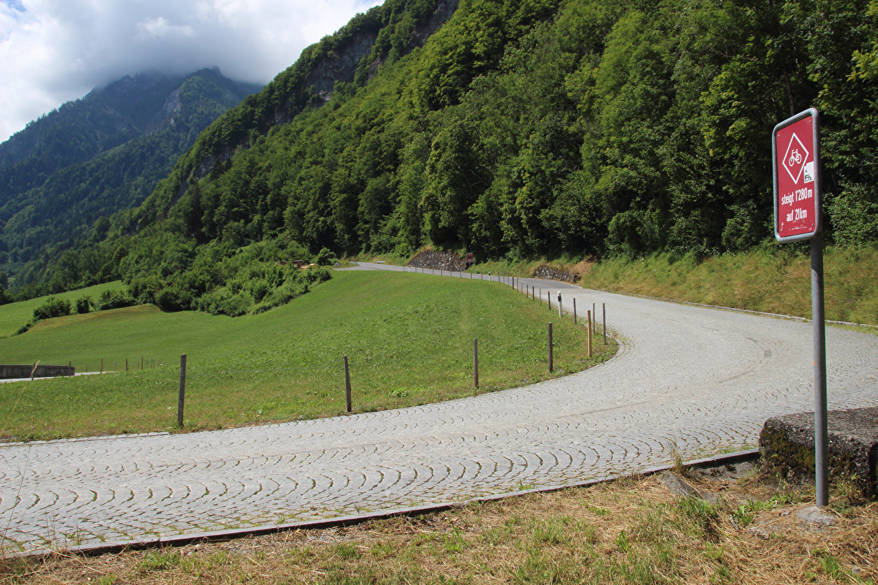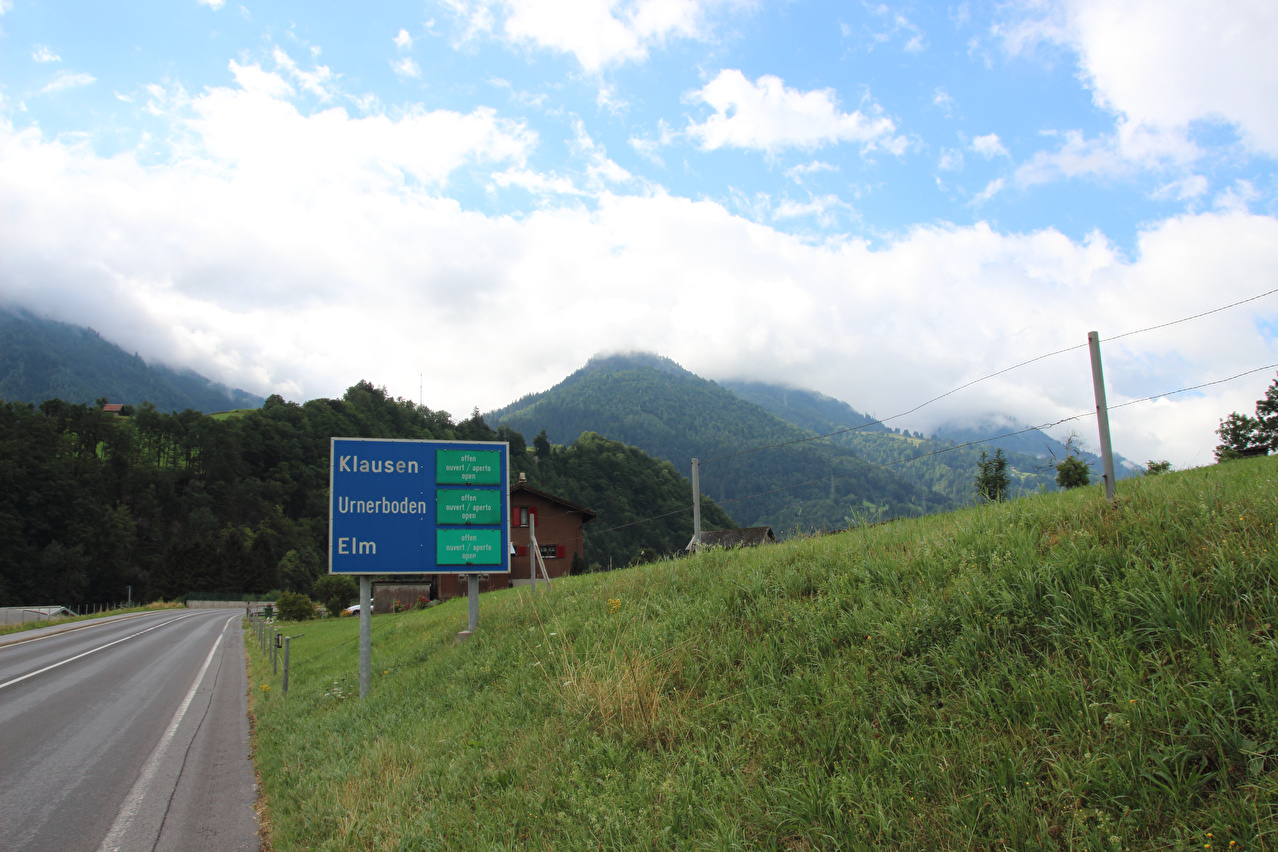 Beschreibung | Die Etappe startete bei recht wolkenverhangenem Himmel. Die weitere Wetterentwicklung war unklar. Schon am Morgen riss es zwar auf, aber die Berge blieben ab einer Höhe von etwa 2000 Meter in Wolken gehüllt. Zunächst wurde auf der Straße gefahren, da ein Wechsel auf den Veloweg bei Horgenberg verlorene Höhenmeter bedeutet hätte. Der Wechsel auf den Veloweg, die nationale "Veloroute 4", die "Alpenpanorama-Route" erfolgte in Schwanden, da dort Straße und Veloweg fast einander berühren und somit auch keine verlorenen Höhenmeter hinzu kamen. Die Weiterfahrt erfolgte im Rahmen dieser Etappe auf der Alpenpanorama-Route. Das Alpenpanorama hielt sich trotz der Fahrt auf der Alpenpanorama-Route für den Rest des Tages oberhalb 2000 Meter sehr bedeckt. Die Einrollphase zu dieser Tour endete in Linthal. Nach dem dortigen Mittagessen ging es Richtung Urnerboden zur Sache. In Linthal liegt das untere Ende der Ostrampe zum Klausenpass. Diese Straße besteht aus einem Abschnitt mit mehreren Serpentinen, der auf den Urnerboden führt, einem fast flachen Abschnitt im Urnerboden und einem weiteren Abschnitt mit zahlreichen Serpentinen, der vom Urnerboden zur Passhöhe führt. Im unteren Serpentinenabschnitt liegen keine extrem steilen Rampen. An diesem Tag endete die Etappe auf dem Urnerboden, einem Hochtal. Die Fahrt am Nachtquartier vorbei bis zur Siedlung Urnerboden erfolgte, um dort noch etwas Proviant einkaufen zu können. Da das Nachtquartier nicht in einer geschlossenen Ortsachft liegt, wurde am Abend noch die Gelegenheit für ein paar Fotos genutzt. |