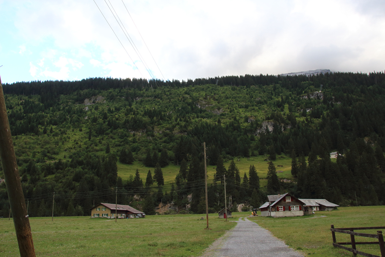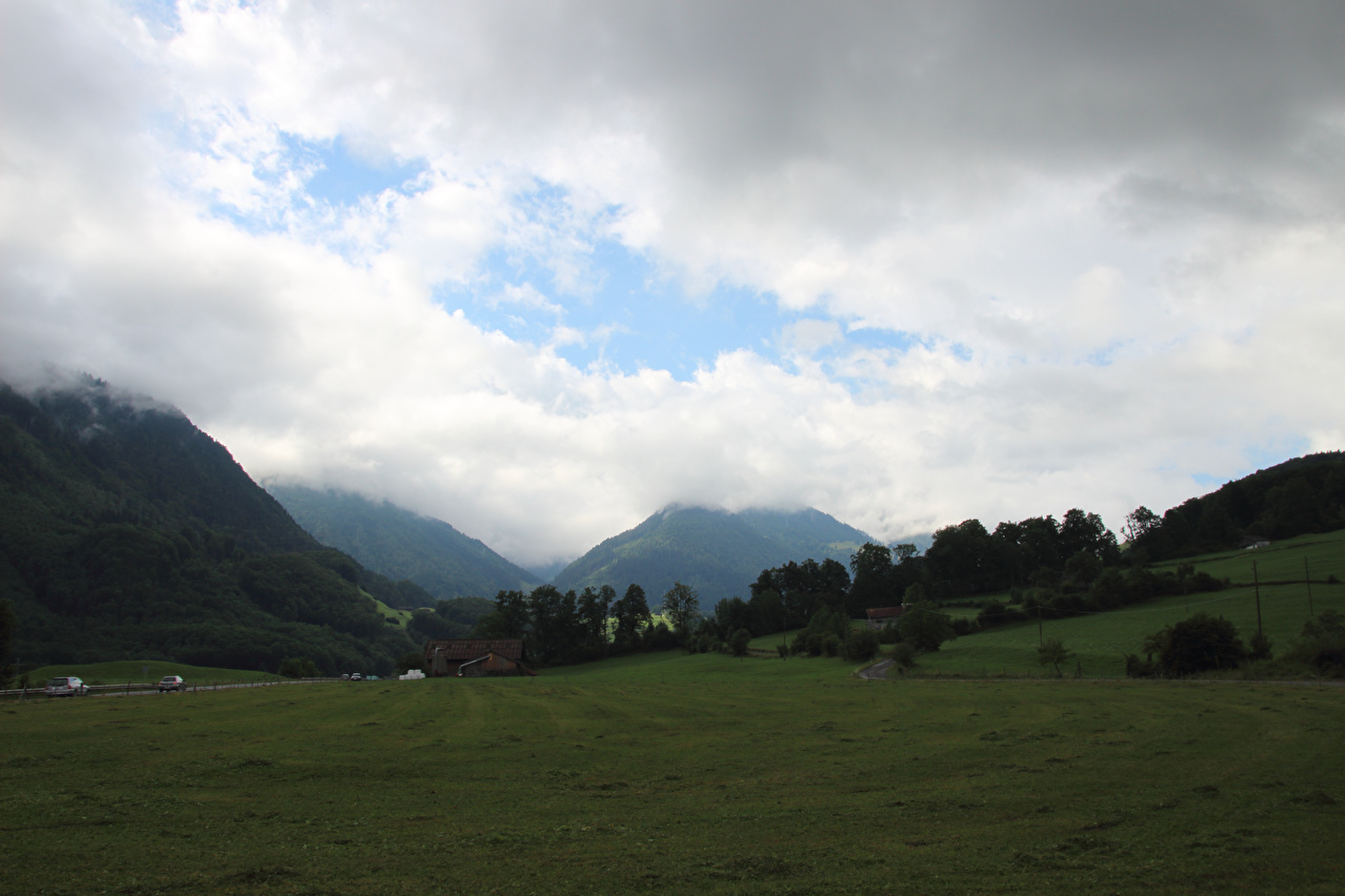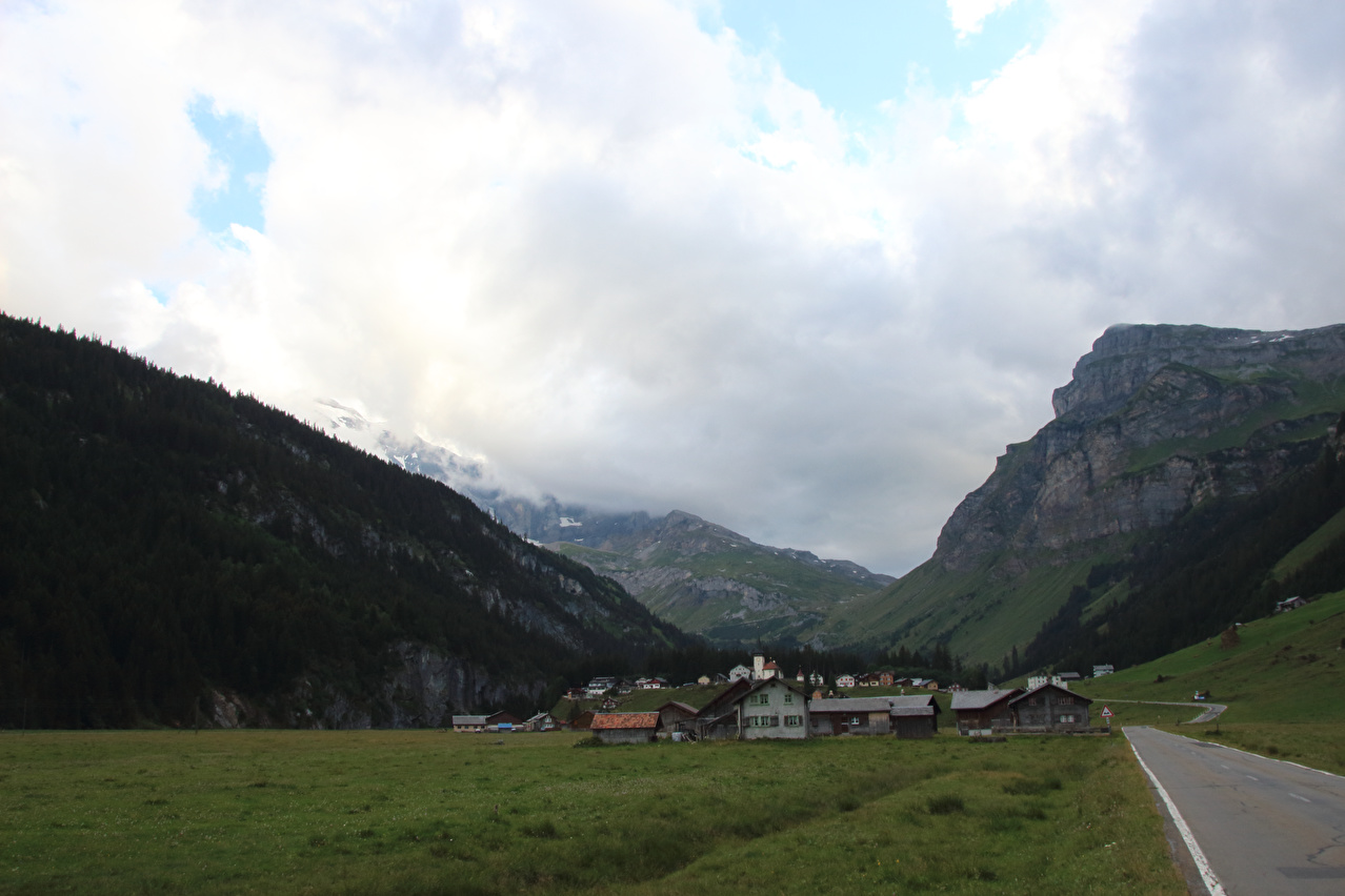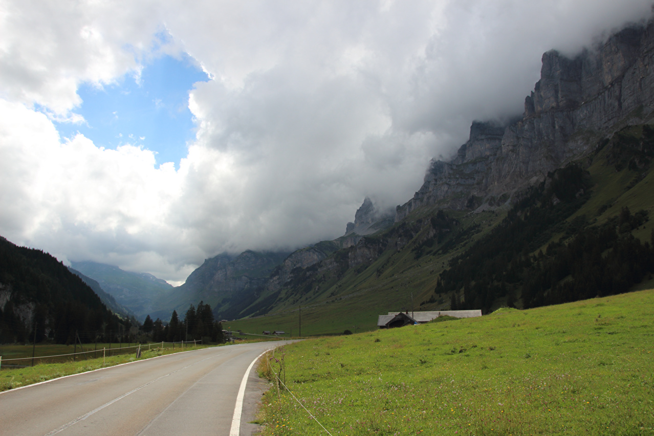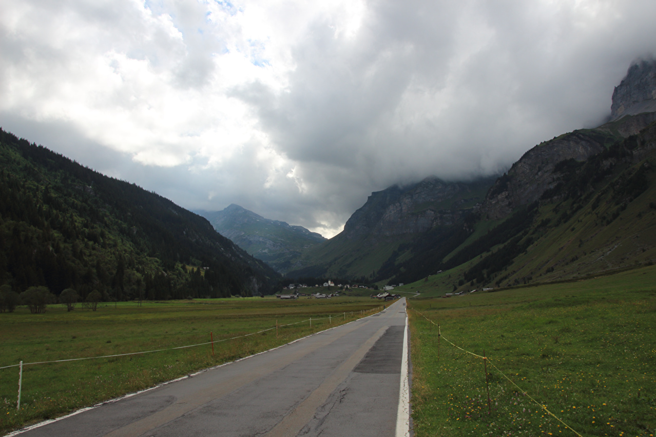 Beschreibung | Die Etappe startete bei recht wolkenverhangenem Himmel. Die weitere Wetterentwicklung war unklar. Schon am Morgen riss es zwar auf, aber die Berge blieben ab einer Höhe von etwa 2000 Meter in Wolken gehüllt. Zunächst wurde auf der Straße gefahren, da ein Wechsel auf den Veloweg bei Horgenberg verlorene Höhenmeter bedeutet hätte. Der Wechsel auf den Veloweg, die nationale "Veloroute 4", die "Alpenpanorama-Route" erfolgte in Schwanden, da dort Straße und Veloweg fast einander berühren und somit auch keine verlorenen Höhenmeter hinzu kamen. Die Weiterfahrt erfolgte im Rahmen dieser Etappe auf der Alpenpanorama-Route. Das Alpenpanorama hielt sich trotz der Fahrt auf der Alpenpanorama-Route für den Rest des Tages oberhalb 2000 Meter sehr bedeckt. Die Einrollphase zu dieser Tour endete in Linthal. Nach dem dortigen Mittagessen ging es Richtung Urnerboden zur Sache. In Linthal liegt das untere Ende der Ostrampe zum Klausenpass. Diese Straße besteht aus einem Abschnitt mit mehreren Serpentinen, der auf den Urnerboden führt, einem fast flachen Abschnitt im Urnerboden und einem weiteren Abschnitt mit zahlreichen Serpentinen, der vom Urnerboden zur Passhöhe führt. Im unteren Serpentinenabschnitt liegen keine extrem steilen Rampen. An diesem Tag endete die Etappe auf dem Urnerboden, einem Hochtal. Die Fahrt am Nachtquartier vorbei bis zur Siedlung Urnerboden erfolgte, um dort noch etwas Proviant einkaufen zu können. Da das Nachtquartier nicht in einer geschlossenen Ortsachft liegt, wurde am Abend noch die Gelegenheit für ein paar Fotos genutzt. |