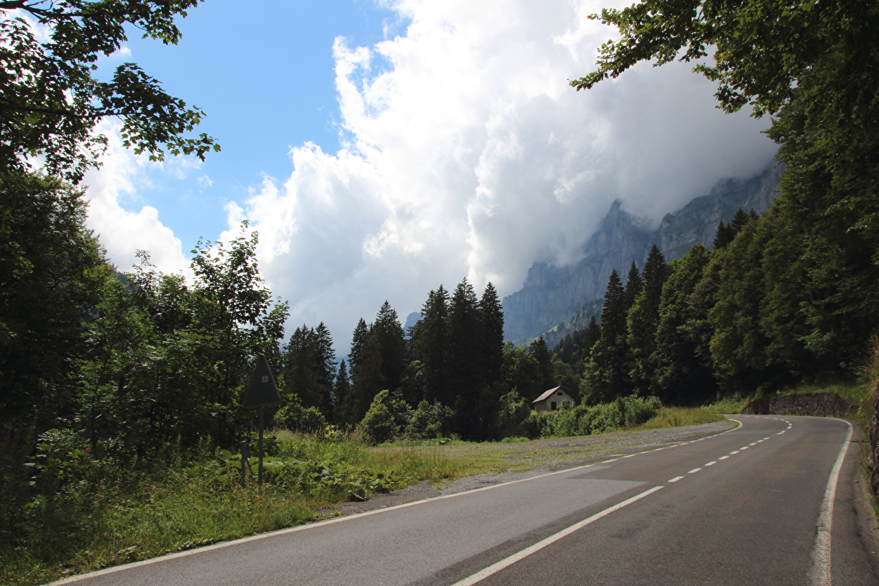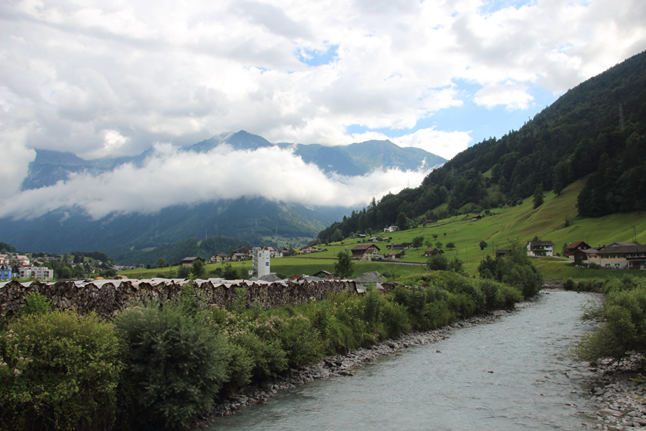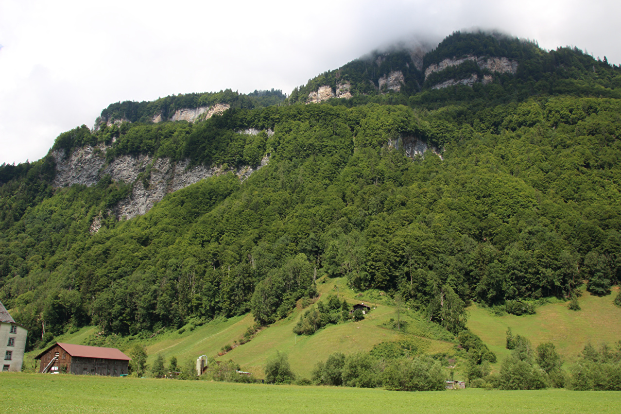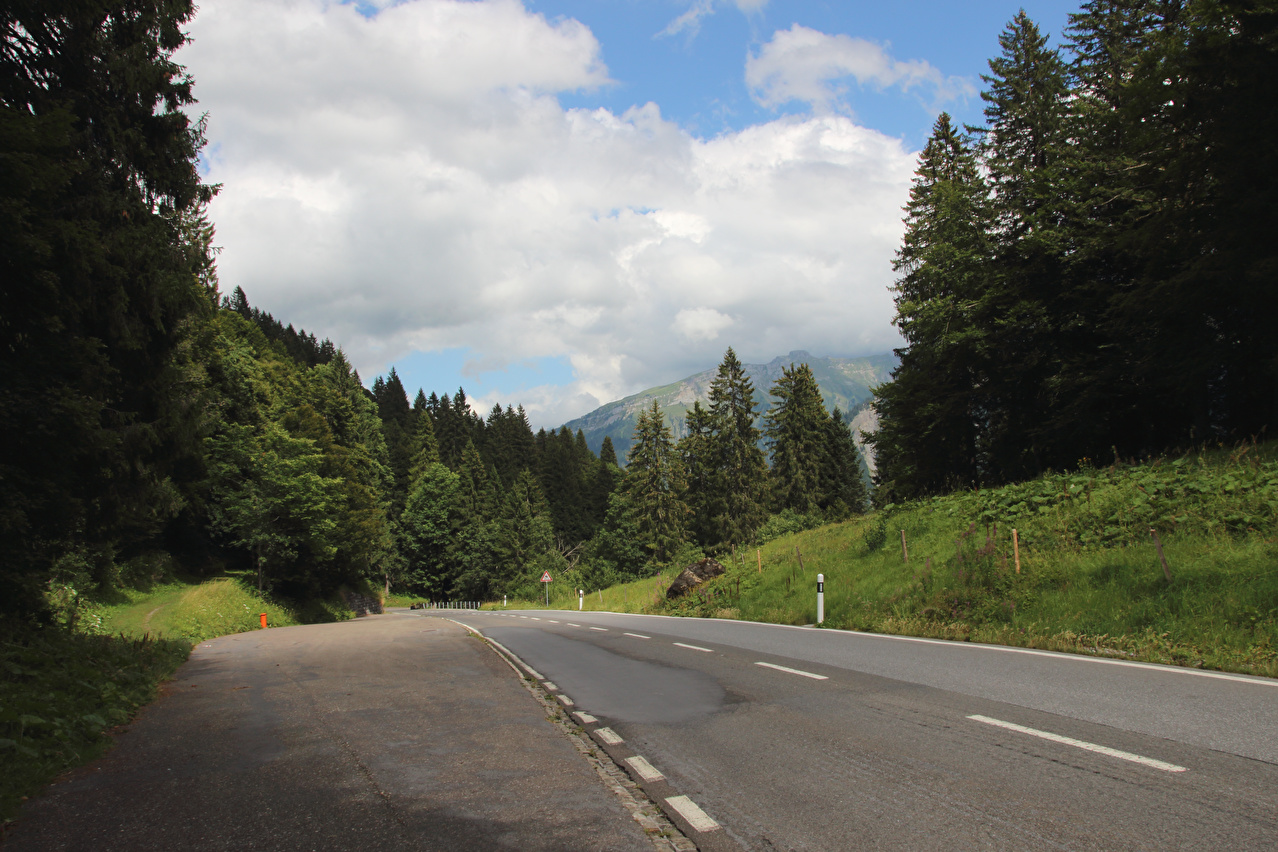 Beschreibung | Die Etappe startete bei recht wolkenverhangenem Himmel. Die weitere Wetterentwicklung war unklar. Schon am Morgen riss es zwar auf, aber die Berge blieben ab einer Höhe von etwa 2000 Meter in Wolken gehüllt. Zunächst wurde auf der Straße gefahren, da ein Wechsel auf den Veloweg bei Horgenberg verlorene Höhenmeter bedeutet hätte. Der Wechsel auf den Veloweg, die nationale "Veloroute 4", die "Alpenpanorama-Route" erfolgte in Schwanden, da dort Straße und Veloweg fast einander berühren und somit auch keine verlorenen Höhenmeter hinzu kamen. Die Weiterfahrt erfolgte im Rahmen dieser Etappe auf der Alpenpanorama-Route. Das Alpenpanorama hielt sich trotz der Fahrt auf der Alpenpanorama-Route für den Rest des Tages oberhalb 2000 Meter sehr bedeckt. Die Einrollphase zu dieser Tour endete in Linthal. Nach dem dortigen Mittagessen ging es Richtung Urnerboden zur Sache. In Linthal liegt das untere Ende der Ostrampe zum Klausenpass. Diese Straße besteht aus einem Abschnitt mit mehreren Serpentinen, der auf den Urnerboden führt, einem fast flachen Abschnitt im Urnerboden und einem weiteren Abschnitt mit zahlreichen Serpentinen, der vom Urnerboden zur Passhöhe führt. Im unteren Serpentinenabschnitt liegen keine extrem steilen Rampen. An diesem Tag endete die Etappe auf dem Urnerboden, einem Hochtal. Die Fahrt am Nachtquartier vorbei bis zur Siedlung Urnerboden erfolgte, um dort noch etwas Proviant einkaufen zu können. Da das Nachtquartier nicht in einer geschlossenen Ortsachft liegt, wurde am Abend noch die Gelegenheit für ein paar Fotos genutzt. |