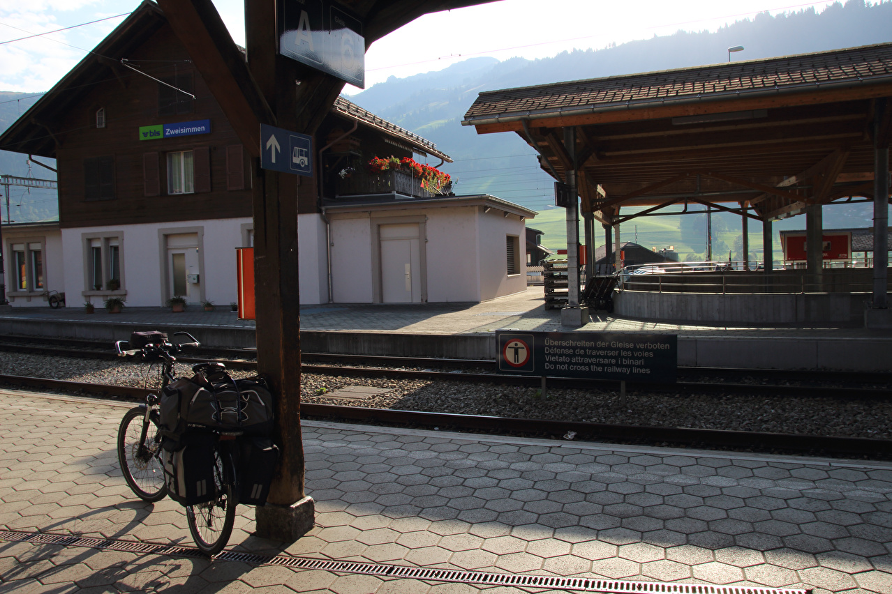 Beschreibung | Der Horror hat einen Namen: "Abreisetag"! Schluss! Aus! Vorbei! Keine richtigen Berge mehr für eine wieder viel zu lange Zeit! Das Nachtquartier lag direkt gegenüber vom Bahnhof. Mit einer Fahrstrecke von 90 m war dies die kürzeste Fahrt zwischen Start- oder Zielbahnhof und Nachtquartier im Rahmen einer Alpentour. Die Bahnfahrt verlief hinsichtlich Verspätungen und Erreichen der Anschlusszüge problemlos. Dafür hatte die Bahn schwer mit dem Sommer, einem ihrer vier schlimmsten Feinde (Frühling, Sommer, Herbst und Winter) zu kämpfen. Weil Klimaanlagen purer Luxus sind, funktionierten diese im IC von Karlsruhe nach Hannover gar nicht erst. Da über Deutschland an diesem Tag ein Brüllhitzehoch lag, erfolgte die Fahrt in dem IC bei extrem kuscheligen +32,5 °C. Wenigstens funktionierte die Lüftung im Waggon. Böses ahnend war am Morgen im Nachtquartier genug Wasser abgefüllt worden. Nach geraumer Fahrzeit wurde kostenlos stilles Mineralwasser in 0,5 ℓ-Getränkekartons an die Fahrgäste verteilt. Später wurde einfach ein Karton mit diesen Getränkekartons im Waggon abgestellt mit den Worten "Nehmen Sie sich, was Sie brauchen.". Etwa ab Kassel schaufelte die Lüftung endlich etwas kühlere Luft in den Waggon, und die nun schon tief stehende Sonne ballerte auch nicht mehr ungestört auf den Zug. Die Velotour hatte mit dem Einstieg in den Zug in Zweisimmen, sprachlich mit dem Überqueren der Grenze nach Deutschland geendet, und so wurden die letzten 5,8 km im Rahmen der Alpentour 2015 auf dem Fahrrad zurückgelegt. Nach den Alpentopuren 2012, 2013 und 2014, die alle mindestens einen Werkstattaufenthalt wegen eines defekten Freilaufkörpers erfordert hatten, war in diesem Jahr der Freilaufkörper einige Wochen vor Tourbeginn getauscht worden. Das lohnte sich, denn die Alpentour 2015 kam ohne Werkstattaufenthalt aus. Hinsichtlich der überwundenen Höhenmeter fiel die Alpentour 2015 sehr mager aus. Das lag zum einen an den ohnehin nur zehn geplanten Etappen. Dazu kam noch hinsichtlich der Fahrleistung der wetterbedingte Wegfall einer Etappe. |