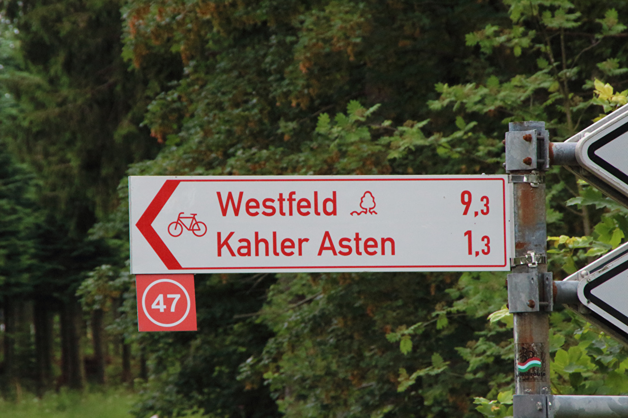 Beschreibung | Der Tag begann verregnet, aber rechtzeitig zum Etappenstart hörte es auf und trotz vieler dunkler Wolken am Himmel blieb es bis auf ein paar verirrte Tropfen trocken. Gleich ab Bad Berleburg begann der längste Anstieg der Tour zum "Dach der Tour" auf dem Kahlen Asten. Bis auf zwei kurze Rampen in Olsberg und Bigge war dies der einzige Anstieg der Tour. Zunächst geht es nur allmählich bergauf. Mit dem Wechsel von der B480 auf die L721 war Stinkeverkehr bis Neuastenberg kein Thema mehr. Mit dem Wechsel von der L721 auf die L894 wird das Odeborntal verlassen und die Steigung zieht merklich an. In Neuastenberg lauert dann eine fies steile Rampe mit über 10 % Steigung. Der Rest bis auf den Kahlen Asten ist dann wieder unproblematisch, wenn auch stärker mit Stinkeverkehr belastet. Am dritten Tag in Folge im Mittelgebirge war einigermaßen "Betriebstemperatur" erreicht worden, weshalb es insgesamt leichter rollte. Bemerkenswert ist, dass bis zum Gipfel des Kahlen Asten Fahrradwegweiser stehen. Obwohl Nordrhein-Westfalen auch viel Flachland zu bieten hat, weiß man dort, was Fahrradfahrer wollen. Auf dem Kahlen Asten kam sogar mal kurz die Sonne raus. Essen war oben allerdings Fehlanzeige, da das Restaurant auf dem Gipfel wegen Renovierungsarbeiten geschlossen war. Für die Mittagspause wurde nach der Abfahrt vom Gipfel daher nochmal einige hundert Meter "in die falsche Richtung" gefahren, um in die geöffnete Jausenstation am Nordhang des Kahlen Asten einzukehren. Ab Altastenberg, dem höchstgelegenen Ort Nordrhein-Westfalens folgte die lange Abfahrt nach Olsberg durch das Negertal auf Straßen mit sehr wenig Stinkeverkehr bis kurz vor Olsberg. In Olsberg selbst herrschte dann allerdings Stinkeverkehr Stoßstange an Stoßstange. Die niedrigen Temperaturen und der bedeckte, immer mit Regen drohende Himmel luden nicht zu einer Verlängerung der Etappe ein. Da am Bahnhof Olsberg keine Einkaufmöglichkeit vorhanden ist und auch am Bahnhof Warburg keine solche vorhanden ist, wurde, da noch genug Zeit war, im Gewerbegebiet in Bigge ein Supermarkt angefahren, um Reiseproviant zu kaufen. Der Stinkeverkehr zwischen Bahnhof und Gewerbegebiet war allerdings noch schlimmer als in Olsberg. Die Bahnabreise mit einer Dauer von ca. vier Stunden mit zweimal Umsteigen war natürlich genauso grenzwertig wie die Bahnanreise. Von Warburg nach Altenbeken wurden auch noch 9 Minuten Verspätung eingesammelt, der Anschluss nach Hannover wurde aber erreicht, da die Umsteigezeit fahrplanmäßig 26 Minuten betrug. |