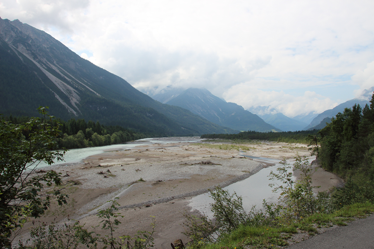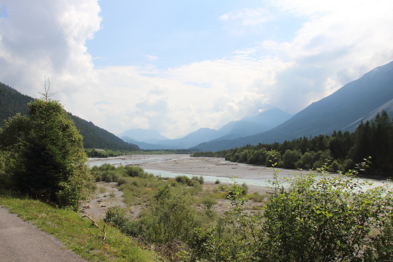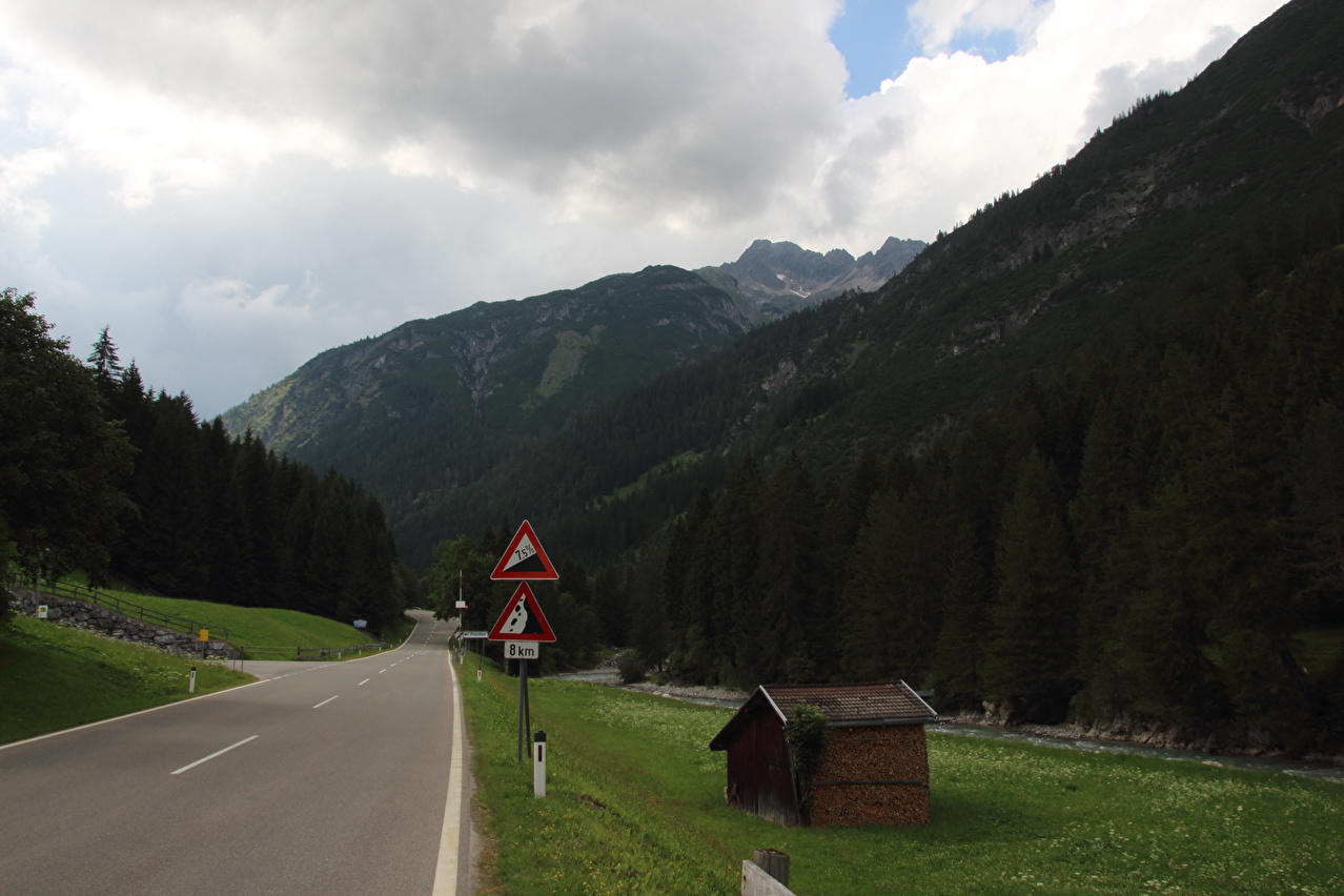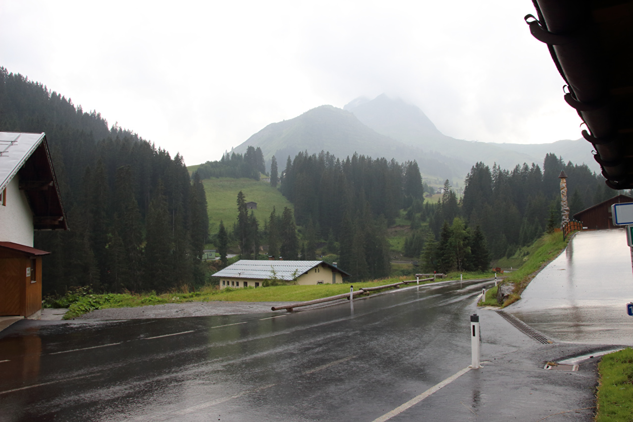 Beschreibung | Durchaus mit sonnigen Anteilen aber deutlich unaufgeräumt präsentierte siche der Himmel zum Etappenstart. Die hohe Luftfeuchtigkeit ließ auch nichts Gutes erwarten. Die Etappe begann zunächst mit einer Streckenwiederholung, denn der Abschnitt des Lechtalradwegs von Weißenbach am Lech bis kurz vor Elmen war schon einmal am 23.07.2012 gefahren worden. Damals erfolgte die Fahrt dort zum Ende der Etappe, sodass dieses Mal wenigstens eine durch die andere Tageszeit bedingte andere Lichtstimmung herrschte. Das Lechtal ist in diesem Bereich extrem mit Bremsen verseucht, und das feuchtwarme Wetter trieb diese widerlichen Blutsauger noch so richtig an. Bei nahezu jeder Pause herrschte daher sofort Stechbomberalarm, womit die Icaridin-Duschen unumgänglich wurden. In Steeg endet der Lechtalradweg als Sackgasse. Das Lechtal ändert oberhalb von Steeg seinen Charakter. Das Lechtal ist dort tief eingeschnitten, die steiler werdende Straße verläuft notwendigerweise im Hang. Platz für einen Radweg ist dort nicht vorhanden. Leider änderte an diesem Tag oberhalb von Steeg nicht nur das Lechtal seinen Charakter sondern auch das Wetter. Wie schon am Vortag setzte Starkregen ein, der bis zur Bergankunft in Warth auch nicht mehr aufhörte. In Warth angekommen folgte ein kurzer trockener Abschnitt, aber schon während des Abendessens setzte wieder kräftiger Regen ein, der sich bis tief in die Nacht hielt. |