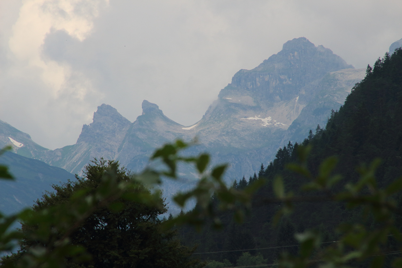 Warth, Blick auf v. l. n. r.: Höllenspitze (in Wolken) und Mittagsspitze (in Wolken) ![]() 300 dpi JPEG |