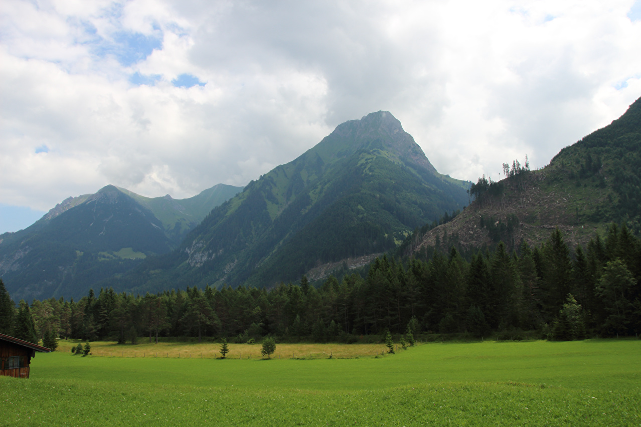 Warth, Blick auf Gehren und Lechleiten, darüber v. l. n. r.: Hundskopf und Biberkopf (in Wolken) ![]() 300 dpi JPEG |