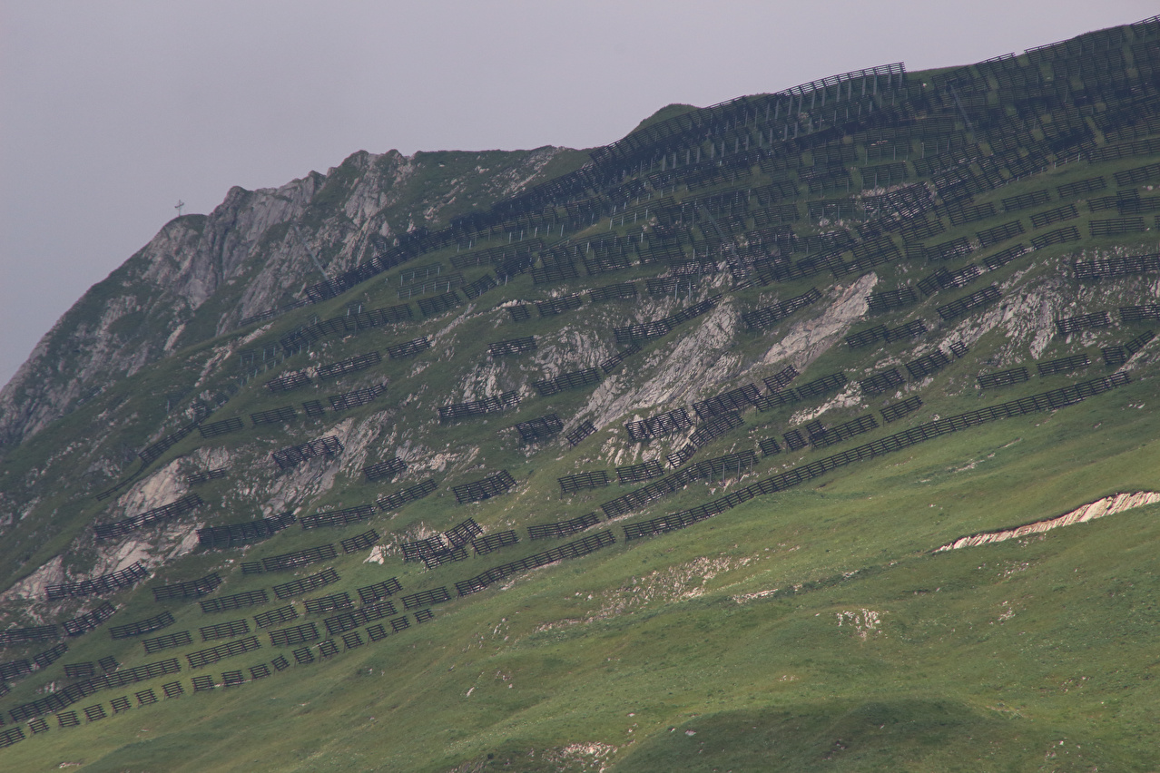Zoom auf den Gipfelbereich des Pfeiler mit Lawinenverbauungen ![]() 300 dpi JPEG |