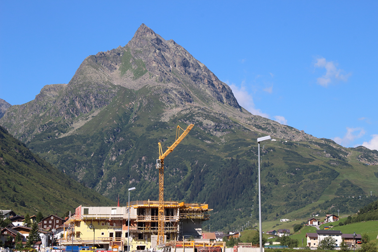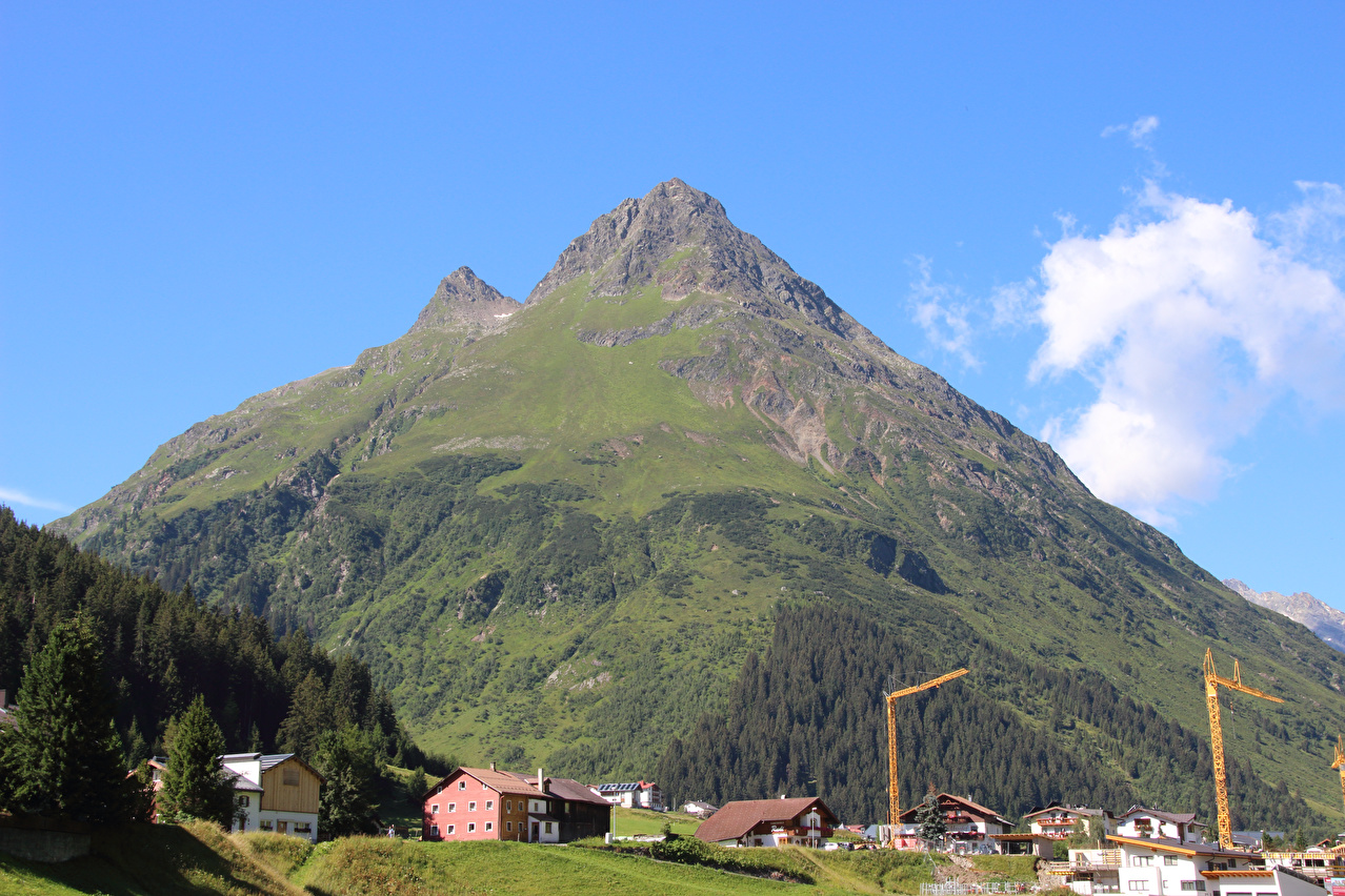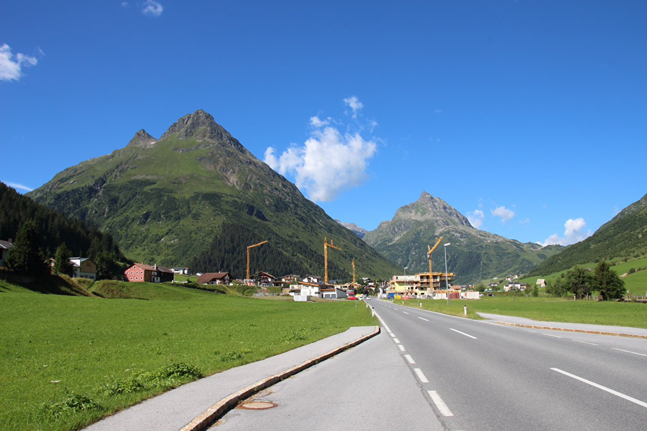Arlberg Ersatzstraße im Hang, Sanna und Silvretta Straße im Tal, im Hintergrund v. l. n. r.: Gatschkopf, Simeleskopf, Blankahorn und Wannenkopf ![]() 300 dpi JPEG |
