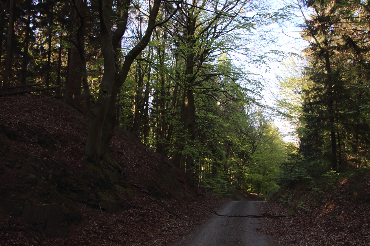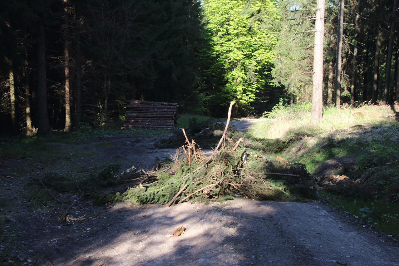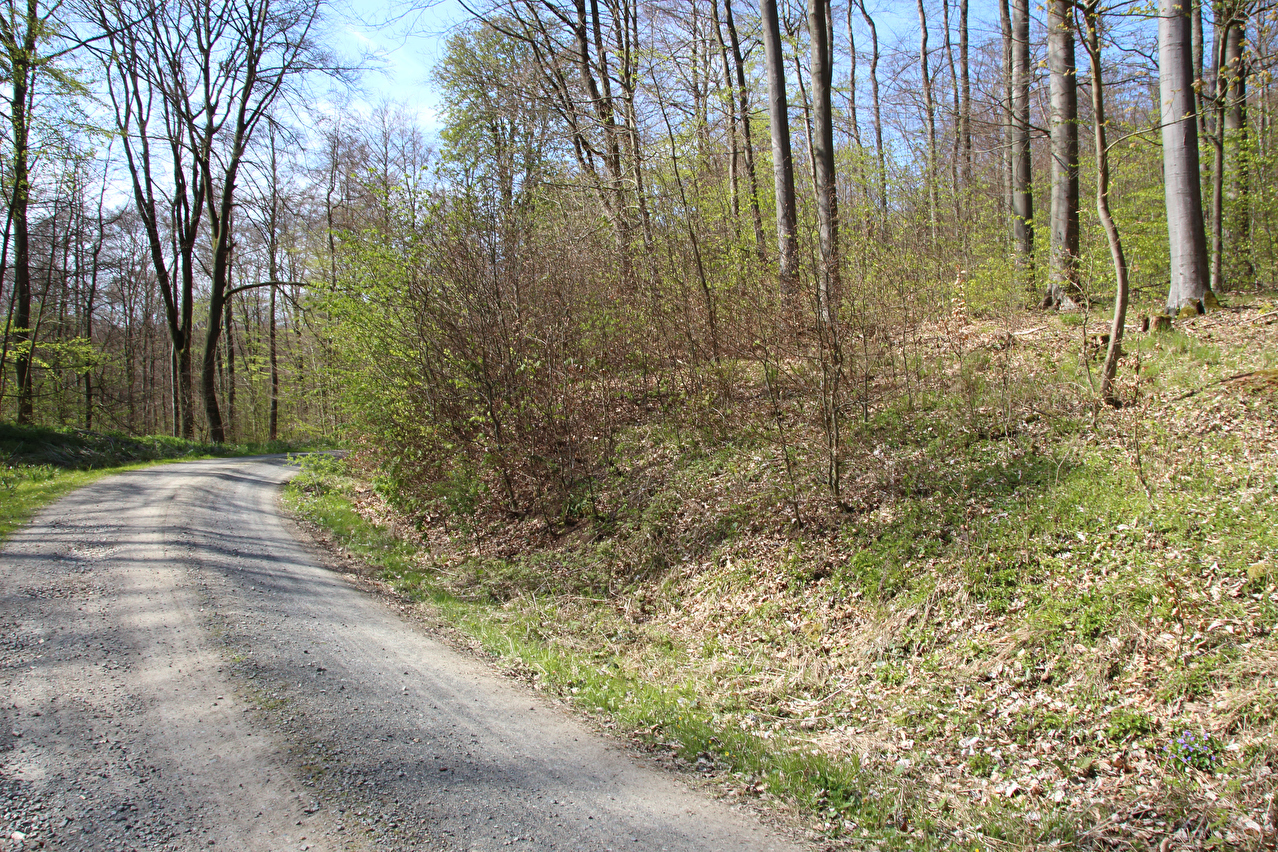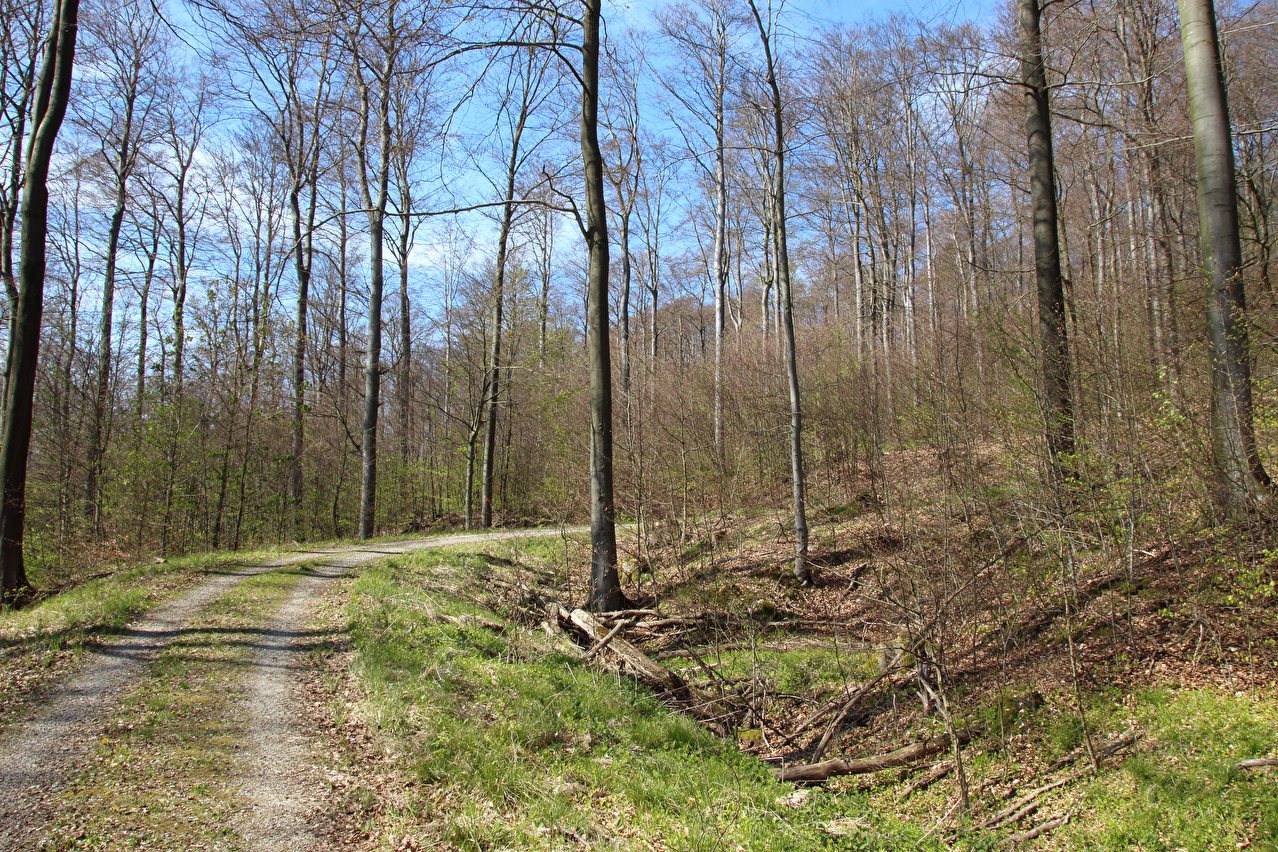 Beschreibung | Diese Tour war die letzte in diesem Jahr, die noch weite Blicke durch lichte Buchenwälder bot, denn die Buchen zeigten bereits ersten Laubaustrieb. Die Sonne drückte an dem Tag schon recht kräftig, dafür bot sich eine gute Fernsicht. Gleich dreimal "Holz" quer über den Weg auf einer Strecke von noch nicht einmal 2 km war schon reichlich viel für Zufall, zumal die Teile auch nicht sehr zufällig liegend aussahen. Da hat sich womöglich jemand einen ganz schlechten Scherz erlaubt, zumal an zwei Stellen der Weg eine starke Neigung aufweist und eine dieser beiden Stellen auch noch unübersichtlich ist. Während sich der erste Asthaufen umfahren ließ, waren die beiden anderen nicht umfahrbaren Hindernisse mit ein paar Handgriffen schnell beiseite geräumt. Auch diese leichtgängige Wegräumbarkeit sprach gegen Zufall. |