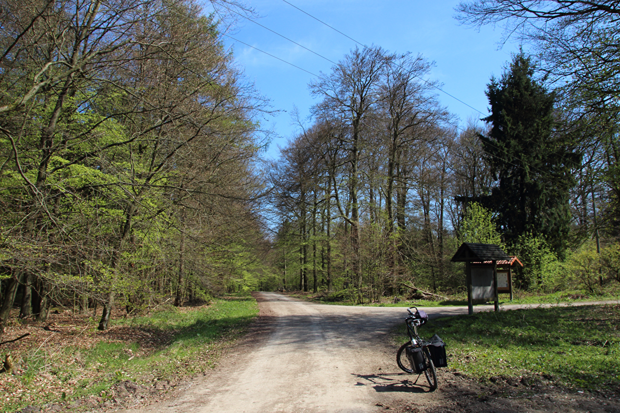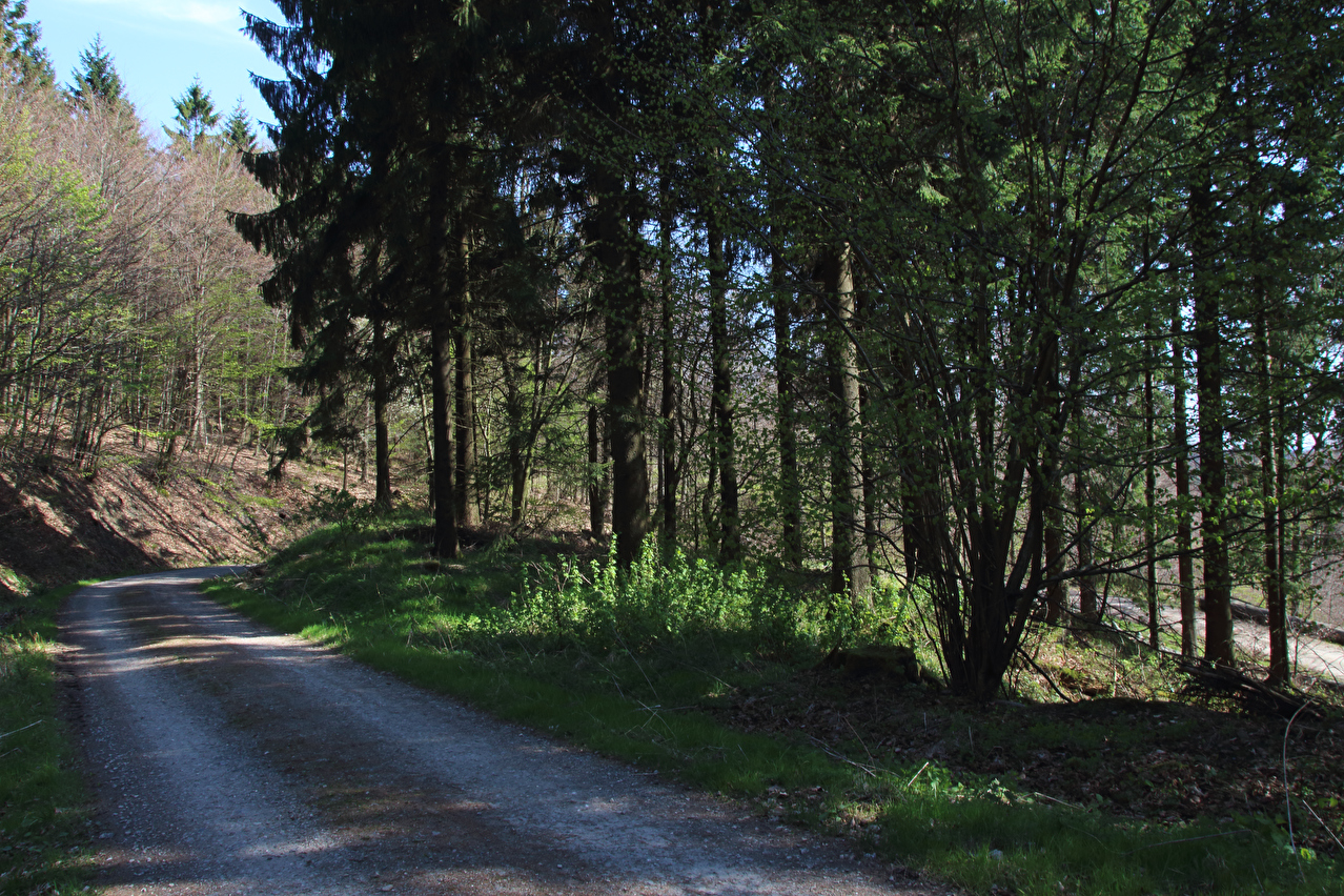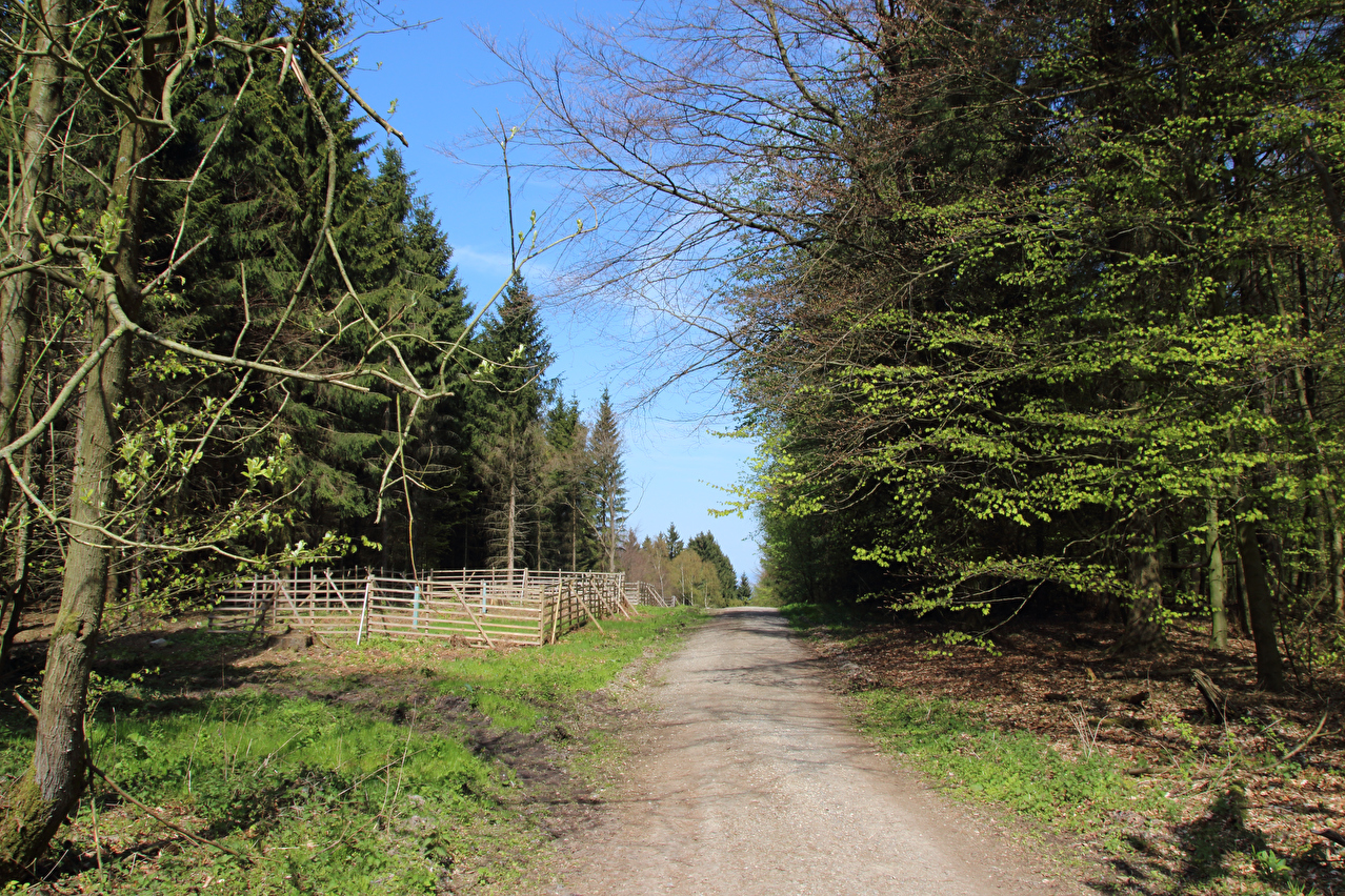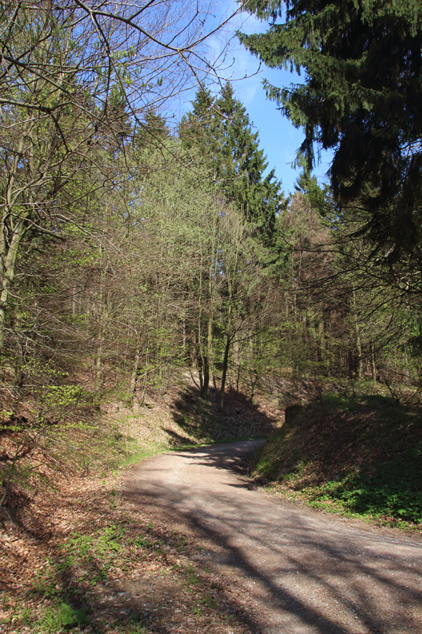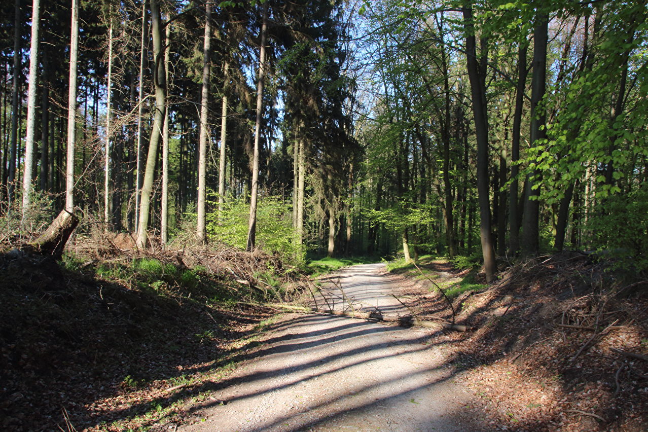 Beschreibung | Diese Tour war die letzte in diesem Jahr, die noch weite Blicke durch lichte Buchenwälder bot, denn die Buchen zeigten bereits ersten Laubaustrieb. Die Sonne drückte an dem Tag schon recht kräftig, dafür bot sich eine gute Fernsicht. Gleich dreimal "Holz" quer über den Weg auf einer Strecke von noch nicht einmal 2 km war schon reichlich viel für Zufall, zumal die Teile auch nicht sehr zufällig liegend aussahen. Da hat sich womöglich jemand einen ganz schlechten Scherz erlaubt, zumal an zwei Stellen der Weg eine starke Neigung aufweist und eine dieser beiden Stellen auch noch unübersichtlich ist. Während sich der erste Asthaufen umfahren ließ, waren die beiden anderen nicht umfahrbaren Hindernisse mit ein paar Handgriffen schnell beiseite geräumt. Auch diese leichtgängige Wegräumbarkeit sprach gegen Zufall. |