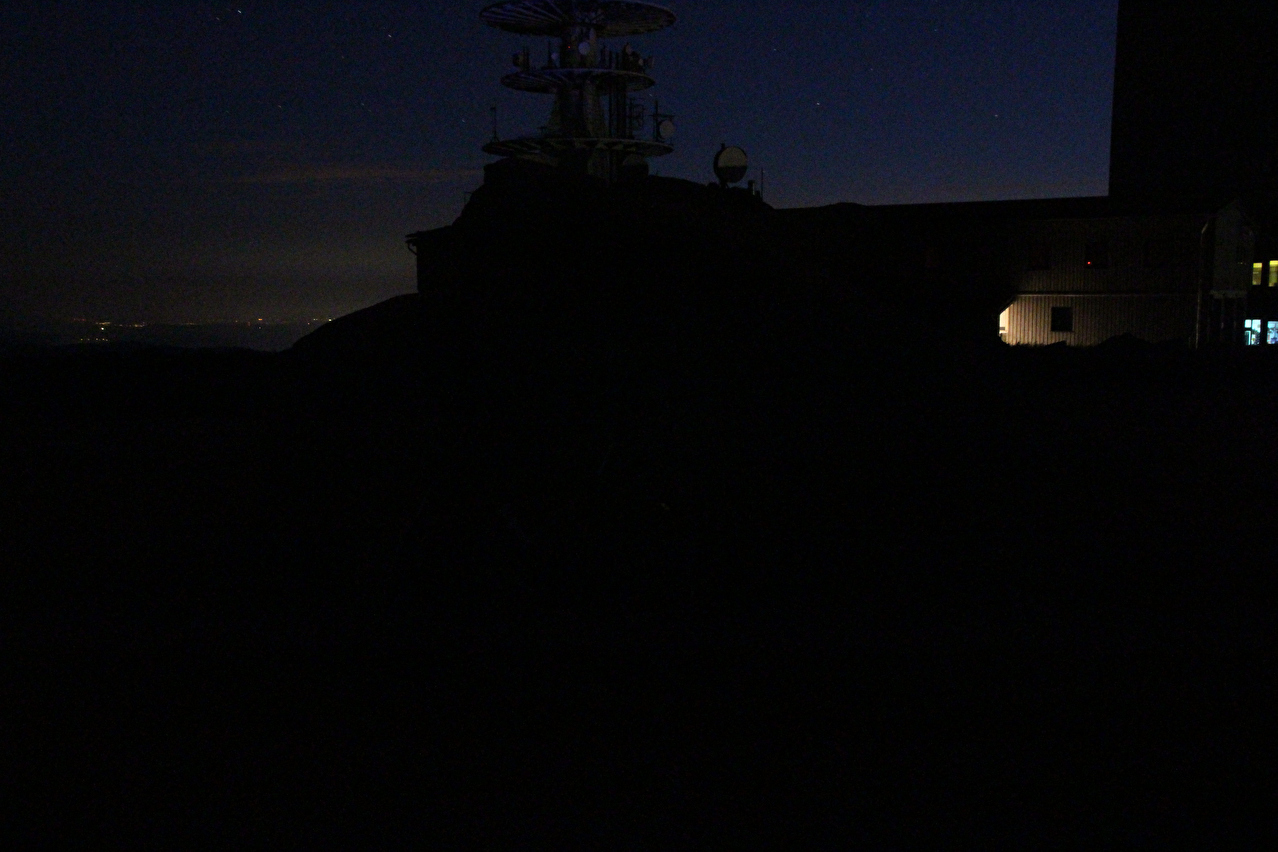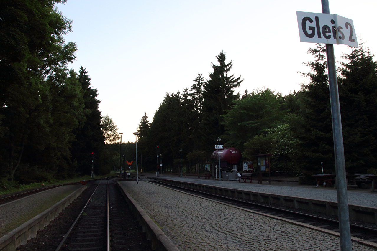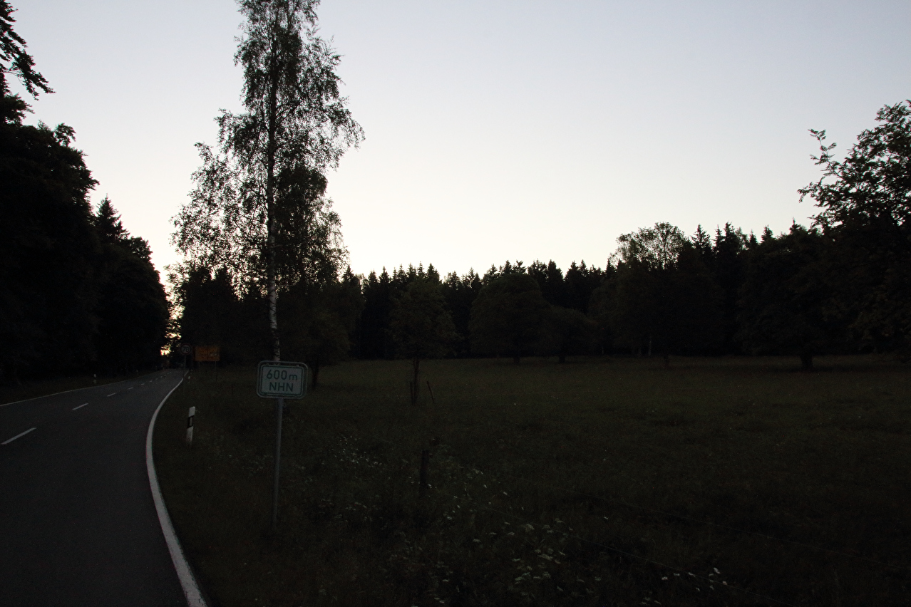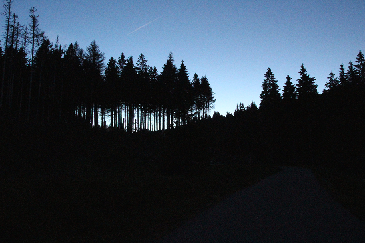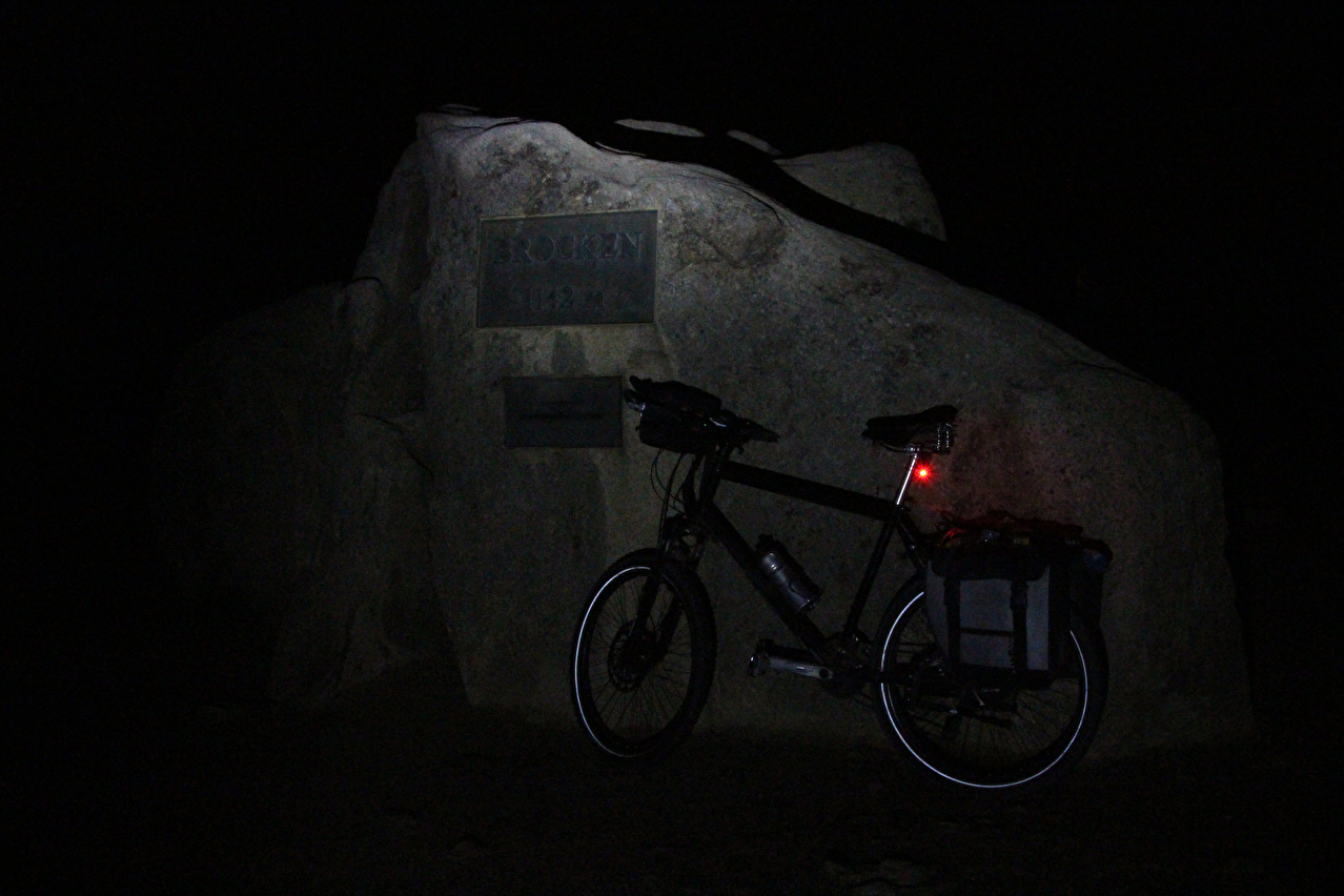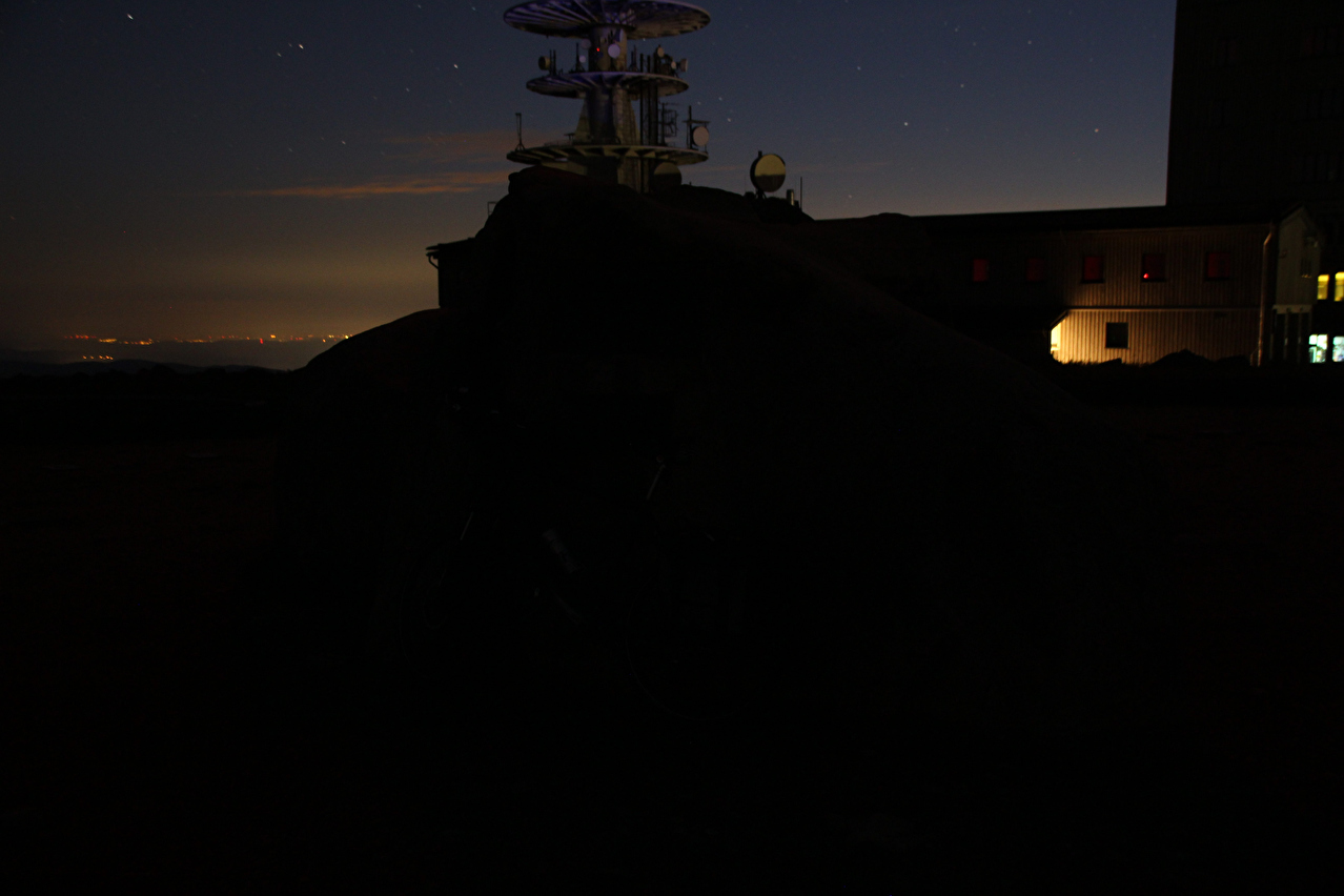 dieser Ausrüstung sind eher ungeeignet für eine Fahrradfahrt auf den Brocken. Dass diese Nacht zwischen den Werktagen Montag und Dienstag lag, bot zwei weitere Vorteile. Zum einen war der Besucherandrang auf dem Brocken extrem übersichtlich, was auch damit zusammenhing, dass um diese Zeit kein Züge mehr auf den Brocken fuhren. Zum anderen bestand nur ein geringes Risiko mit Alkomobilen auf der Straße in Kontakt zu geraten. Dieses Risiko trat auch nicht ein. Der Brockengipfel wurde wenige Minuten nach Mitternacht, also 01:00 MESZ erreicht, das erste Foto von der Mitternachtsdämmerung am Nordhorizont gelang etwa 10 Minuten später. Für das Foto vom "Dach der Tour" wurde der Akku-Frontscheinwerfer vom Fahrrad abgenommen und als Lichtquelle genutzt, um ohne Blitz fotografieren zu können. Reichten während der ersten Fotoserie noch die langen Klamotten, war danach dick einmummeln angesagt. Der Brocken gehört nun mal nicht gerade zu den wärmsten Orten in Norddeutschland. Außerdem stand die lange Abfahrt zurück nach Wernigerode an und bis kurz vor Sonnenaufgang wurde es immer kälter und auch feuchter. Der Wind war in dieser Nacht ausnahmsweise mal kein Thema auf dem Brocken. Von der Abfahrt gibt es keine Bilder, da sonst der erste Zug nach Hannover nicht erreicht worden wäre. Obwohl nur auf Straßen gefahren wurde, wurde das geländegängige Fahrrad gewählt zum einen wegen der Ausstattung mit Scheibenbremsen für die lange Abfahrt und zum anderen für die Option einer Abfahrt nach Bad Harzburg. Weniger schön war die Lichtverschmutzung am Osthang des Brockengipfels. Das Schild der Bahnhofsgaststätte leuchtete großflächig in grellem Weiß Richtung Gipfel. Mitten in der Nacht war das komplett sinnentleert, da die Gaststätte geschlossen war und auch keine Züge den Bahnhof anfuhren. |