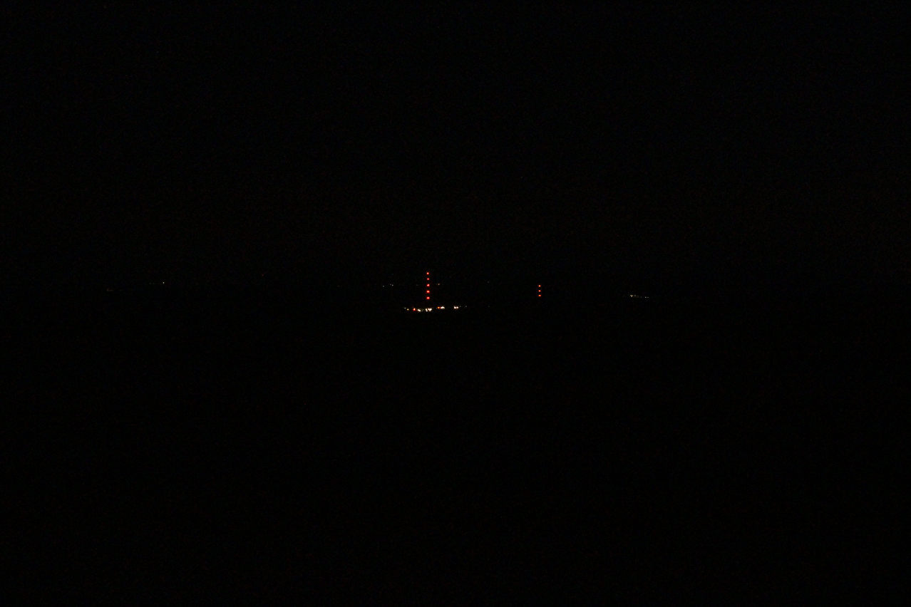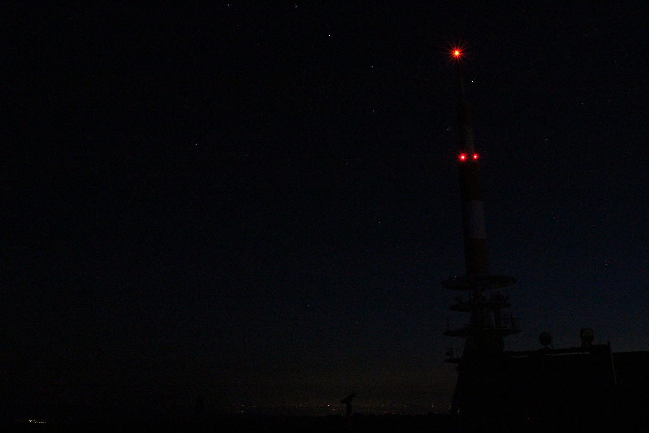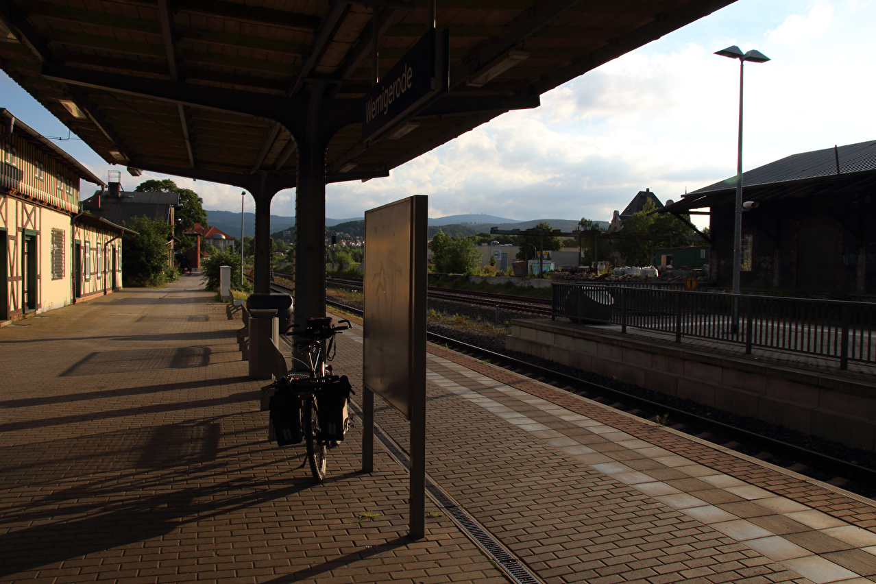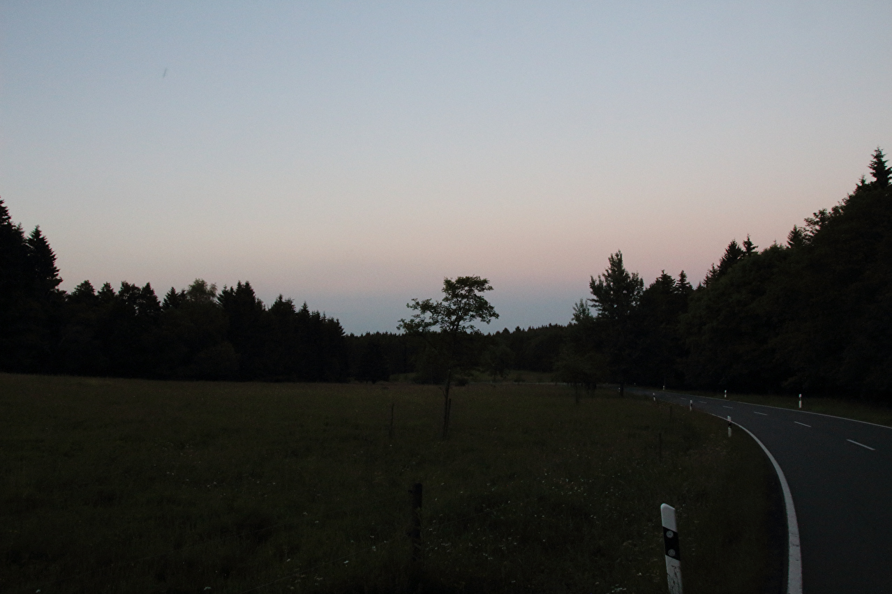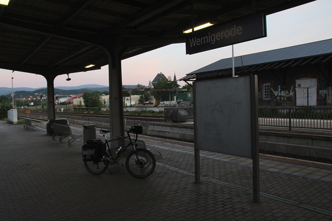 dieser Ausrüstung sind eher ungeeignet für eine Fahrradfahrt auf den Brocken. Dass diese Nacht zwischen den Werktagen Montag und Dienstag lag, bot zwei weitere Vorteile. Zum einen war der Besucherandrang auf dem Brocken extrem übersichtlich, was auch damit zusammenhing, dass um diese Zeit kein Züge mehr auf den Brocken fuhren. Zum anderen bestand nur ein geringes Risiko mit Alkomobilen auf der Straße in Kontakt zu geraten. Dieses Risiko trat auch nicht ein. Der Brockengipfel wurde wenige Minuten nach Mitternacht, also 01:00 MESZ erreicht, das erste Foto von der Mitternachtsdämmerung am Nordhorizont gelang etwa 10 Minuten später. Für das Foto vom "Dach der Tour" wurde der Akku-Frontscheinwerfer vom Fahrrad abgenommen und als Lichtquelle genutzt, um ohne Blitz fotografieren zu können. Reichten während der ersten Fotoserie noch die langen Klamotten, war danach dick einmummeln angesagt. Der Brocken gehört nun mal nicht gerade zu den wärmsten Orten in Norddeutschland. Außerdem stand die lange Abfahrt zurück nach Wernigerode an und bis kurz vor Sonnenaufgang wurde es immer kälter und auch feuchter. Der Wind war in dieser Nacht ausnahmsweise mal kein Thema auf dem Brocken. Von der Abfahrt gibt es keine Bilder, da sonst der erste Zug nach Hannover nicht erreicht worden wäre. Obwohl nur auf Straßen gefahren wurde, wurde das geländegängige Fahrrad gewählt zum einen wegen der Ausstattung mit Scheibenbremsen für die lange Abfahrt und zum anderen für die Option einer Abfahrt nach Bad Harzburg. Weniger schön war die Lichtverschmutzung am Osthang des Brockengipfels. Das Schild der Bahnhofsgaststätte leuchtete großflächig in grellem Weiß Richtung Gipfel. Mitten in der Nacht war das komplett sinnentleert, da die Gaststätte geschlossen war und auch keine Züge den Bahnhof anfuhren. |