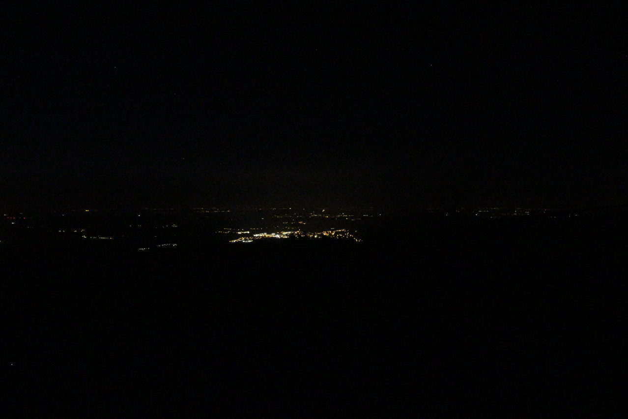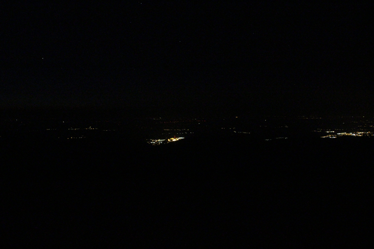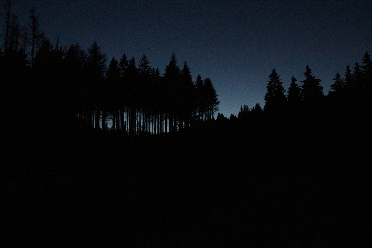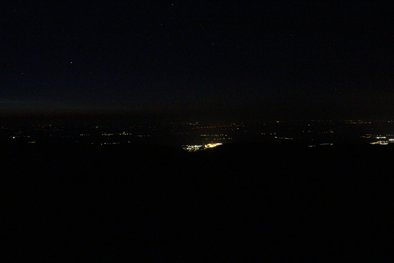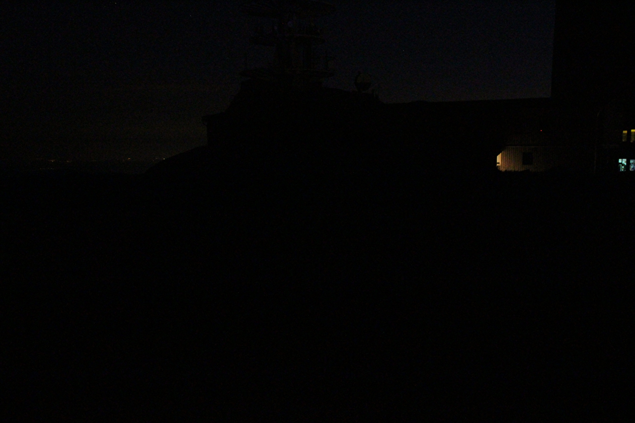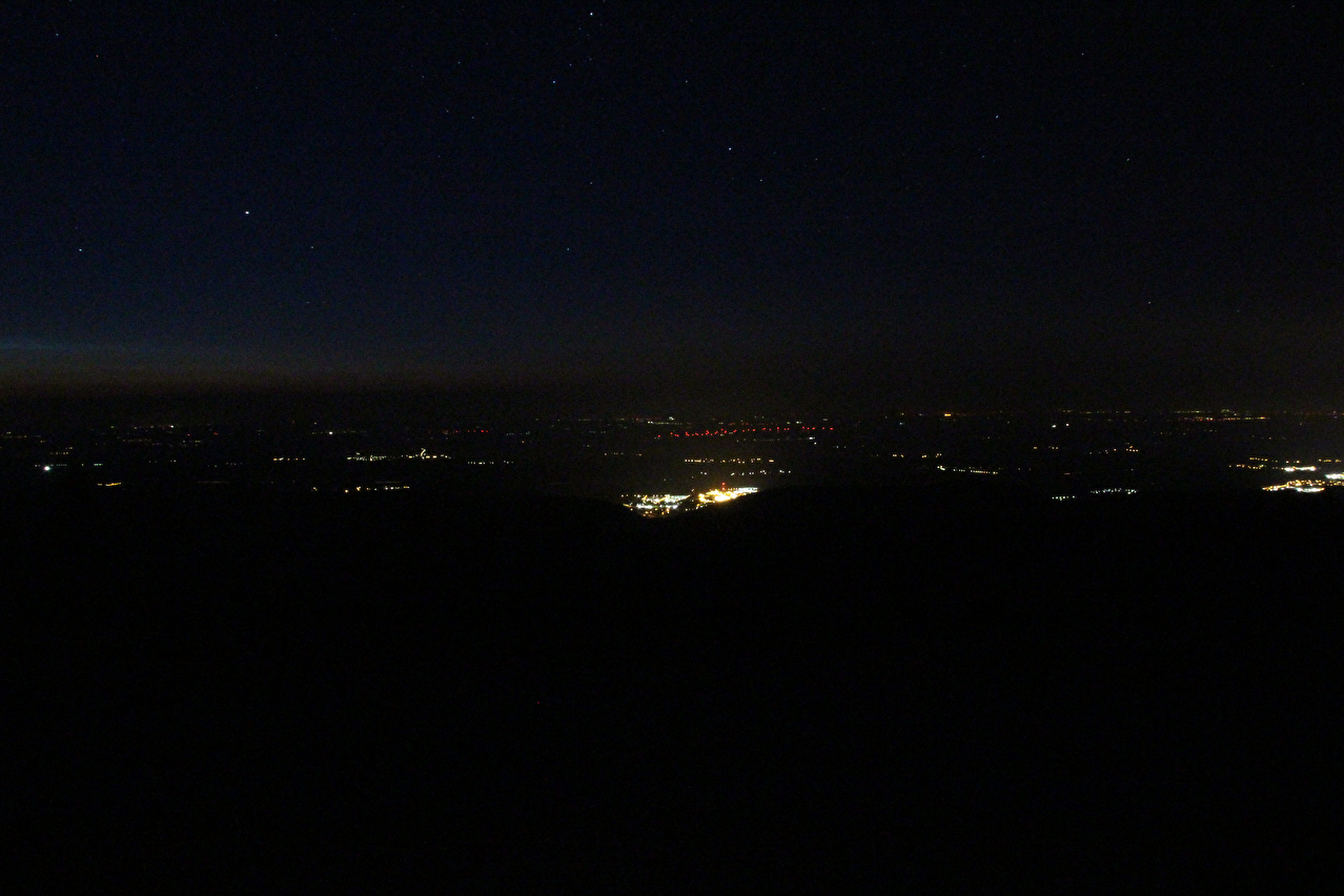 dieser Ausrüstung sind eher ungeeignet für eine Fahrradfahrt auf den Brocken. Dass diese Nacht zwischen den Werktagen Montag und Dienstag lag, bot zwei weitere Vorteile. Zum einen war der Besucherandrang auf dem Brocken extrem übersichtlich, was auch damit zusammenhing, dass um diese Zeit kein Züge mehr auf den Brocken fuhren. Zum anderen bestand nur ein geringes Risiko mit Alkomobilen auf der Straße in Kontakt zu geraten. Dieses Risiko trat auch nicht ein. Der Brockengipfel wurde wenige Minuten nach Mitternacht, also 01:00 MESZ erreicht, das erste Foto von der Mitternachtsdämmerung am Nordhorizont gelang etwa 10 Minuten später. Für das Foto vom "Dach der Tour" wurde der Akku-Frontscheinwerfer vom Fahrrad abgenommen und als Lichtquelle genutzt, um ohne Blitz fotografieren zu können. Reichten während der ersten Fotoserie noch die langen Klamotten, war danach dick einmummeln angesagt. Der Brocken gehört nun mal nicht gerade zu den wärmsten Orten in Norddeutschland. Außerdem stand die lange Abfahrt zurück nach Wernigerode an und bis kurz vor Sonnenaufgang wurde es immer kälter und auch feuchter. Der Wind war in dieser Nacht ausnahmsweise mal kein Thema auf dem Brocken. Von der Abfahrt gibt es keine Bilder, da sonst der erste Zug nach Hannover nicht erreicht worden wäre. Obwohl nur auf Straßen gefahren wurde, wurde das geländegängige Fahrrad gewählt zum einen wegen der Ausstattung mit Scheibenbremsen für die lange Abfahrt und zum anderen für die Option einer Abfahrt nach Bad Harzburg. Weniger schön war die Lichtverschmutzung am Osthang des Brockengipfels. Das Schild der Bahnhofsgaststätte leuchtete großflächig in grellem Weiß Richtung Gipfel. Mitten in der Nacht war das komplett sinnentleert, da die Gaststätte geschlossen war und auch keine Züge den Bahnhof anfuhren. |