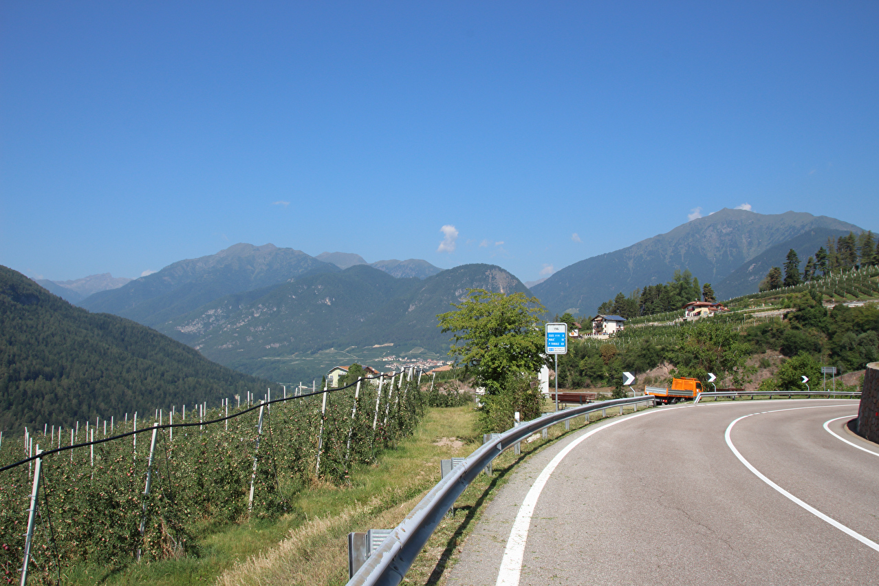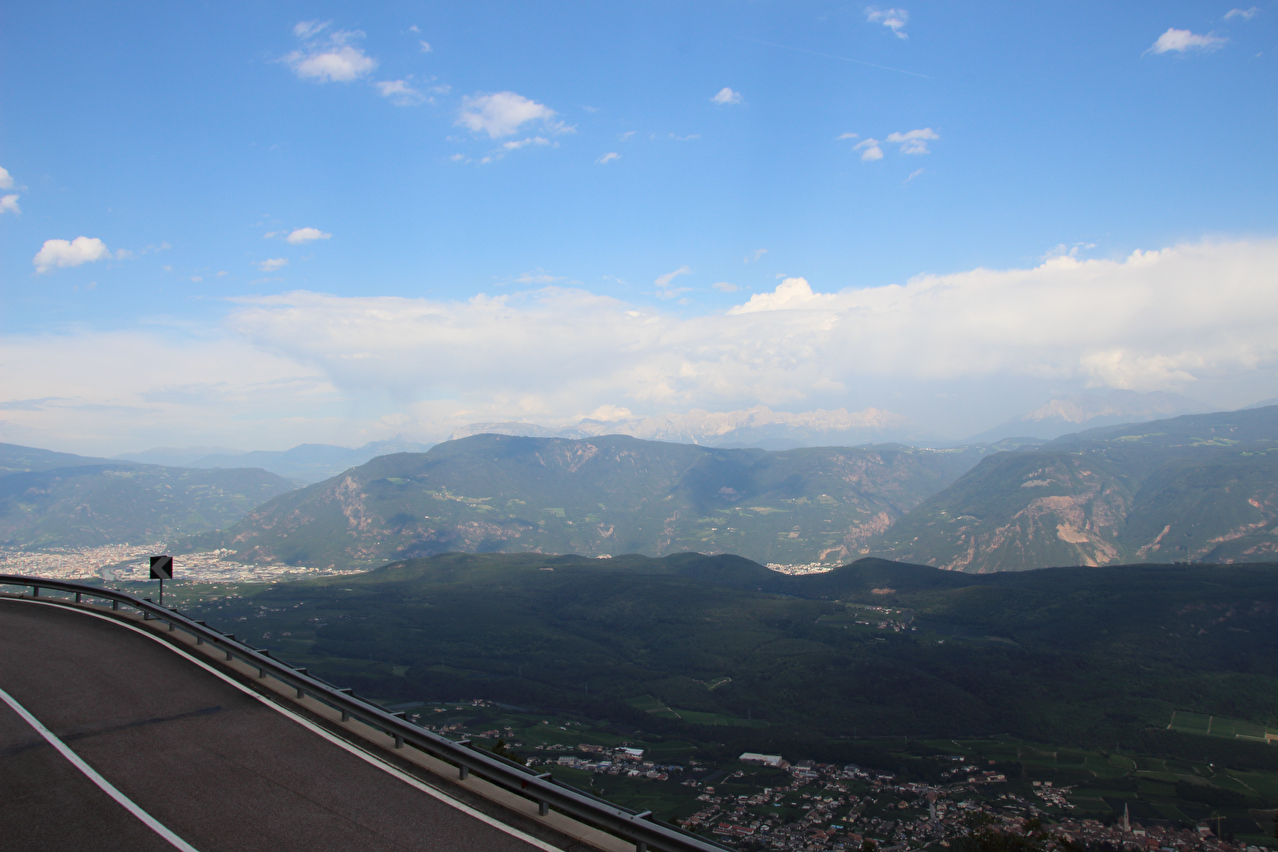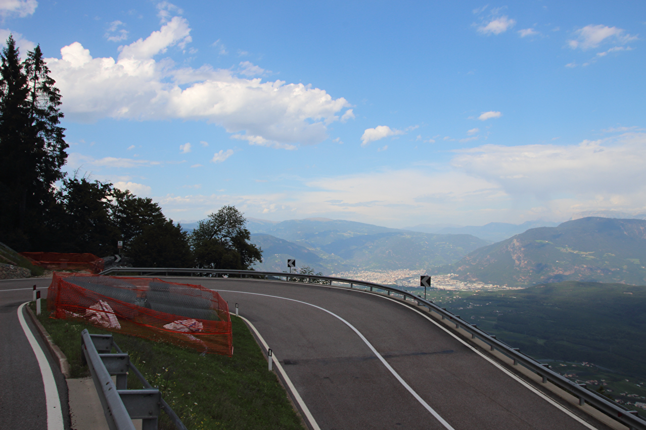 eine Abkühlung blieb natürlich auch aus. Am Ostrand von Mendola verläuft die Grenze zwischen den Provinzen Trentino und Südtirol und damit de jure auch die Sprachgrenze "italienisch – bilingual deutsch & italienisch". De facto wird diese Sprachgrenze aber bereits am Westrand von Mendola überquert. In Mendola wird eine Lösung für das Problem mit den Aufklebern auf den Passhöhenschildern geboten. Das Passhöhenschild selbst ist so hoch montiert, dass es nicht leicht erreichbar ist. Darunter befindet sich eine unbeschriftete, gut erreichbare Blechtafel, auf die die Vollpfosten ihre Bapperl klatschen können. Anders als die Westrampe, die nur bedingt Passstraßengefühl vermittelt, entspricht die Ostrampe dem, was von einer Passtraße zu erwarten ist. Sie windet sich mit 15 Kehren durch die steile Ostflanke des Mendelkamms und bietet im oberen Bereich sehr weite Ausblicke bis zu den Dolomiten. Trotz der geringen Höhe des Mendelpasses liegen zwischen der Passhöhe und dem Talboden des Etschtals über 1000 Höhenmeter. Die Abfahrt auf der Ostrampe verlief zunächst im Schatten. Unterhalb des Überetsch lag dann aber wieder die Sonne auf der Straße. Ab Gand herrschte extrem starker Stinkeverkehr auf der Straße, die aber noch vor Sankt Michael verlassen wurde. Die Weiterfahrt erfolgte auf einem Radweg, der zunächst auf der Trasse der ehemaligen Überetscher Bahn verläuft. Neben zwei Tunneln bot hier auch Wald etwas Schatten. Nahe der Etsch trifft dieser Radweg auf den Etsch-Radweg, womit eine Streckenwiederholung folgte, denn die Strecke von dort bis Bozen war schon einmal am 28.07.2012 gefahren worden. Kurz nach der Überquerung der Etsch westlich von Bozen wurde der tiefstgelegene Punkt dieser Tour auf 242 m s.l.m. erreicht. Dort erfolgte auch der Wechsel vom Etsch-Radweg auf den Eisacktal-Radweg. Die Ortsdurchfahrt durch Bozen zum Quartier im östlich von Bozen gelegenen Rentsch gestaltete sich nach dem notwendigen Verlassen des Eisacktal-Radweges etwas unübersichtlich. Dort angekommen versank die Sonne hinter dem Mendelkamm, womit die Hitze draußen endlich nachließ. im Hotelzimmer unter'm Dach herrschten allerdings knuffige +30 °C, was einer erholsamen Nachtruhe äußerst abträglich war. |