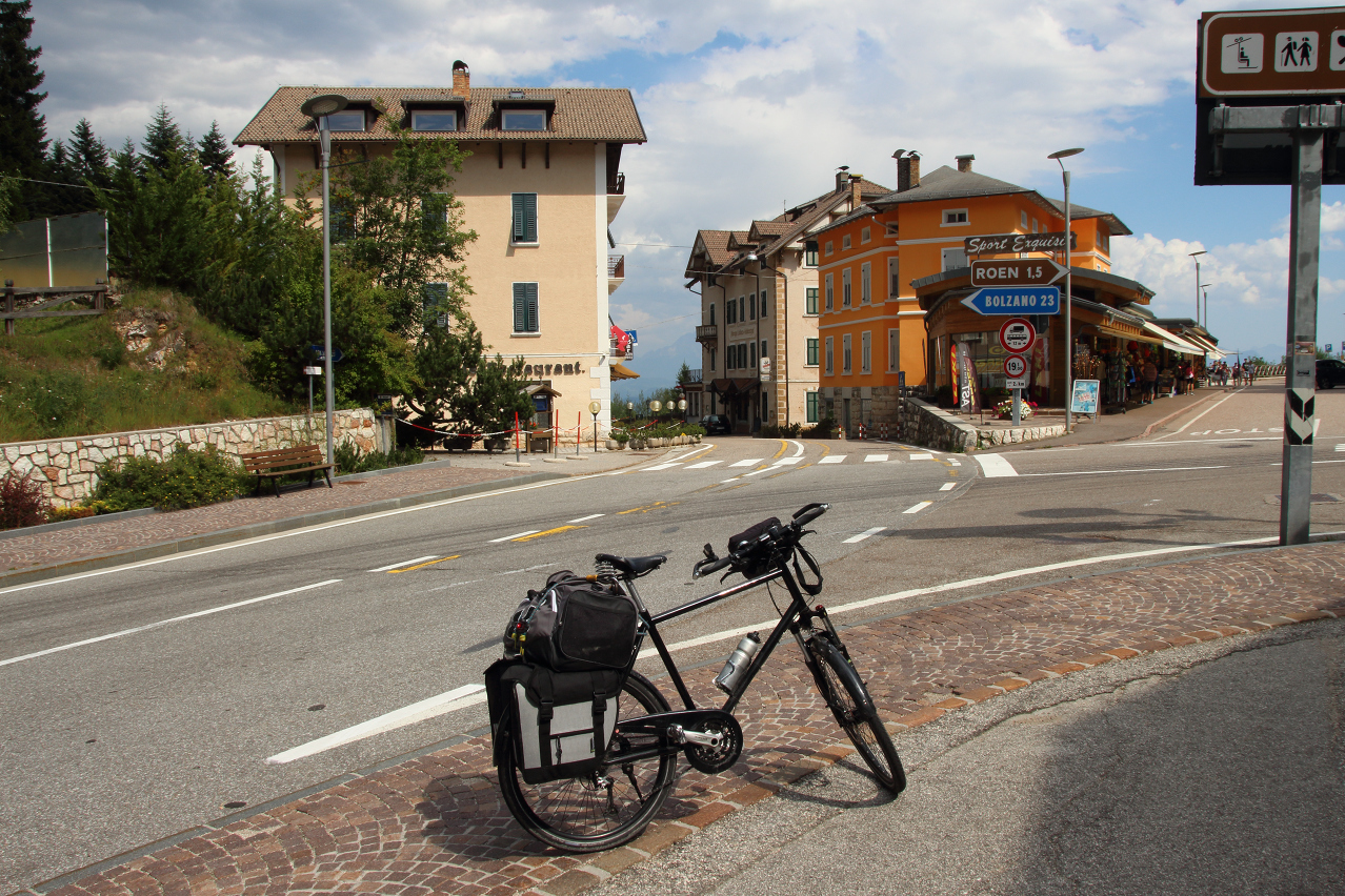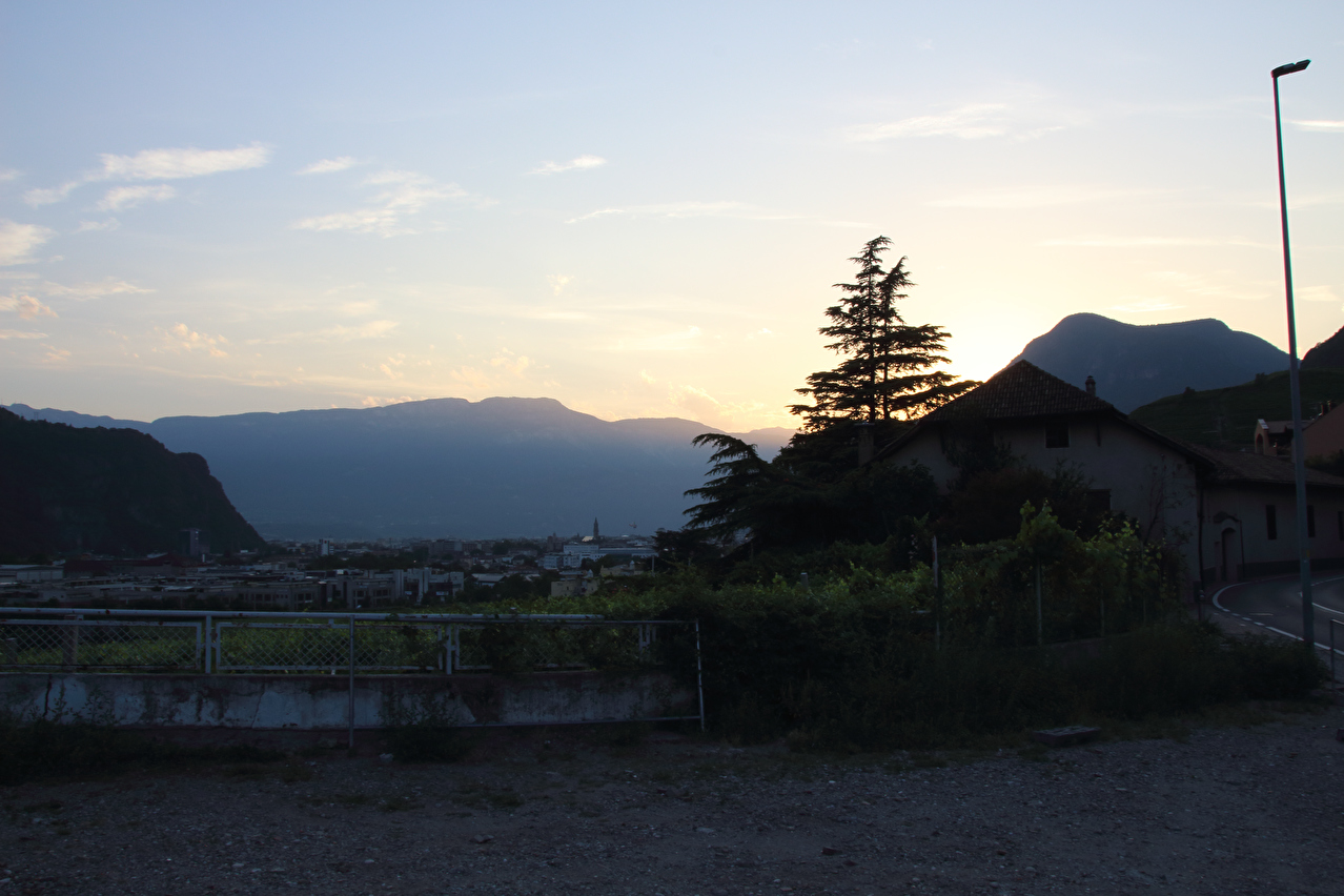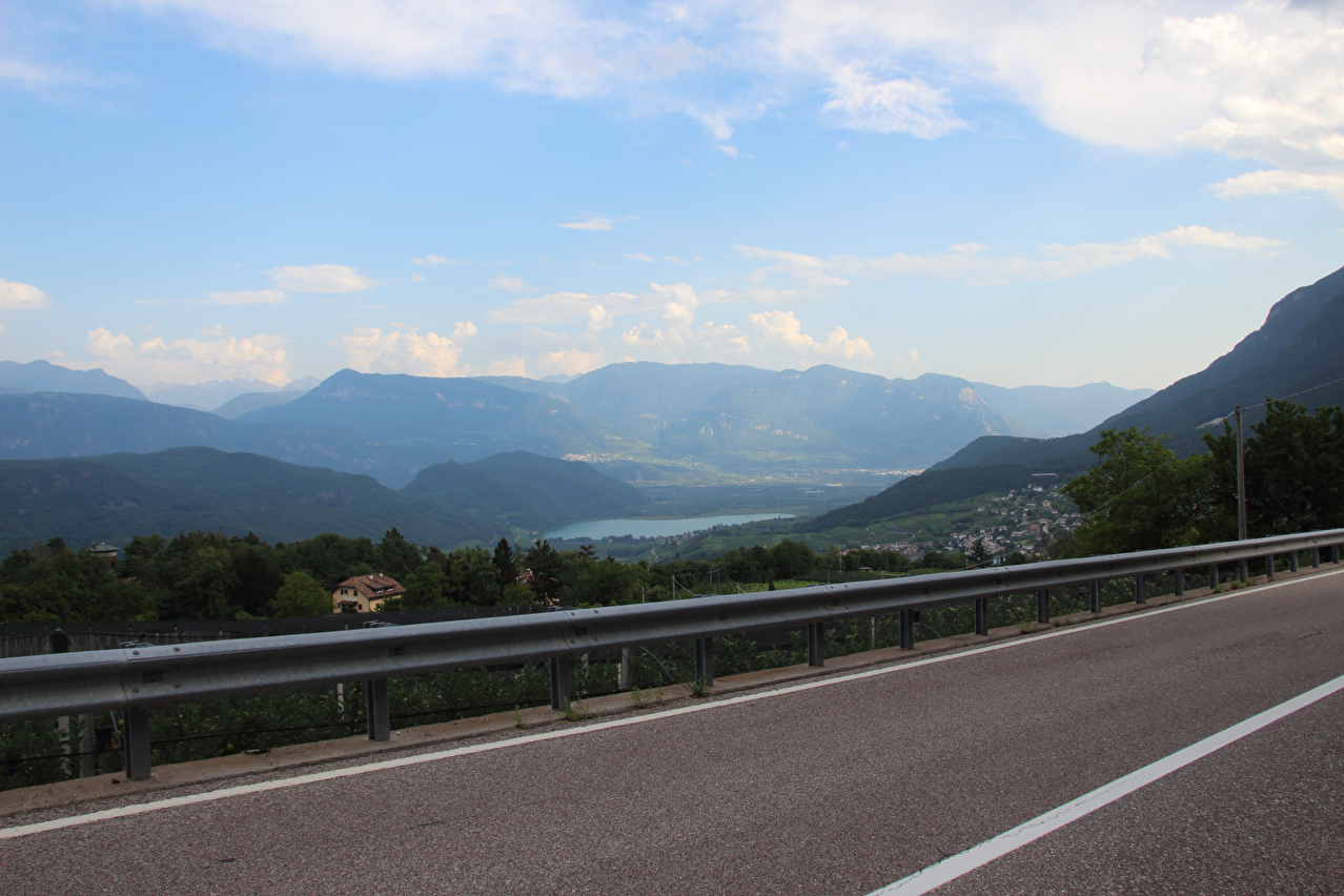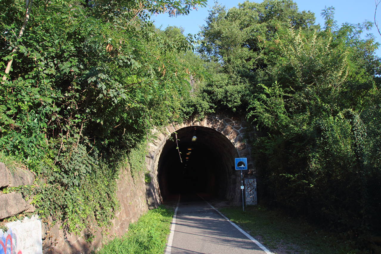 eine Abkühlung blieb natürlich auch aus. Am Ostrand von Mendola verläuft die Grenze zwischen den Provinzen Trentino und Südtirol und damit de jure auch die Sprachgrenze "italienisch – bilingual deutsch & italienisch". De facto wird diese Sprachgrenze aber bereits am Westrand von Mendola überquert. In Mendola wird eine Lösung für das Problem mit den Aufklebern auf den Passhöhenschildern geboten. Das Passhöhenschild selbst ist so hoch montiert, dass es nicht leicht erreichbar ist. Darunter befindet sich eine unbeschriftete, gut erreichbare Blechtafel, auf die die Vollpfosten ihre Bapperl klatschen können. Anders als die Westrampe, die nur bedingt Passstraßengefühl vermittelt, entspricht die Ostrampe dem, was von einer Passtraße zu erwarten ist. Sie windet sich mit 15 Kehren durch die steile Ostflanke des Mendelkamms und bietet im oberen Bereich sehr weite Ausblicke bis zu den Dolomiten. Trotz der geringen Höhe des Mendelpasses liegen zwischen der Passhöhe und dem Talboden des Etschtals über 1000 Höhenmeter. Die Abfahrt auf der Ostrampe verlief zunächst im Schatten. Unterhalb des Überetsch lag dann aber wieder die Sonne auf der Straße. Ab Gand herrschte extrem starker Stinkeverkehr auf der Straße, die aber noch vor Sankt Michael verlassen wurde. Die Weiterfahrt erfolgte auf einem Radweg, der zunächst auf der Trasse der ehemaligen Überetscher Bahn verläuft. Neben zwei Tunneln bot hier auch Wald etwas Schatten. Nahe der Etsch trifft dieser Radweg auf den Etsch-Radweg, womit eine Streckenwiederholung folgte, denn die Strecke von dort bis Bozen war schon einmal am 28.07.2012 gefahren worden. Kurz nach der Überquerung der Etsch westlich von Bozen wurde der tiefstgelegene Punkt dieser Tour auf 242 m s.l.m. erreicht. Dort erfolgte auch der Wechsel vom Etsch-Radweg auf den Eisacktal-Radweg. Die Ortsdurchfahrt durch Bozen zum Quartier im östlich von Bozen gelegenen Rentsch gestaltete sich nach dem notwendigen Verlassen des Eisacktal-Radweges etwas unübersichtlich. Dort angekommen versank die Sonne hinter dem Mendelkamm, womit die Hitze draußen endlich nachließ. im Hotelzimmer unter'm Dach herrschten allerdings knuffige +30 °C, was einer erholsamen Nachtruhe äußerst abträglich war. |