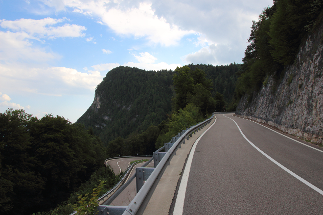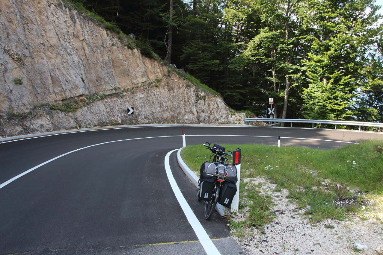 weitgehend in der prallen Sonne. Oberhalb von Malosco bis zur Passhöhe liegt die Westrampe überwiegend im Wald. Dies machte die Fahrt deutlich angenehmer, und die fehlende Aussicht war