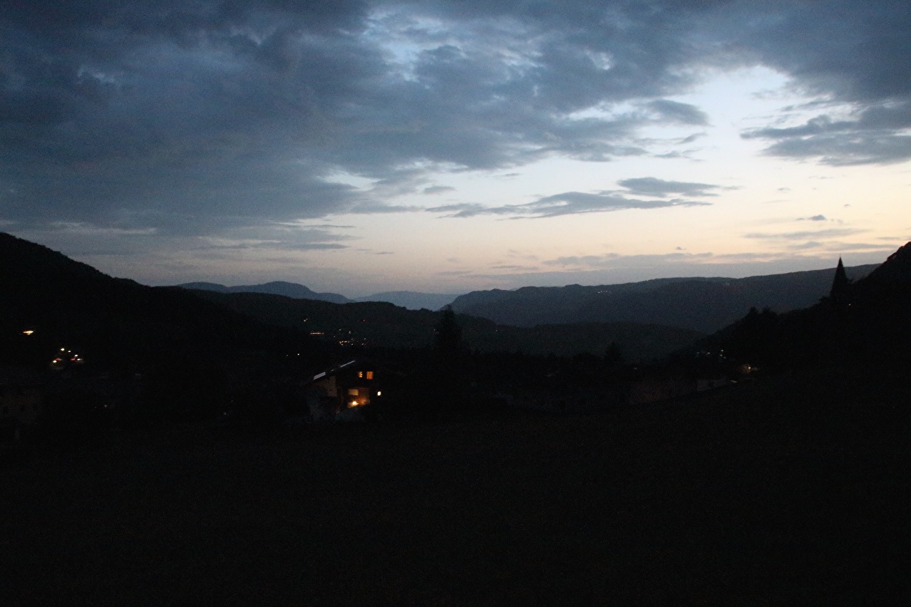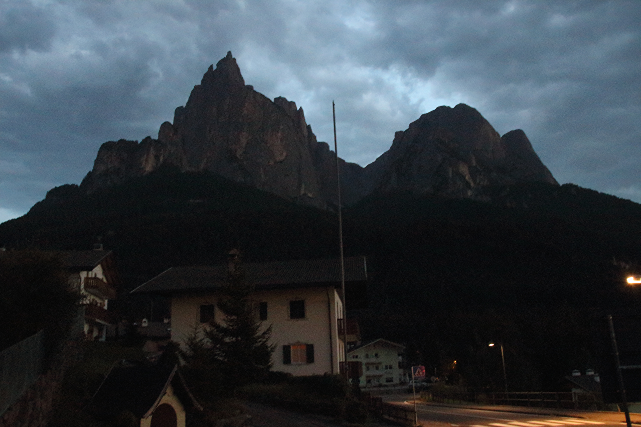 vorsichtig weiter gefahren. Die allfällige Reparatur erfolgte gleich nach der Ankunft im Quartier in einer nahegelegenen Fahrradwerkstatt am Ortsrand. Zum Abend hin hatte der tagüber mitunter extreme Stinkeverkehr endlich nachgelassen. Dafür wurde es im Ort noch einmal laut. Eine Blaskapelle gab dort ein "umsonst & draußen"-Konzert. Nach zwei Stücken aus der Rubrik "muss nicht" kam die Kapelle in Gang und präsentierte ein ansprechendes Programm jenseits von Traditionsmärschen und Volksmusik. Nur die Ansagen zwischen den Stücken wirkten mitunter etwas langatmig, da die durchweg bilingual in deutscher und italienischer Sprache erfolgten, aber das gehört heutzutage in Südtirol dazu. Anders als am Tag zuvor in Rentsch bei Bozen, wo es auch über Nacht heiß blieb, sank in Seis am Schlern aufgrund seiner höheren Lage und dem Fehlen eines engen Talkessels die Temperatur nach Sonnenuntergang allmählich in den einigermaßen erträglichen Bereich. Im Verlauf der Etappe zeigte sich der Schlern als sehr "wandlungsfähiger" Berg. Die bekannte Perspektive aus dem Etschtal zeigt einen massiven Berg ohne ausgeprägten Gipfel mit einer nördlich vorgelagerten Spitze, der meist als "der Schlern" bezeichnet wird. Mit der Annäherung an den Berg weicht diese Perspektive allmählich einem immer detaillierteren Bild, das zunehmend einen für die Dolomiten typischen Berg mit "abgesägten" Gipfeln, von denen der Schlern aus der Nahperspektive nur einer ist, und Felsspitzen darunter zeigt. Ansonsten wirkt die Landschft oberhalb des Eisacktals mitunter wenig alpin, so etwa die Rittner Hochfläche. |