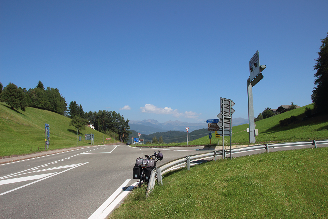 unplanmäßiges "Dach der Etappe": Abzweig der Seiseralmstraße zwischen Seis am Schlern und Telfen ![]() 300 dpi JPEG |