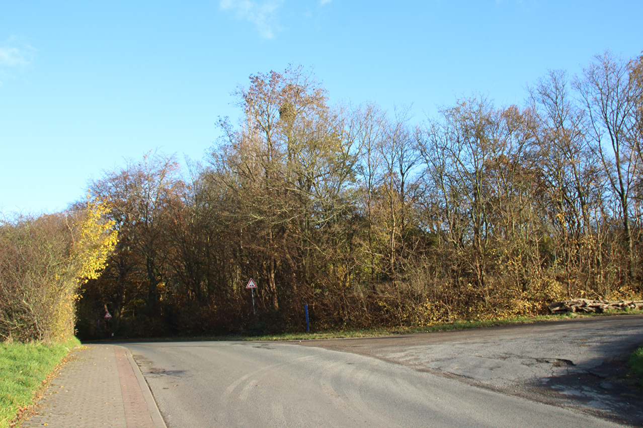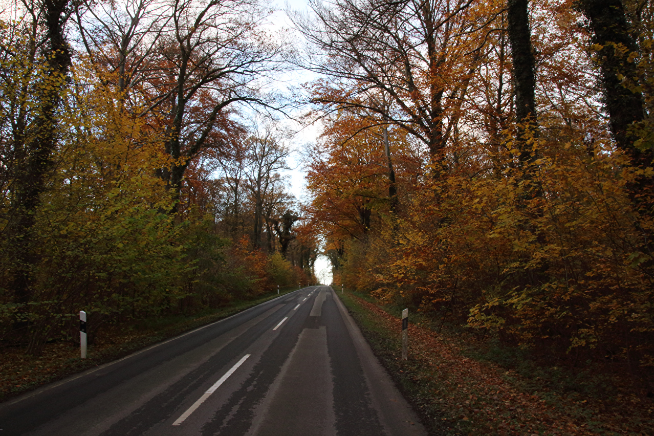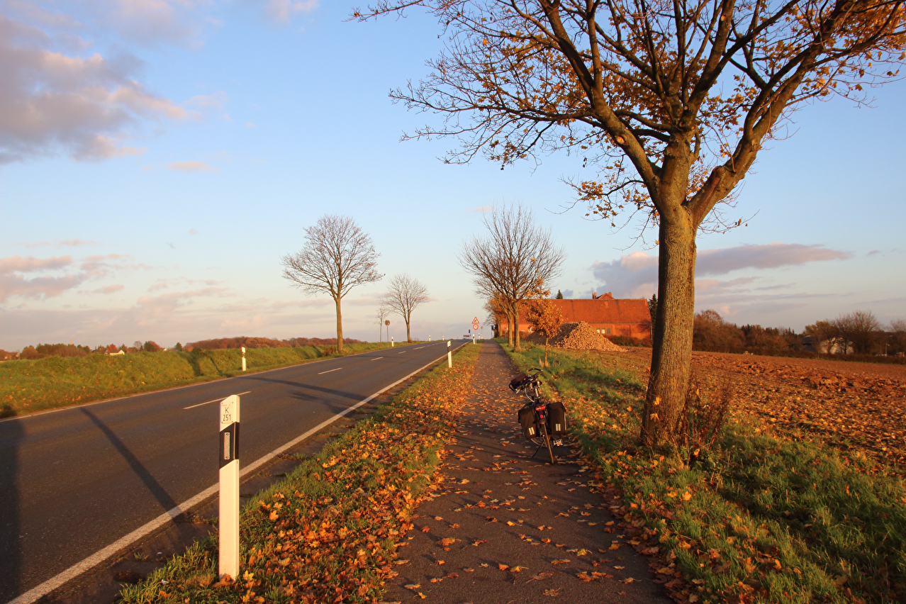 Beschreibung | Nach mehreren verregneten Wochenenden bot dieser Tag nochmal die Gelegenheit zu einer kurzen Runde. Für eine größere Tour war es zu kalt und auch zu unbeständig. Zudem waren die nicht befestigten Wege sehr matschig. Da es noch keine Nachtfröste gegeben hatte, hing noch relativ viel Laub an den Bäumen, während sich die Sträucher ihrer Blätter schon mehrheitlich entledigt hatten. Außerhalb der Wälder zeigte sich die Landschaft als öde Agrarwüste. Obwohl es vor Ort sehr klar war, reichte die Fernsicht an diesem Tag nicht bis zum Brocken im Harz. |
