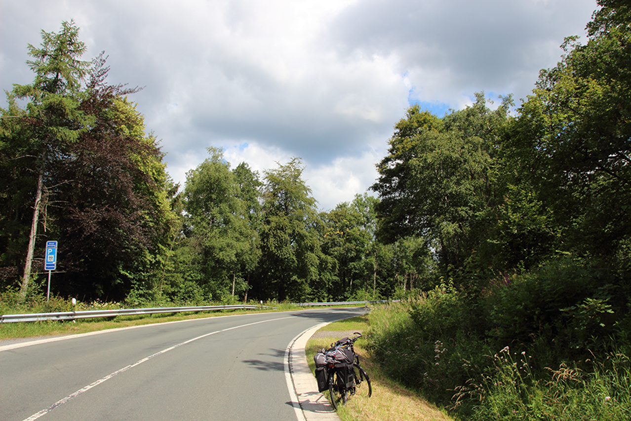 Beschreibung | Das Sommerwetter hielt, und die Regenbremsen ließen natürlich auch nicht lang auf sich warten. An diesem Tag stand die Königsetappe auf dem Plan. In Brachthausen erfolgte der erste Wechsel auf einen Radweg bis Kirchhundem. Neben reichlich welligem Profil bot die Etappe mit dem Anstieg von Kirchhundem zum Rhein-Weser-Turm einen längeren Anstieg. Dieser Streckeabschnitt war bereits am 29.06.2016 gefahren worden, aber die für Mittelgebirgsverhältnisse kehrenreiche Strecke wurde trotzdem nicht langweilig. In Wingeshausen erfolgte nicht zuletzt aufgrund einer etwas unübersichtlichen Beschilderung im Ort der nächste Wechsel auf einen Radweg Richtung Jagdhaus. Das war ein Fehler! Zunächst steigt dieser Radweg auf asphaltierter Strecke moderat an, aber dann wechselt der Belag abrupt auf groben, losen Schotter. Und genau hier beginnt eine Steigung im durchgängig zweistelligen Prozentbereich mit bis zu 21 %. Mit dem beladenen Reiserad ist dieser Abschnitt nicht mehr sinnvoll befahrbar. Deshalb wurde nach dem ersten Stillstand in der Steigung geschoben. Waren die zuvor genutzten Radwege nahezu alle vorbildlich ausgeschildert, fehlte in Wingeshausen jeglicher Hinweis auf den Abschnitt mit dem sehr schlechten Belag und der starken Steigung. Bis Winkhausen wurde weiter auf Radwegen gefahren. Da ab dort aber wieder schlechter Belag zu sehen war, wurde in Winkhausen für den Rest der Etappe auf die Straße gewechselt. Wegen der schon etwas vorgerückten Uhrzeit wurde in Oberkirchen zum Abendessen eingekehrt. Das Etappenziel wurde dem entsprechend spät gegen 20:15 MESZ erreicht. |