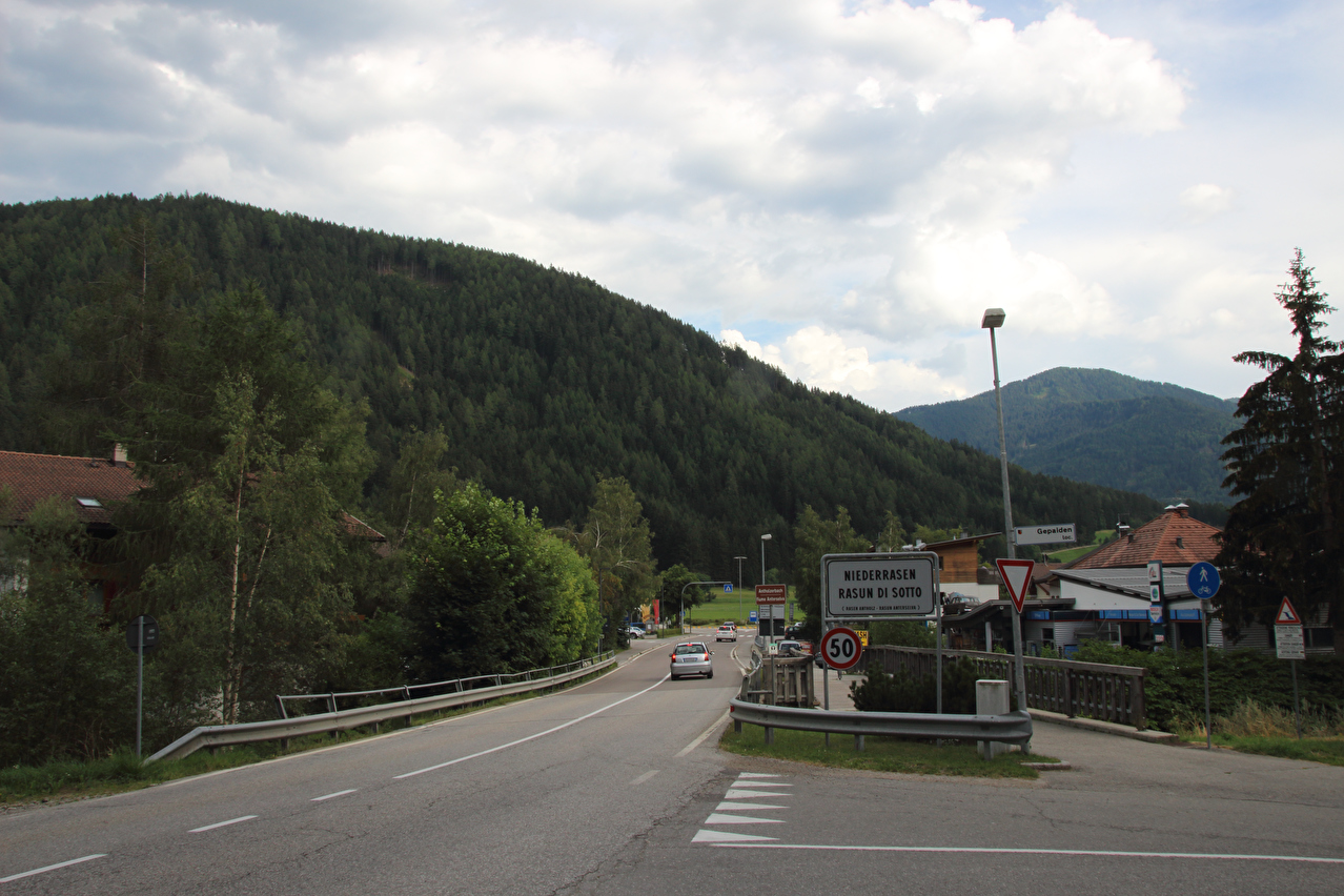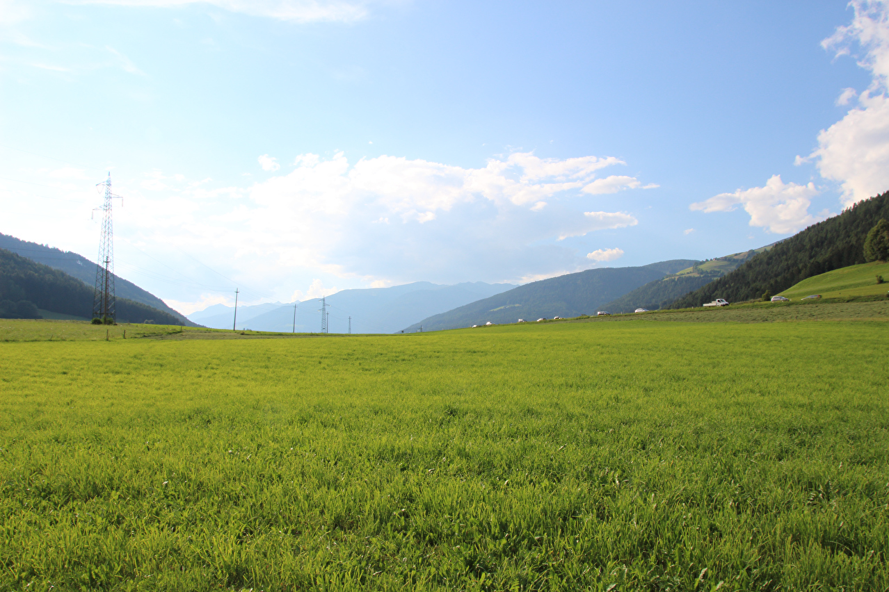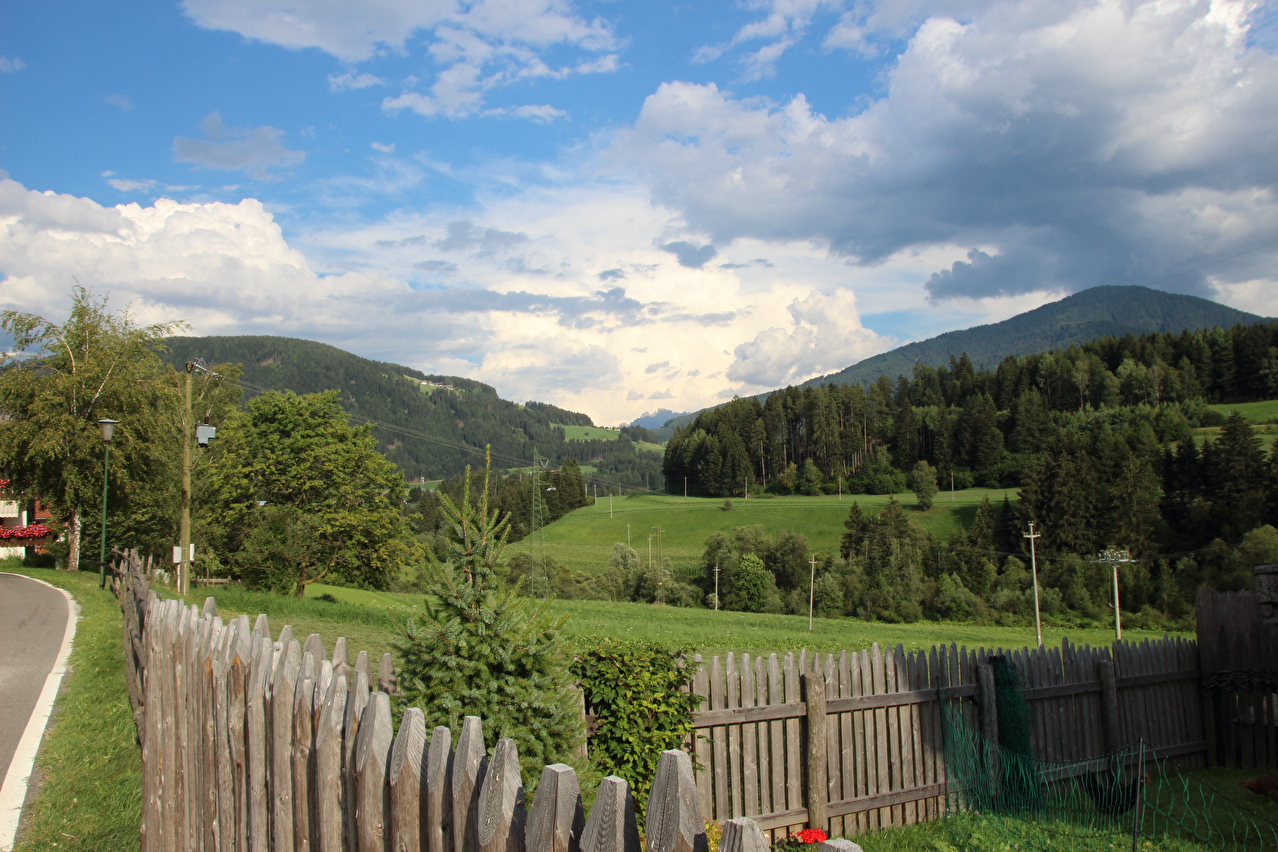 Blick talabwärts auf Oberrasen und die Pragser Dolomiten am Horizont ![]() 300 dpi JPEG |