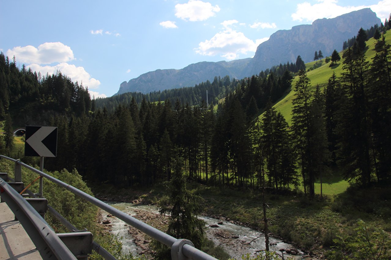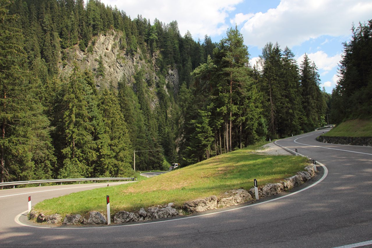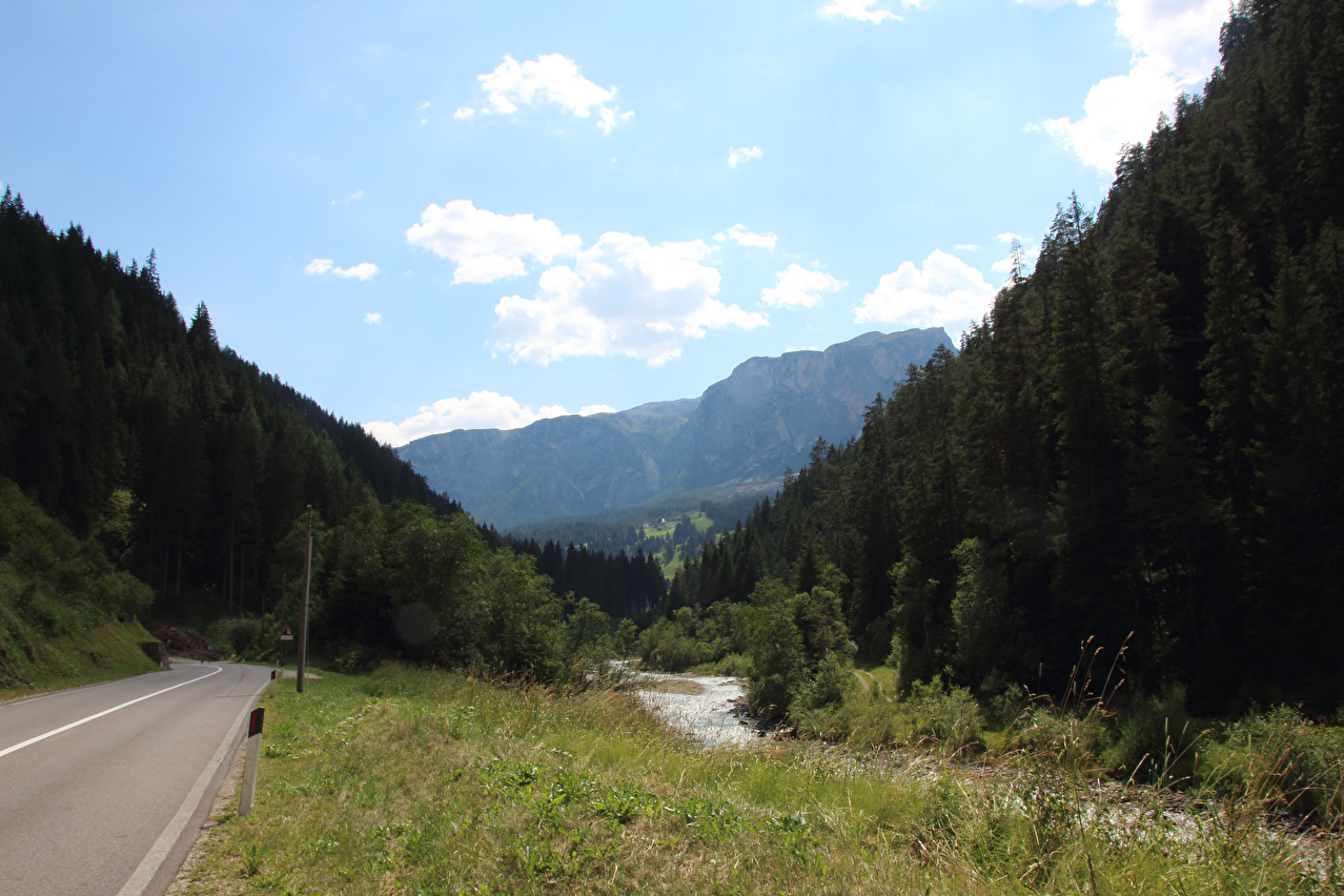 Beschreibung | Diese Etappe setzte die inverse Streckenwiederholung der fünften und sechsten Etappe bis Sankt Lorenzen fort. Dort erfolgte der Wechsel ins Gadertal. Der Streckenabschnitt von der Kreuzung des Pustertal Radweges mit der Gadertalstraße bis nach Stern war eine Streckenwiederholung und inverse Streckenwiederholung. In der selben Richtung war dieser Streckenabschnitt am 27.07.2010 gefahren worden, in der Gegenrichtung am 05.08.2014. Anders als am 27.07.2010 wurde auf die Umfahrungen der unteren Tunnel im Gadertal verzichtet, da die alte Straße laut Beschilderung nicht mehr dafür vorgesehen ist. Bei der ins Tal drückenden Sonne und der im Tal stehenden Hitze boten die Tunnel zudem etwas Abkühlung. In Stern wurde nach St. Kassian abgebogen. Die Straße fällt in Stern steil bis auf die Talsohle ab und steigt nach Überquerung der Gader wieder stramm an, wobei einige Kehren in diesem Bereich die Steigung wenigstens etwas reduzieren. Mit St. Kassian wurde die zweite Bergankunft im Rahmen dieser Tour erreicht. Der Ort liegt im Hang. Während einige Straßen im Ort mehr oder weniger parallel zum Hang verlaufen, verlaufen andere Straßen mehr oder weniger in direkter Falllinie mit Gradienten im deutlich zweistelligen Prozentbereich. Auf diesen Sraßen war Schieben angesagt. Während des Abendessens in St. Kassian zogen vermehrt dunkle Wolken auf. Das restaurantlose Quartier wurde gerade noch rechtzeitig erreicht. Etwas später setzte Regen ein, der sich zu einem Gewitter mit Starkregen intensivierte. |