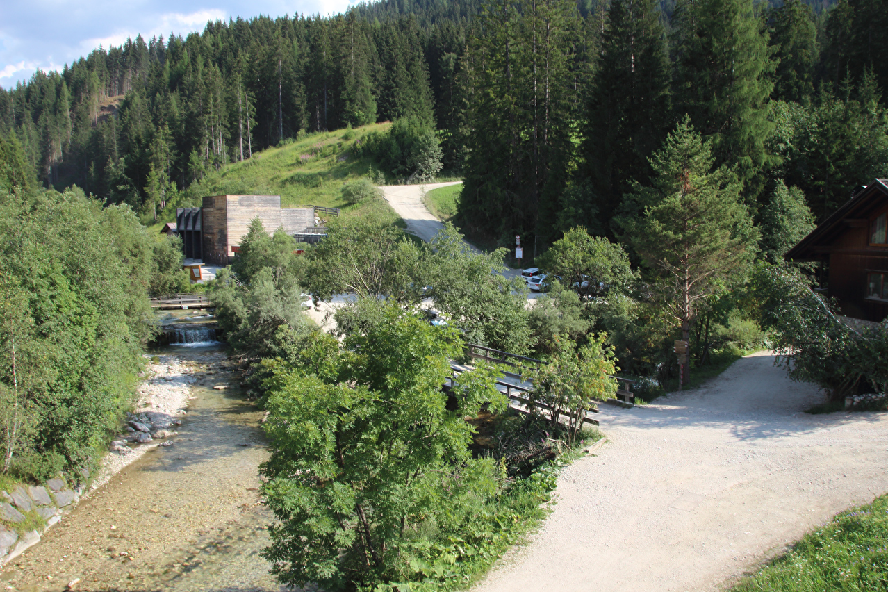 … und Blick flussaufwärts auf die Mündung des St. Kassianer Bachs (links) in die Gader ![]() 300 dpi JPEG |