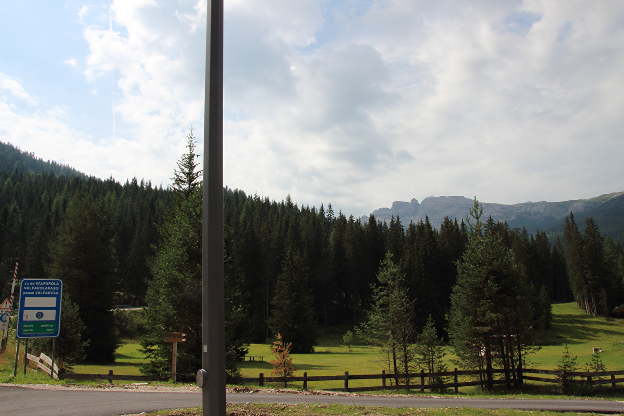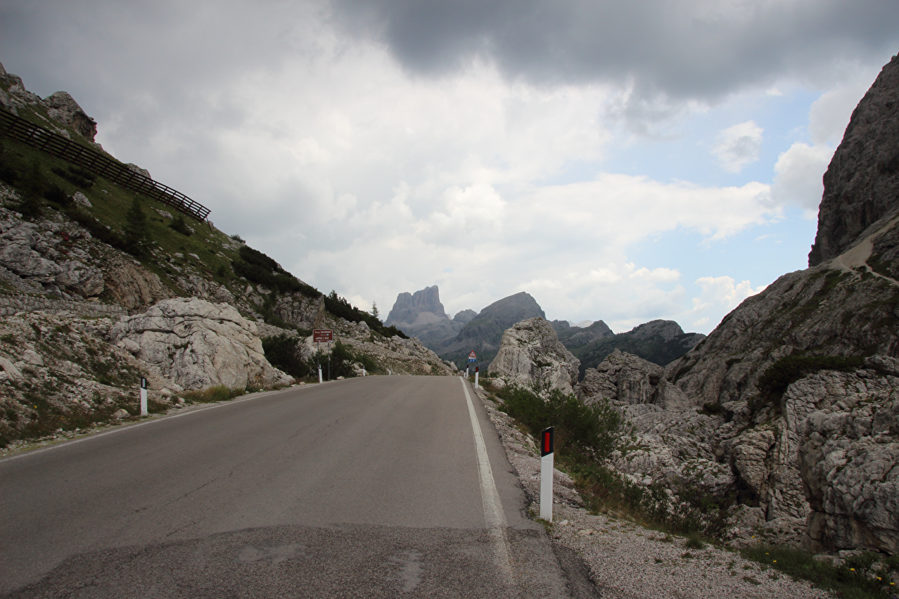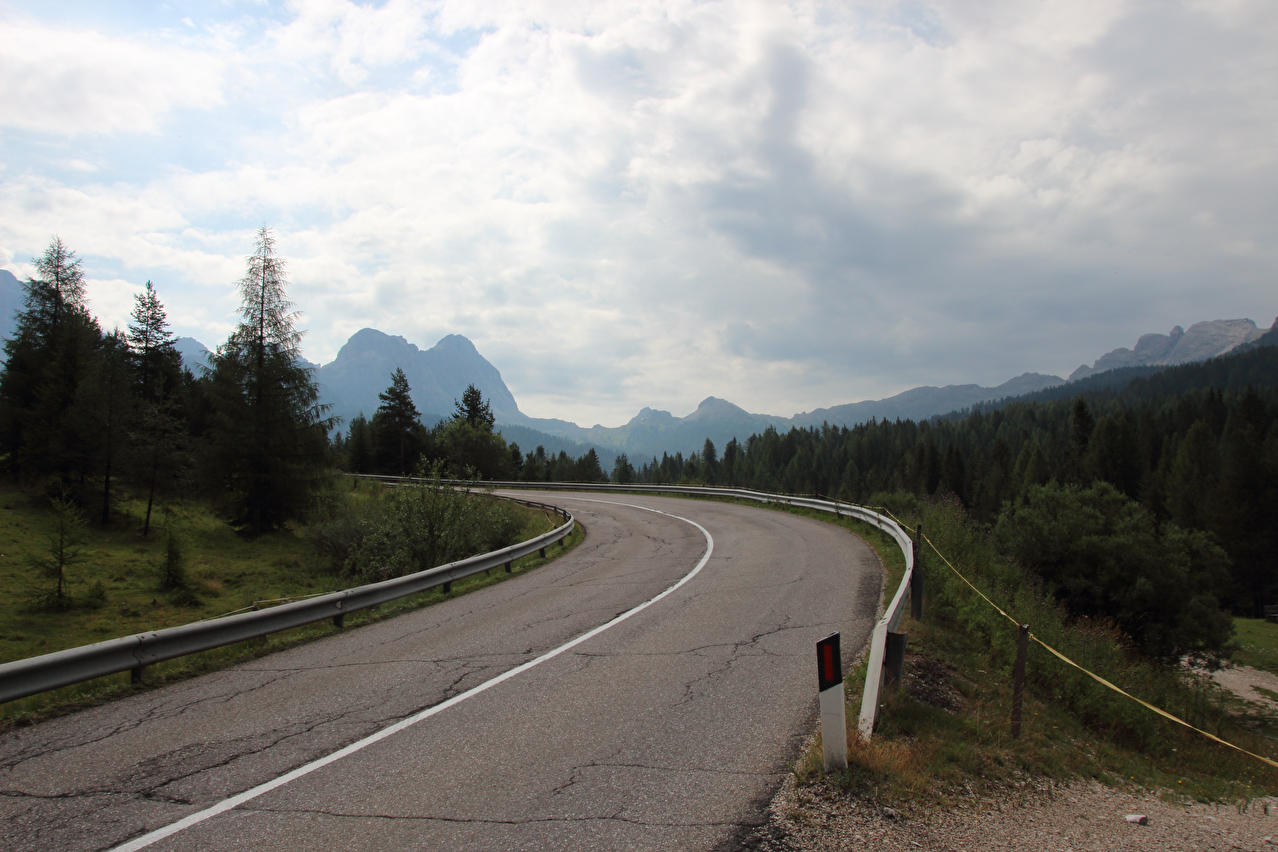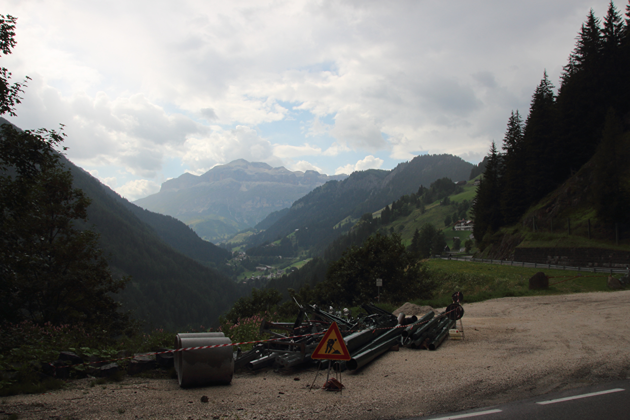 Beschreibung | An diesem Tag stand die Königsetappe auf dem Tourplan. Der Regen hatte sich über Nacht verzogen und zum Etappenstart begann die Sonne sich durch die Wolken zu fressen. So verlief auch diese Etappe zunächst bei viel Sonne, aufgrund der Höhe aber ohne die Hitze der Vortage. Von der Nordrampe fällt der Blick immer wieder auf die Gruppo del Sella und die Puezgruppe, die beide von zumindest einem eiszeitlichen Gletscher "abgehobelt" wurden und daher keine der sonst in den Alpen so typischen spitzen Gipfel aufweisen. Auf den letzten Kilometern bis zum Rifugio Valparola steigt die Nordrampe des Passo di Valparola allmählich immer stärker an. Dadurch wurde der richtige Punkt zum Wechsel von Fahren auf Schieben verpasst und eine Speiche im Hinterrad riss. Der Rest des Steilstücks wurde daher hoch geschoben, denn mit einer gerissenen Speiche kann weiter gefahren werden, solange auf die Fahrt bergauf in Steilstücken und bergab mit hoher Geschwindigkeit verzichtet wird. Mit zwei gerissenen Speichen sieht das schon viel schlechter aus. Im oberen Bereich der Nordrampe verläuft die Grenze zwischen Südtirol (Autonome Provinz Bozen – Südtirol) und dem Belluno (Provincia Belluno). Das Rifugio Valparola steht auf der Wasserscheide zwischen Etsch und Piave und markiert somit die eigentliche Passhöhe des Passo di Valparola. Die Straße steigt danach jedoch noch etwas weiter an, und auch auf der beschilderten Passhöhe des Passo di Valparola gibt es keinen niedrigeren Punkt, über den die Straße hätte führen können. Kurz nach Überquerung der Passhöhe des Passo di Valparola fiel der Blick auf die Passhöhe des Passhöhe Falzarego, über den Regen aufzog. Die ersten Tropfen ließen nicht lange auf sich warten und die Temperatur fiel in dieser Höhe rasch ab. Daher wurde "Vollschutz" angelegt, um nicht auszukühlen, da die Dauer des Regens nicht absehbar war. Die Passhöhe des Passhöhe Falzarego wurde nun schon zum dritten Mal und jedes Mal aus einer anderen Richtung erreicht. Das ist nur möglich, da die extrem kurze Südrampe des Passo di Valparola auf der Passhöhe des Passo Falzarego endet. Am 30.07.2010 wurde der Passo Falzarego von Westen nach Osten überquert, am 03.08.2014 von Osten nach Westen. Alle drei Aufenthalte auf der Passhöhe des Passo Falzarego hatten eine Gemeinsamkeit. Es regnete! Mit der Abfahrt von der Passhöhe bis Cernadoi erfolgte logischerweise eine inverse Streckenwiederholung und eine Streckenwiederholung. Der Regen endete bereits kurz nach Beginn der Abfahrt, sodass die Regenklamotten wieder abgelegt werden konnten. Ab Andraz ging es wieder bergauf. Bis Arabba lagen allerdings zwischen Pieve und Liviné sowie bei Renaz zwei Streckenabschnitte, auf denen spürbar Höhenmeter verloren wurden, die anschließend wieder hoch gefahren werden mussten. Bei Pieve kam ein weiterer Regenschauer nieder, gegen den aber die Regenjacke reichte. Die dritte und letzte Bergankunft im Rahmen dieser Tour erfolgte in Arabba rechtzeitig genug, um die gerissene Speiche im Hinterrad ersetzen zu lassen. Die Fahrradwerkstätten im Alpenraum sind offenbar größtenteils darauf eingerichtet, kleinere Reparaturen, sofern gegebenenfalls notwendige Ersatzteile verfügbar sind, sofort zu erledigen. Über Arabba hatten sich bei der Ankunft zwar reichlich Wolken versammelt, es blieb aber trocken. |
