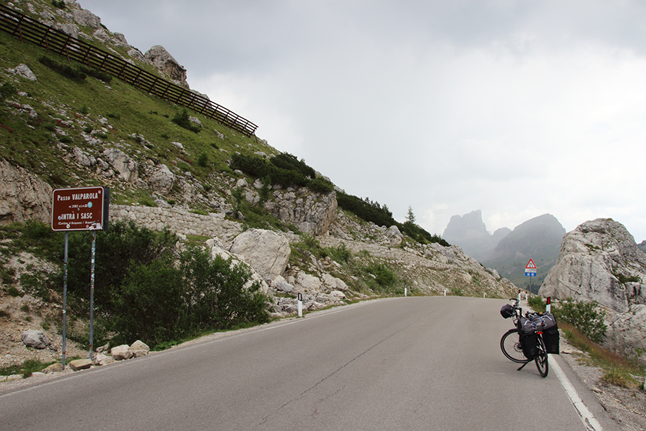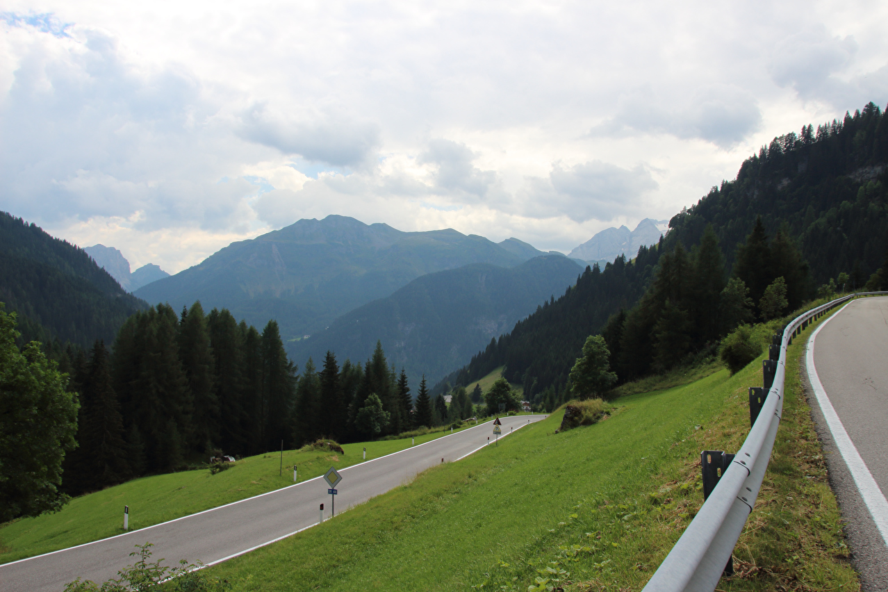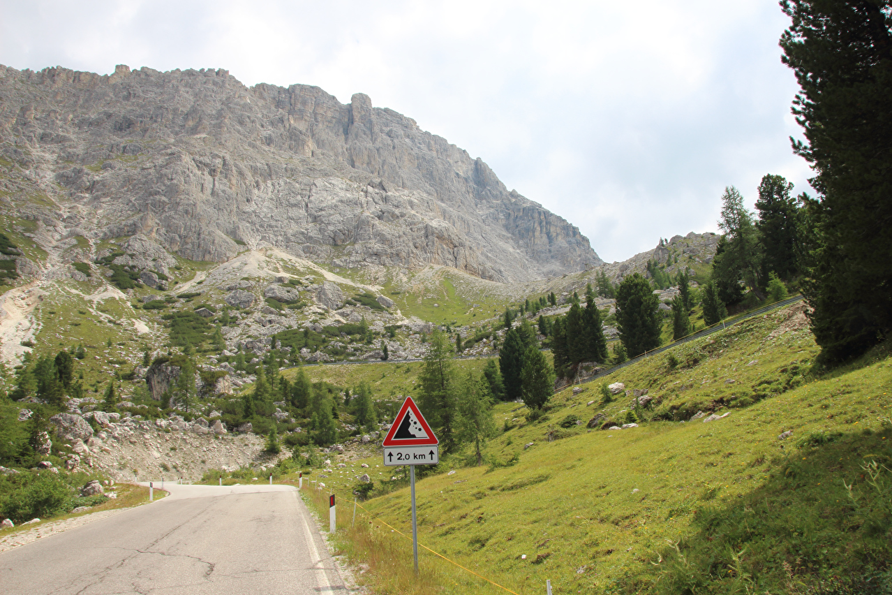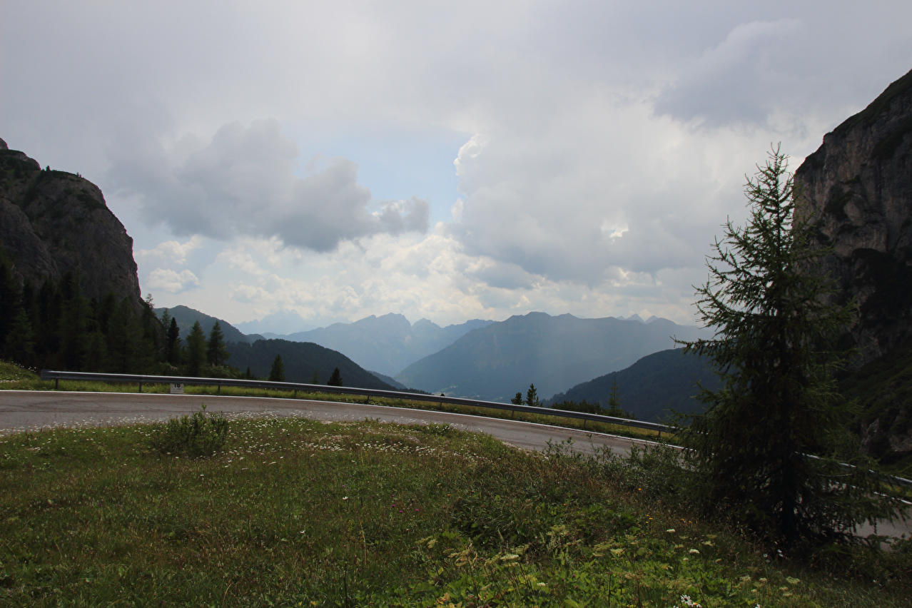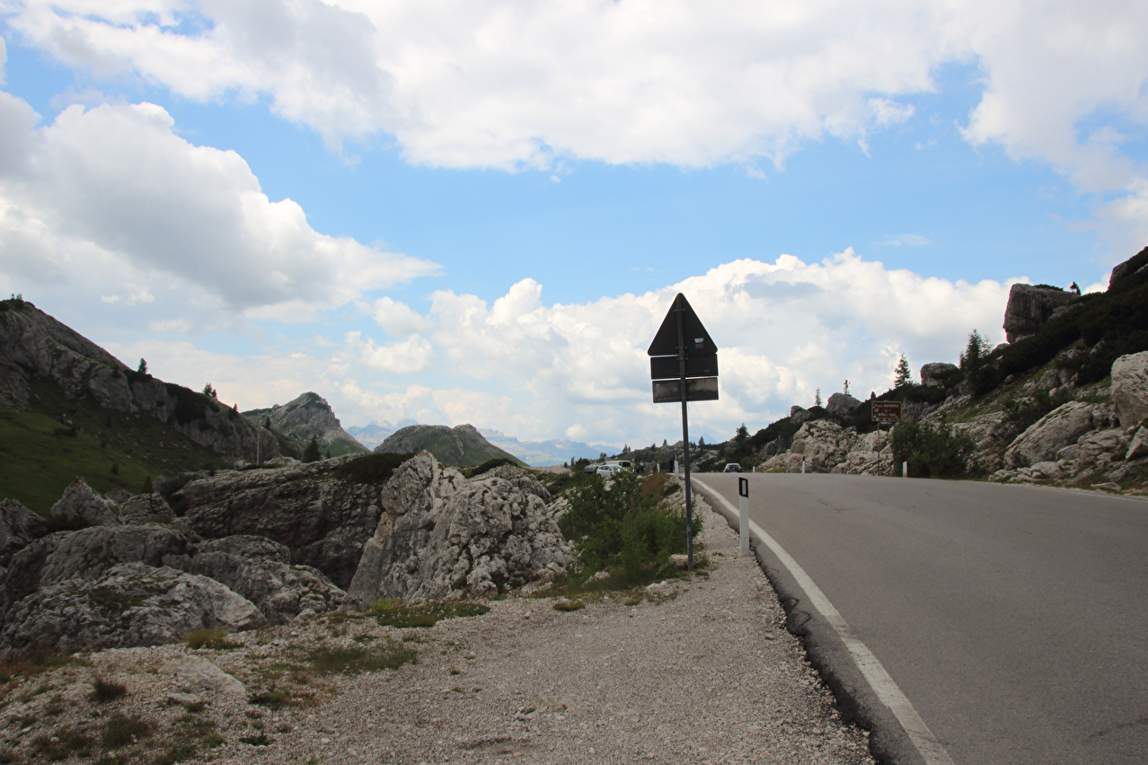Beschreibung | An diesem Tag stand die Königsetappe auf dem Tourplan. Der Regen hatte sich über Nacht verzogen und zum Etappenstart begann die Sonne sich durch die Wolken zu fressen. So verlief auch diese Etappe zunächst bei viel Sonne, aufgrund der Höhe aber ohne die Hitze der Vortage. Von der Nordrampe fällt der Blick immer wieder auf die Gruppo del Sella und die Puezgruppe, die beide von zumindest einem eiszeitlichen Gletscher "abgehobelt" wurden und daher keine der sonst in den Alpen so typischen spitzen Gipfel aufweisen. Auf den letzten Kilometern bis zum Rifugio Valparola steigt die Nordrampe des Passo di Valparola allmählich immer stärker an. Dadurch wurde der richtige Punkt zum Wechsel von Fahren auf Schieben verpasst und eine Speiche im Hinterrad riss. Der Rest des Steilstücks wurde daher hoch geschoben, denn mit einer gerissenen Speiche kann weiter gefahren werden, solange auf die Fahrt bergauf in Steilstücken und bergab mit hoher Geschwindigkeit verzichtet wird. Mit zwei gerissenen Speichen sieht das schon viel schlechter aus. Im oberen Bereich der Nordrampe verläuft die Grenze zwischen Südtirol (Autonome Provinz Bozen – Südtirol) und dem Belluno (Provincia Belluno). Das Rifugio Valparola steht auf der Wasserscheide zwischen Etsch und Piave und markiert somit die eigentliche Passhöhe des Passo di Valparola. Die Straße steigt danach jedoch noch etwas weiter an, und auch auf der beschilderten Passhöhe des Passo di Valparola gibt es keinen niedrigeren Punkt, über den die Straße hätte führen können. Kurz nach Überquerung der Passhöhe des Passo di Valparola fiel der Blick auf die Passhöhe des Passhöhe Falzarego, über den Regen aufzog. Die ersten Tropfen ließen nicht lange auf sich warten und die Temperatur fiel in dieser Höhe rasch ab. Daher wurde "Vollschutz" angelegt, um nicht auszukühlen, da die Dauer des Regens nicht absehbar war. Die Passhöhe des Passhöhe Falzarego wurde nun schon zum dritten Mal und jedes Mal aus einer anderen Richtung erreicht. Das ist nur möglich, da die extrem kurze Südrampe des Passo di Valparola auf der Passhöhe des Passo Falzarego endet. Am 30.07.2010 wurde der Passo Falzarego von Westen nach Osten überquert, am 03.08.2014 von Osten nach Westen. Alle drei Aufenthalte auf der Passhöhe des Passo Falzarego hatten eine Gemeinsamkeit. Es regnete! Mit der Abfahrt von der Passhöhe bis Cernadoi erfolgte logischerweise eine inverse Streckenwiederholung und eine Streckenwiederholung. Der Regen endete bereits kurz nach Beginn der Abfahrt, sodass die Regenklamotten wieder abgelegt werden konnten. Ab Andraz ging es wieder bergauf. Bis Arabba lagen allerdings zwischen Pieve und Liviné sowie bei Renaz zwei Streckenabschnitte, auf denen spürbar Höhenmeter verloren wurden, die anschließend wieder hoch gefahren werden mussten. Bei Pieve kam ein weiterer Regenschauer nieder, gegen den aber die Regenjacke reichte. Die dritte und letzte Bergankunft im Rahmen dieser Tour erfolgte in Arabba rechtzeitig genug, um die gerissene Speiche im Hinterrad ersetzen zu lassen. Die Fahrradwerkstätten im Alpenraum sind offenbar größtenteils darauf eingerichtet, kleinere Reparaturen, sofern gegebenenfalls notwendige Ersatzteile verfügbar sind, sofort zu erledigen. Über Arabba hatten sich bei der Ankunft zwar reichlich Wolken versammelt, es blieb aber trocken. |