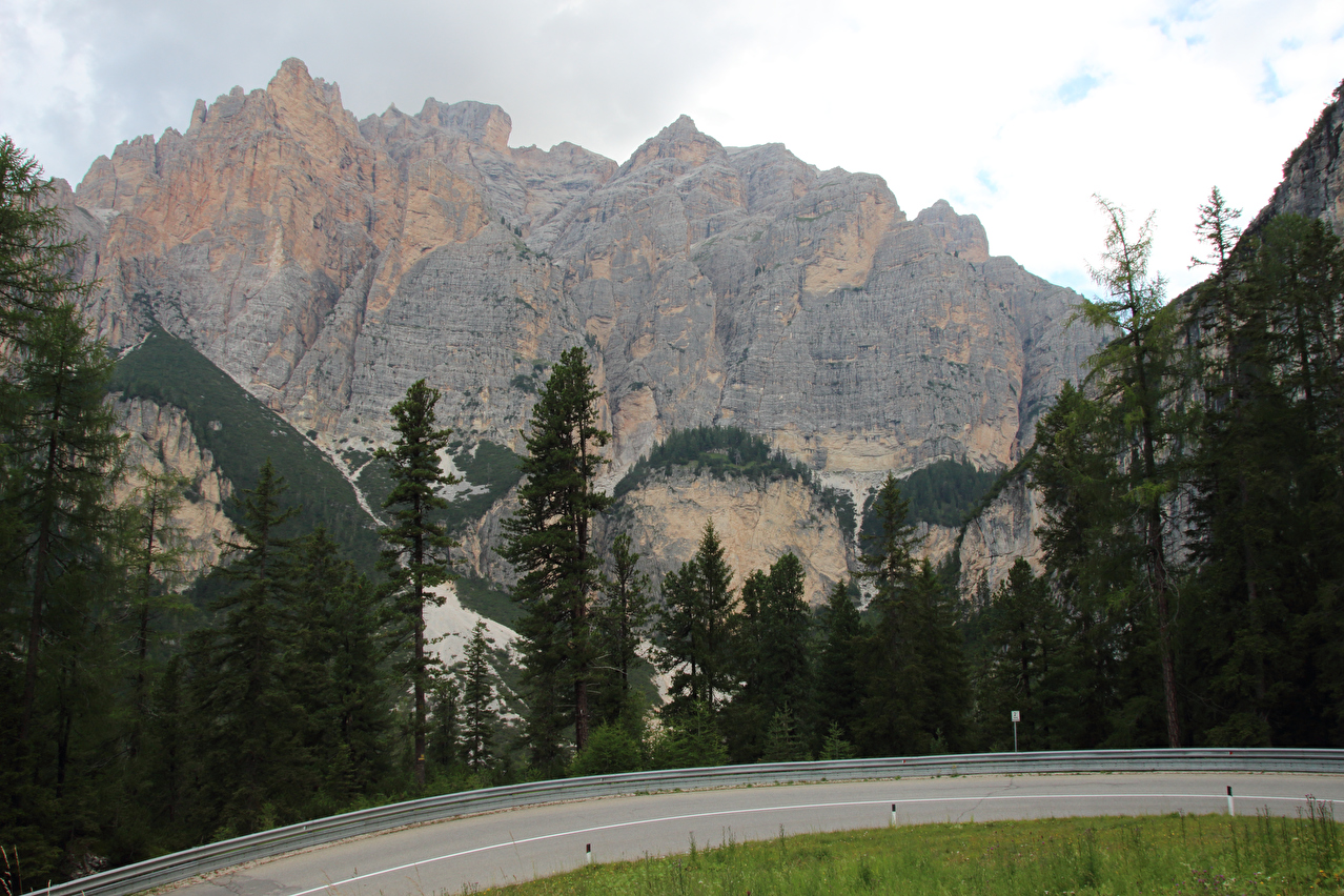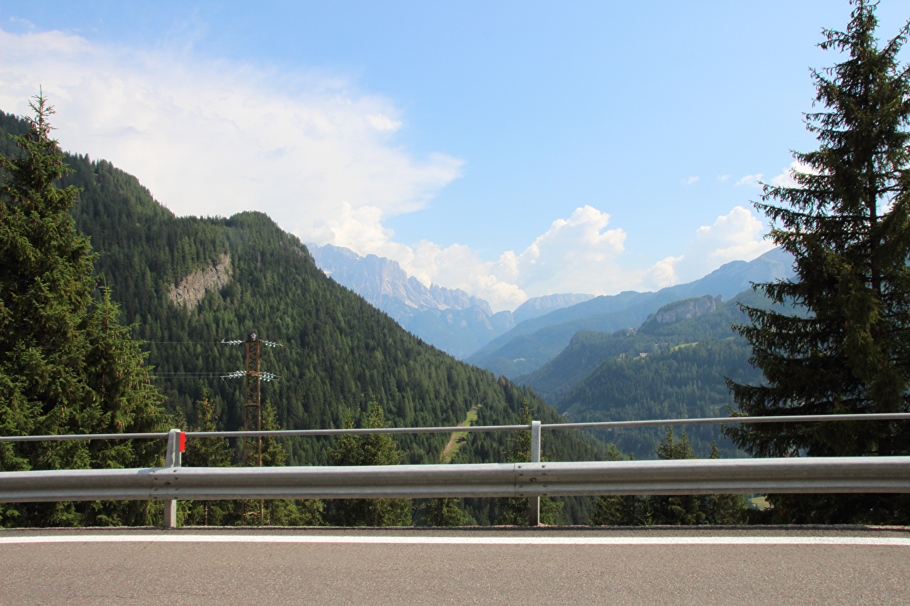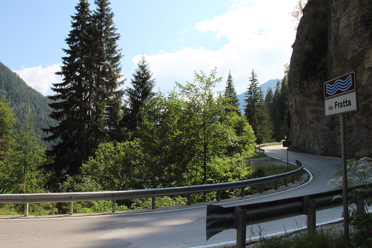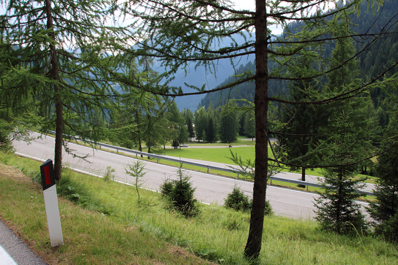 Beschreibung | An diesem Tag stand die Königsetappe auf dem Tourplan. Der Regen hatte sich über Nacht verzogen und zum Etappenstart begann die Sonne sich durch die Wolken zu fressen. So verlief auch diese Etappe zunächst bei viel Sonne, aufgrund der Höhe aber ohne die Hitze der Vortage. Von der Nordrampe fällt der Blick immer wieder auf die Gruppo del Sella und die Puezgruppe, die beide von zumindest einem eiszeitlichen Gletscher "abgehobelt" wurden und daher keine der sonst in den Alpen so typischen spitzen Gipfel aufweisen. Auf den letzten Kilometern bis zum Rifugio Valparola steigt die Nordrampe des Passo di Valparola allmählich immer stärker an. Dadurch wurde der richtige Punkt zum Wechsel von Fahren auf Schieben verpasst und eine Speiche im Hinterrad riss. Der Rest des Steilstücks wurde daher hoch geschoben, denn mit einer gerissenen Speiche kann weiter gefahren werden, solange auf die Fahrt bergauf in Steilstücken und bergab mit hoher Geschwindigkeit verzichtet wird. Mit zwei gerissenen Speichen sieht das schon viel schlechter aus. Im oberen Bereich der Nordrampe verläuft die Grenze zwischen Südtirol (Autonome Provinz Bozen – Südtirol) und dem Belluno (Provincia Belluno). Das Rifugio Valparola steht auf der Wasserscheide zwischen Etsch und Piave und markiert somit die eigentliche Passhöhe des Passo di Valparola. Die Straße steigt danach jedoch noch etwas weiter an, und auch auf der beschilderten Passhöhe des Passo di Valparola gibt es keinen niedrigeren Punkt, über den die Straße hätte führen können. Kurz nach Überquerung der Passhöhe des Passo di Valparola fiel der Blick auf die Passhöhe des Passhöhe Falzarego, über den Regen aufzog. Die ersten Tropfen ließen nicht lange auf sich warten und die Temperatur fiel in dieser Höhe rasch ab. Daher wurde "Vollschutz" angelegt, um nicht auszukühlen, da die Dauer des Regens nicht absehbar war. Die Passhöhe des Passhöhe Falzarego wurde nun schon zum dritten Mal und jedes Mal aus einer anderen Richtung erreicht. Das ist nur möglich, da die extrem kurze Südrampe des Passo di Valparola auf der Passhöhe des Passo Falzarego endet. Am 30.07.2010 wurde der Passo Falzarego von Westen nach Osten überquert, am 03.08.2014 von Osten nach Westen. Alle drei Aufenthalte auf der Passhöhe des Passo Falzarego hatten eine Gemeinsamkeit. Es regnete! Mit der Abfahrt von der Passhöhe bis Cernadoi erfolgte logischerweise eine inverse Streckenwiederholung und eine Streckenwiederholung. Der Regen endete bereits kurz nach Beginn der Abfahrt, sodass die Regenklamotten wieder abgelegt werden konnten. Ab Andraz ging es wieder bergauf. Bis Arabba lagen allerdings zwischen Pieve und Liviné sowie bei Renaz zwei Streckenabschnitte, auf denen spürbar Höhenmeter verloren wurden, die anschließend wieder hoch gefahren werden mussten. Bei Pieve kam ein weiterer Regenschauer nieder, gegen den aber die Regenjacke reichte. Die dritte und letzte Bergankunft im Rahmen dieser Tour erfolgte in Arabba rechtzeitig genug, um die gerissene Speiche im Hinterrad ersetzen zu lassen. Die Fahrradwerkstätten im Alpenraum sind offenbar größtenteils darauf eingerichtet, kleinere Reparaturen, sofern gegebenenfalls notwendige Ersatzteile verfügbar sind, sofort zu erledigen. Über Arabba hatten sich bei der Ankunft zwar reichlich Wolken versammelt, es blieb aber trocken. |