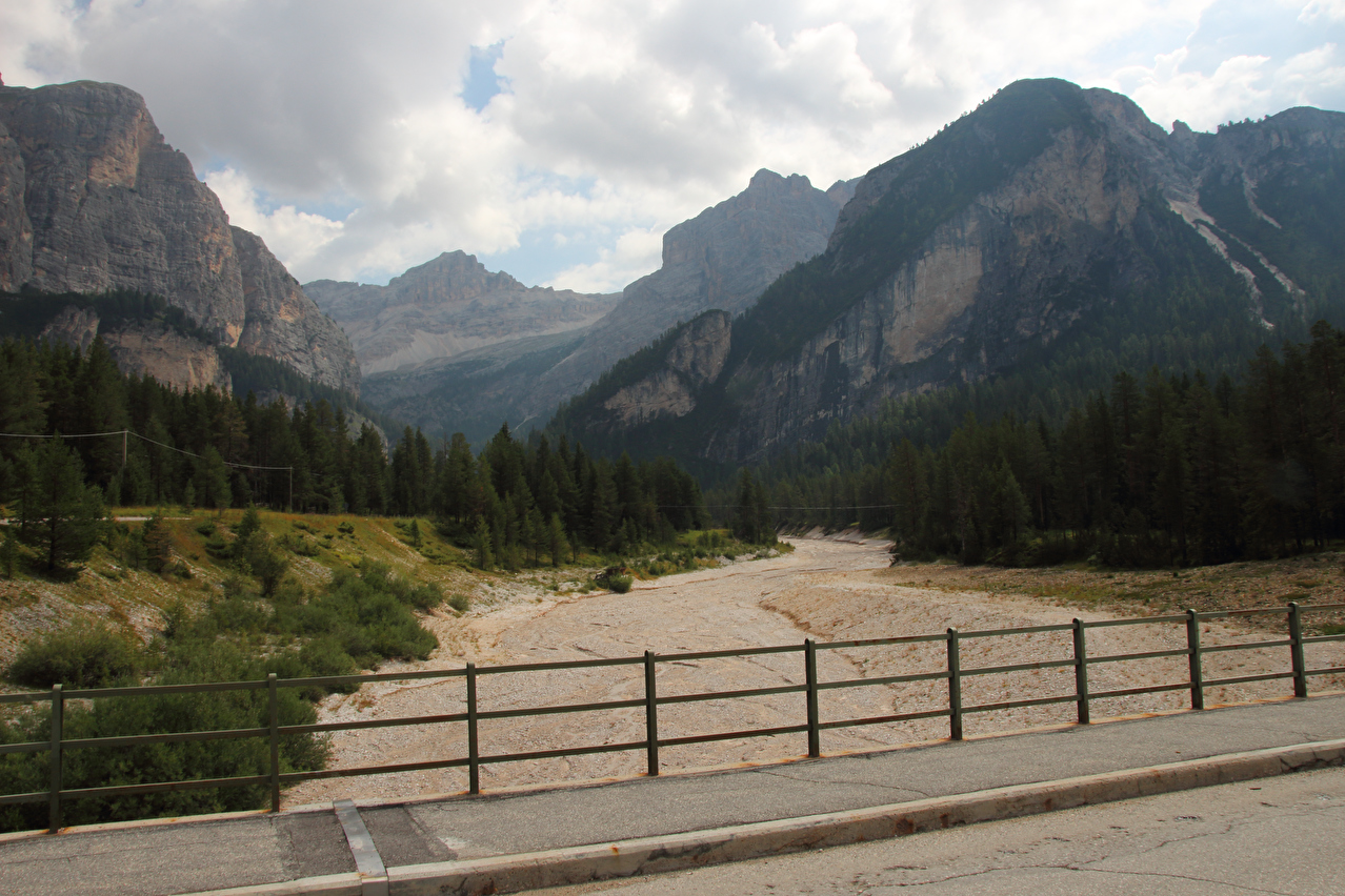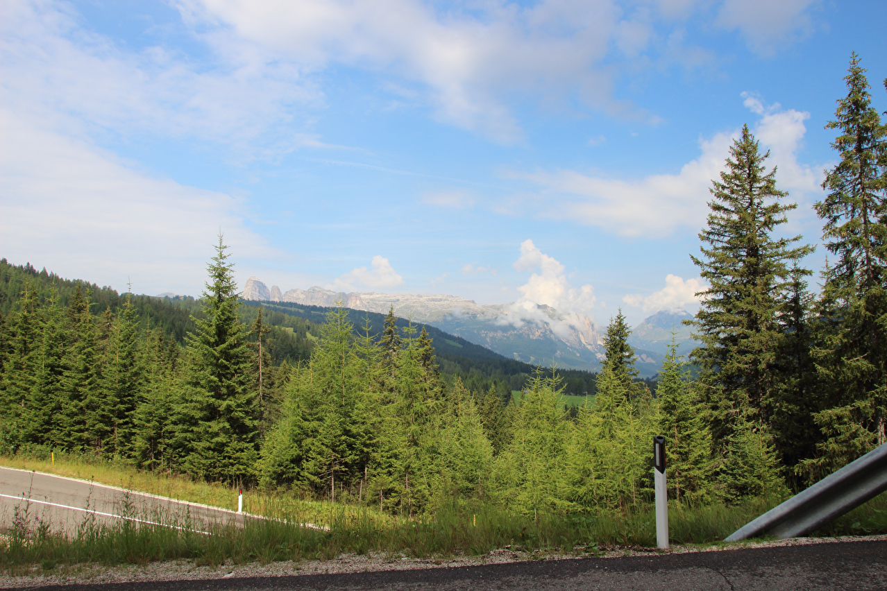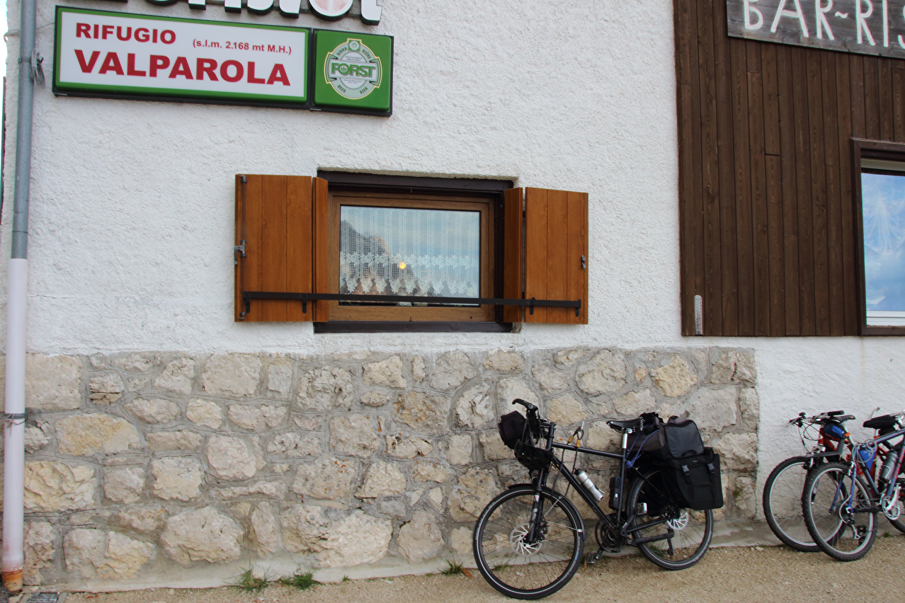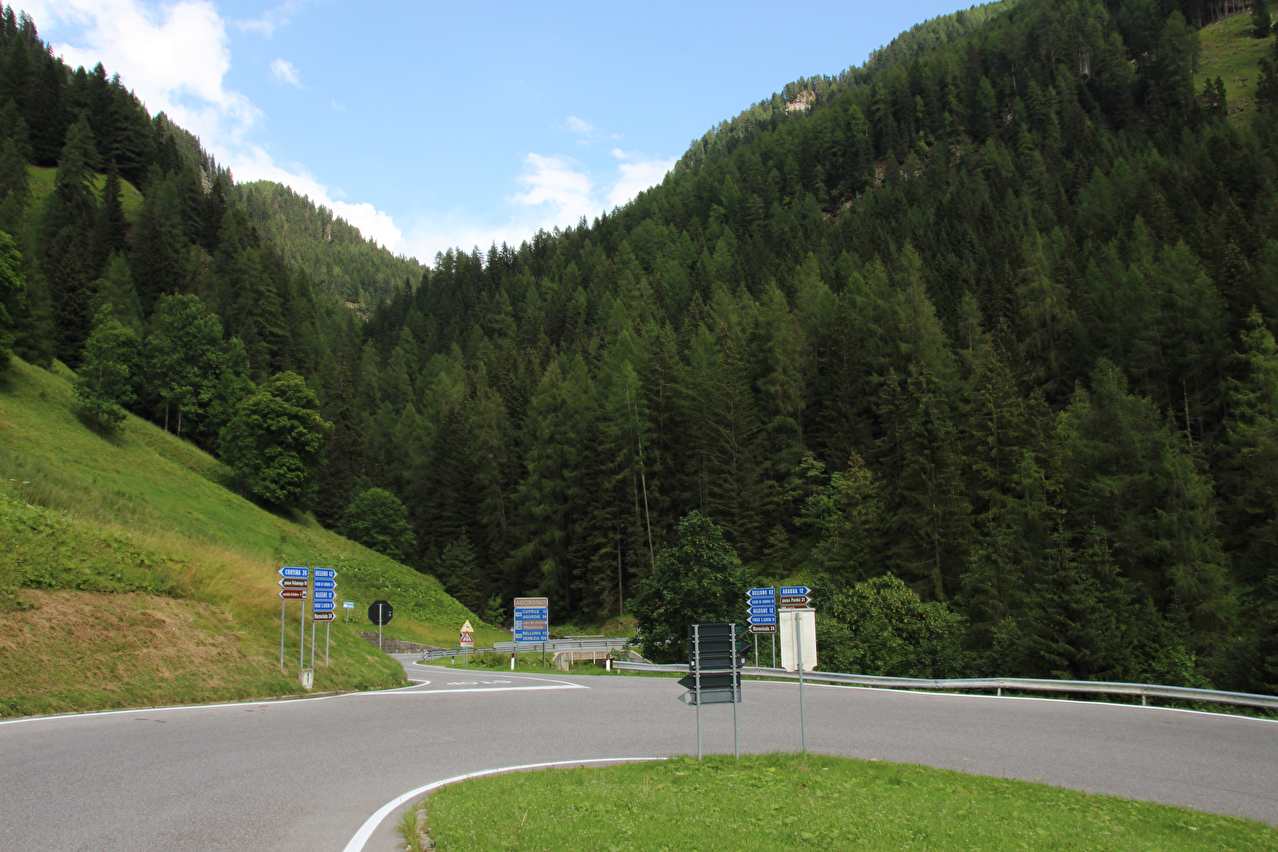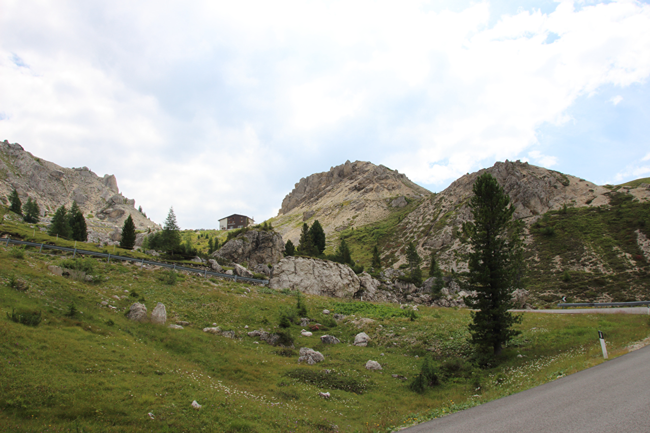 Beschreibung | An diesem Tag stand die Königsetappe auf dem Tourplan. Der Regen hatte sich über Nacht verzogen und zum Etappenstart begann die Sonne sich durch die Wolken zu fressen. So verlief auch diese Etappe zunächst bei viel Sonne, aufgrund der Höhe aber ohne die Hitze der Vortage. Von der Nordrampe fällt der Blick immer wieder auf die Gruppo del Sella und die Puezgruppe, die beide von zumindest einem eiszeitlichen Gletscher "abgehobelt" wurden und daher keine der sonst in den Alpen so typischen spitzen Gipfel aufweisen. Auf den letzten Kilometern bis zum Rifugio Valparola steigt die Nordrampe des Passo di Valparola allmählich immer stärker an. Dadurch wurde der richtige Punkt zum Wechsel von Fahren auf Schieben verpasst und eine Speiche im Hinterrad riss. Der Rest des Steilstücks wurde daher hoch geschoben, denn mit einer gerissenen Speiche kann weiter gefahren werden, solange auf die Fahrt bergauf in Steilstücken und bergab mit hoher Geschwindigkeit verzichtet wird. Mit zwei gerissenen Speichen sieht das schon viel schlechter aus. Im oberen Bereich der Nordrampe verläuft die Grenze zwischen Südtirol (Autonome Provinz Bozen – Südtirol) und dem Belluno (Provincia Belluno). Das Rifugio Valparola steht auf der Wasserscheide zwischen Etsch und Piave und markiert somit die eigentliche Passhöhe des Passo di Valparola. Die Straße steigt danach jedoch noch etwas weiter an, und auch auf der beschilderten Passhöhe des Passo di Valparola gibt es keinen niedrigeren Punkt, über den die Straße hätte führen können. Kurz nach Überquerung der Passhöhe des Passo di Valparola fiel der Blick auf die Passhöhe des Passhöhe Falzarego, über den Regen aufzog. Die ersten Tropfen ließen nicht lange auf sich warten und die Temperatur fiel in dieser Höhe rasch ab. Daher wurde "Vollschutz" angelegt, um nicht auszukühlen, da die Dauer des Regens nicht absehbar war. Die Passhöhe des Passhöhe Falzarego wurde nun schon zum dritten Mal und jedes Mal aus einer anderen Richtung erreicht. Das ist nur möglich, da die extrem kurze Südrampe des Passo di Valparola auf der Passhöhe des Passo Falzarego endet. Am 30.07.2010 wurde der Passo Falzarego von Westen nach Osten überquert, am 03.08.2014 von Osten nach Westen. Alle drei Aufenthalte auf der Passhöhe des Passo Falzarego hatten eine Gemeinsamkeit. Es regnete! Mit der Abfahrt von der Passhöhe bis Cernadoi erfolgte logischerweise eine inverse Streckenwiederholung und eine Streckenwiederholung. Der Regen endete bereits kurz nach Beginn der Abfahrt, sodass die Regenklamotten wieder abgelegt werden konnten. Ab Andraz ging es wieder bergauf. Bis Arabba lagen allerdings zwischen Pieve und Liviné sowie bei Renaz zwei Streckenabschnitte, auf denen spürbar Höhenmeter verloren wurden, die anschließend wieder hoch gefahren werden mussten. Bei Pieve kam ein weiterer Regenschauer nieder, gegen den aber die Regenjacke reichte. Die dritte und letzte Bergankunft im Rahmen dieser Tour erfolgte in Arabba rechtzeitig genug, um die gerissene Speiche im Hinterrad ersetzen zu lassen. Die Fahrradwerkstätten im Alpenraum sind offenbar größtenteils darauf eingerichtet, kleinere Reparaturen, sofern gegebenenfalls notwendige Ersatzteile verfügbar sind, sofort zu erledigen. Über Arabba hatten sich bei der Ankunft zwar reichlich Wolken versammelt, es blieb aber trocken. |