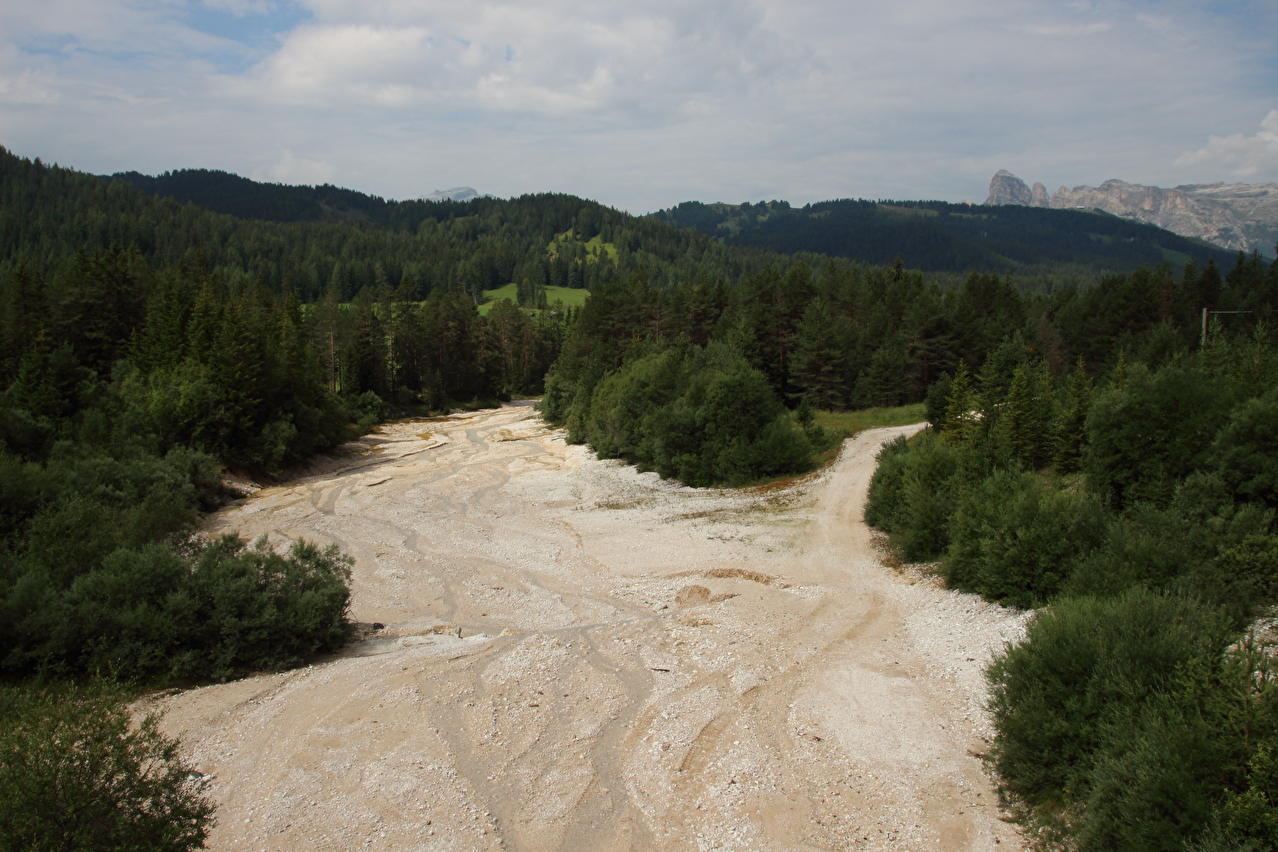 … und Blick flussabwärts auf den Sassongher in der Puezgruppe (links im Bild) ![]() 300 dpi JPEG |