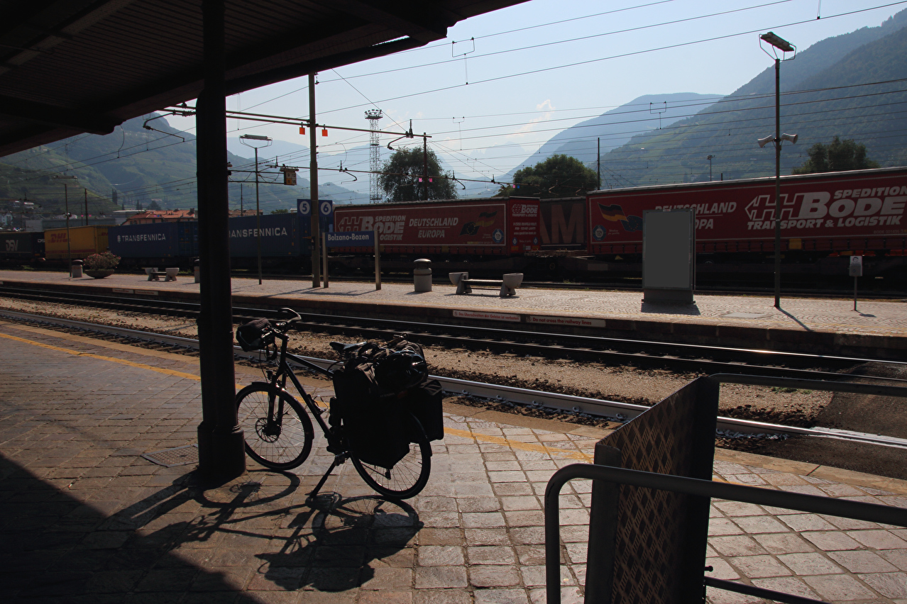 Beschreibung | Schon am Morgen stand die Hitze in Bozen, dennoch kam der Zug pünktlich an. Während der Fahrt durch das Eisacktal auf den Brennerpass kam immer mal wieder der Eisacktal-Radweg ins Blickfeld, auf dem im Jahr zuvor Streckenabschnitte von vier Etappen am 03.08.2017, am 04.08.2017, am 05.08.2017 und am 06.08.2017 verliefen. Der Umstand, dass der Eisacktal-Radweg schon bergauf gefahren worden war, war auch mit ein Grund dafür, die Bahnrückreise dieses Mal von Bozen, also einem Ort weit südlich des Alpenhauptkamms anzutreten. Auf dem Brennerpass herrschte anders als im Vorjahr, in dem ein Unwetter die Tour unplanmäßig auf dem Brennerpass beendet hatte, schönstes Wetter. Die Ankunft in München erfolgte etwas verspätet, aber bei über einer Stunde Umsteigezeit war das kein Problem. Lästig war dafür die drückende Hitze im Bahnhof. Erfreulicherweise wurde der Zug nach Hannover bereits eine halbe Stunde vor Abfahrt bereit gestellt. Im Bahnhof wurde noch schnell eine warme Mahlzeit gekauft und nach dem entspannten Einstieg in den im Vergleich zum Bahnhof deutlich kühleren Zug verspeist. Die Ankunft in Hannover erfolgte verspätet, aber wenigstens fuhr der Zug ohne technische oder sonstige Probleme durch. Mit dem Passo di Valparola und dem Passo Pordoi hatte die Tour zwei der landschaftlich schönsten bisher gefahrenen Alpenpässe in Italien geboten. Dafür war die Unterquerung des Alpenhauptkamms per passivem Transport durch den Felbertauerntunnel doch deutlich suboptimal gewesen. Ansonsten bot die Tour vom bayerischen Alpenvorland bis zu hochalpinem Gelände in den Dolomiten sehr viel. Einzig große Gletscher und eisbedeckte Berge waren dieses Mal nicht zu sehen. Für den Blick auf eisbedeckte Berge bleibt wohl nur die Fahrt zu den 4000ern in den Westalpen. Neun Tage für die Strecke von Westerbuchberg bei Übersee nach Bozen – die vierte und die siebte Etappe brachten keine Streckengewinne – sind sicherlich recht langsam, aber im Rahmen dieser Tour wurde auch nicht die kürzestmögliche Strecke dafür gewählt, sondern ein kleiner, dafür aber lohnenswerter Umweg in den Dolomiten gefahren. Neben Streckenkilometern gehören Höhenmeter bergauf und bergab zu einer Alpenfahrradtour selbstverständlich dazu, aber Kilometer fressen und Höhenmeter bergauf bolzen sind keine primären Ziele dieser Touren. Im Vordergrund steht das Naturerlebnis, und das wird durch das Fahrrad fahren, also die mit einer gewissen körperlichen Belastung einhergehende Fortbewegung allein durch Muskelkraft, besonders intensiv. Und dann dauert die Überwindung der Strecke eben etwas länger. Zum Vergleich: Von Übersee nach Bozen dauert die schnellste Bahnverbindung auch mit Fahrradmitnahme 3 h 53 min (mit 1× Umsteigen) und nur mit Nahverkehrszügen 5 h 03 min (mit 3× Umsteigen). Der Naturerlebniswert strebt im Zug allerdings gegen Null. |