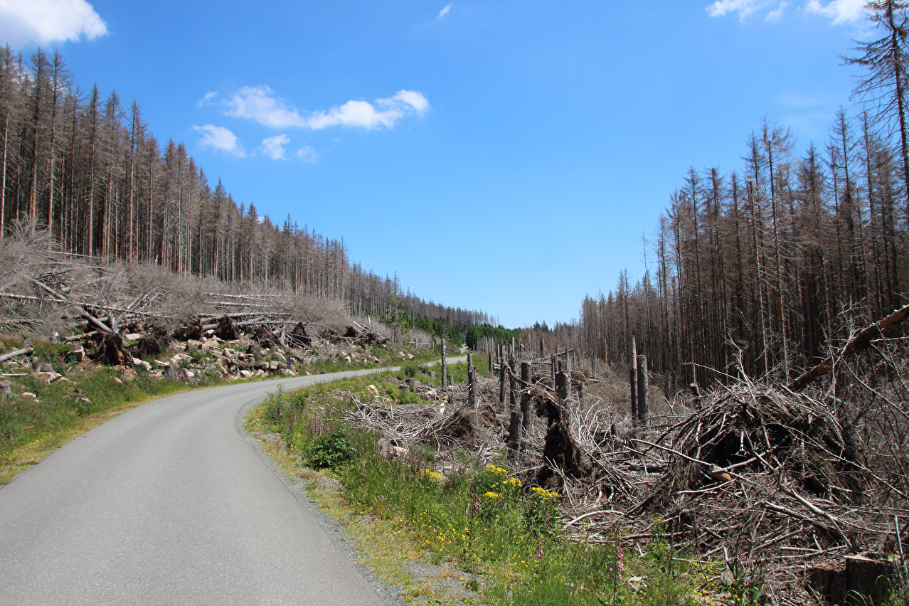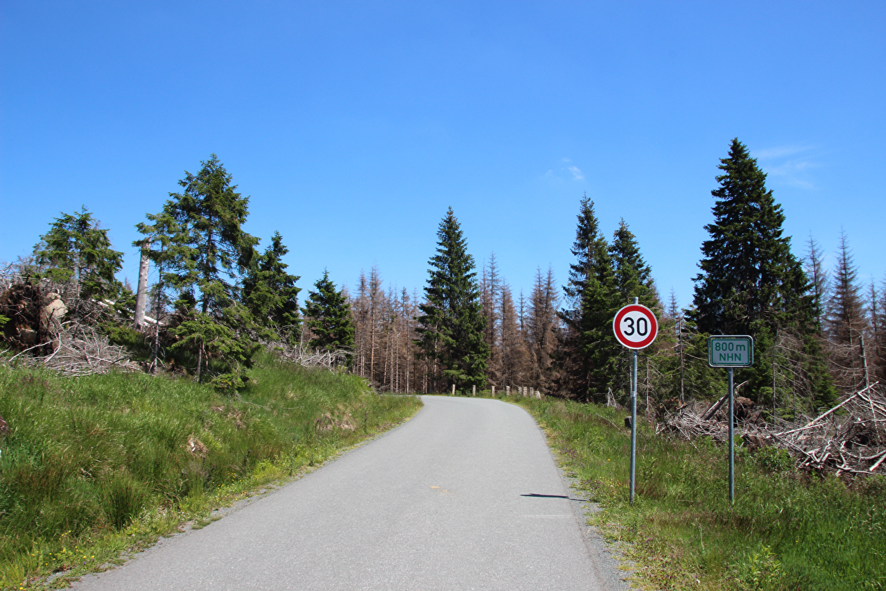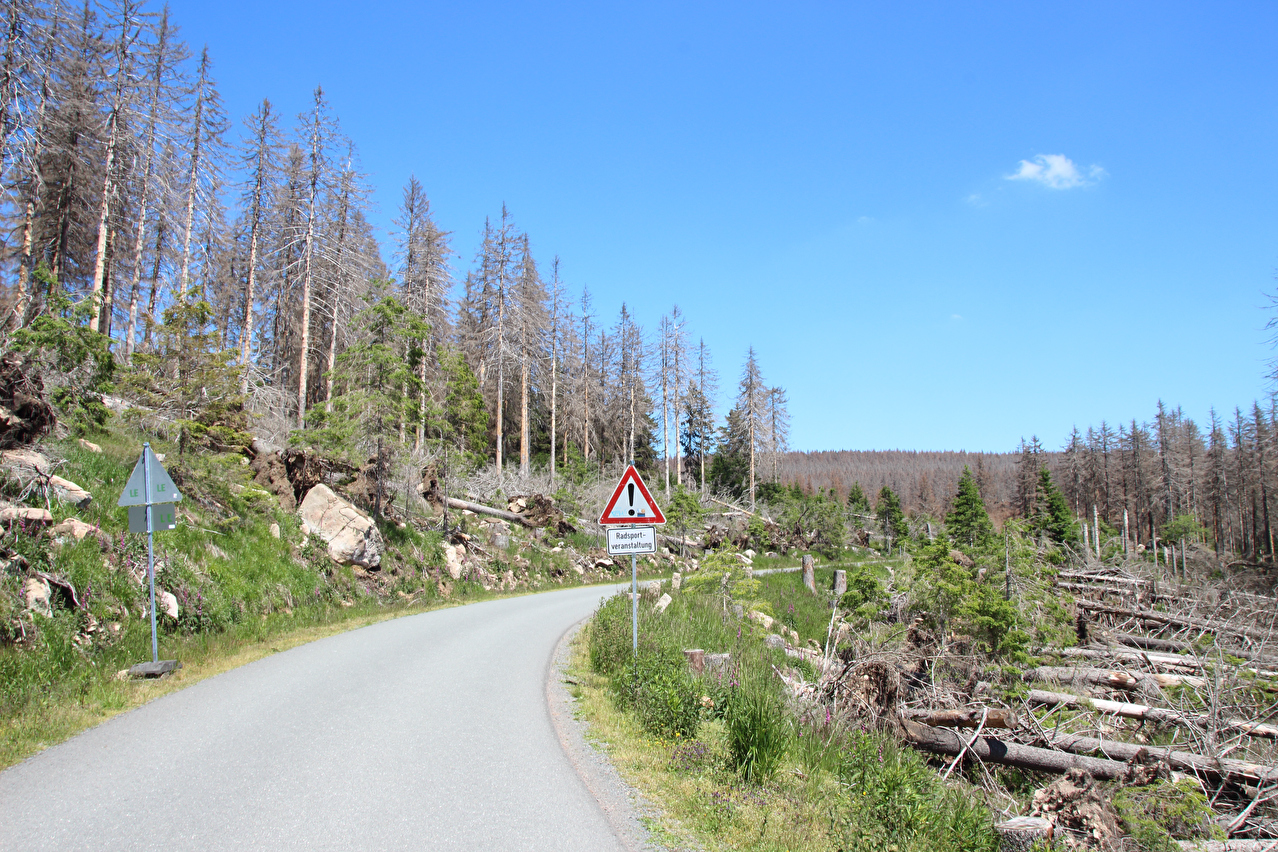 Beschreibung | Ohne den Stress einer morgendlichen Bahnanreise startete die zweite Etappe dieser Tour gleich in die richtige Richtung, also bergauf. Durch den früheren Etappenstart ab Wernigerode-Hasserode konnte ohne Zeitdruck gefahren werden, da bei planmäßigem Etappenverlauf zuverlässig noch ein Zug von Wernigerode mit Umstieg in Goslar nach Hannover erreicht werden würde. Während bis Schierke der Wald noch größtenteils grün war, zeigte sich gleich hinter Schierke ein ganz anderes Bild. Große Flächen neuer Totwald säumten die Brockenstraße. Weite Abschnitte der Brockenstraße, die früher ganztägig im Schatten lagen, lagen nun in der prallen Sonne. Die Dürre 2018 hatte den Bäumen schon arg zugesetzt, nur waren diese Dürreschäden im letzen Jahr vornehmlich an der Bodenvegetation zu erkennen, während die meisten Bäume noch grün waren. Das Wasserdefizit im Boden wurde aber im Winter und Frühjahr nicht aufgefüllt, womit die Bäume geschwächt blieben. Mit der Wärme kamen dann die Borkenkäfer und gaben den Bäumen den finalen Rest, da die Bäume wegen der Trockenheit nicht genug Harz zur Käferabwehr bilden konnten und sich zudem die Borkenkäfer bei dem trocken-warmen Wetter explosionsartig vermehrten. Bekämpft wird der Borkenkäfer im Nationalpark nicht. Dort lässt man der Natur freien Lauf, schützt also momentan den Borkenkäfer. Spannend wird es, wenn so eine große neue Totwaldfläche, die eine enorme Brandlast darstellt, durch einen natürlichen Vorgang, etwa einen Blitzeinschlag in Brand gerät. Wird man dann auch der Natur freien Lauf lassen und allenfalls Gebäude und Infrastruktur zu schützen versuchen oder doch versuchen, alles großflächig zu löschen? Lediglich in der Krummholzzone bis zur montanen Baumgrenze konnte sich der Borkenkäfer bisher nicht etablieren, da es dem dort vermutlich (noch) zu kalt ist. Auf dem Brockengipfel wurde dieses Mal etwas mehr Zeit verbracht, da kein Grund zur Eile bestand. Die Fernsicht war sehr gut und reichte bis zum Hohen Meißner im Hessischen Bergland. Der Andrang auf dem Gipfel hielt sich für einen Sonntag im Sommer in Grenzen. Die Abfahrt erfolgte zwar zügig, einige Fotos wurden dennoch geschossen. In Wernigerode wurde der Zug ab 19:21 Uhr erreicht, also mitnichten der letzte. |