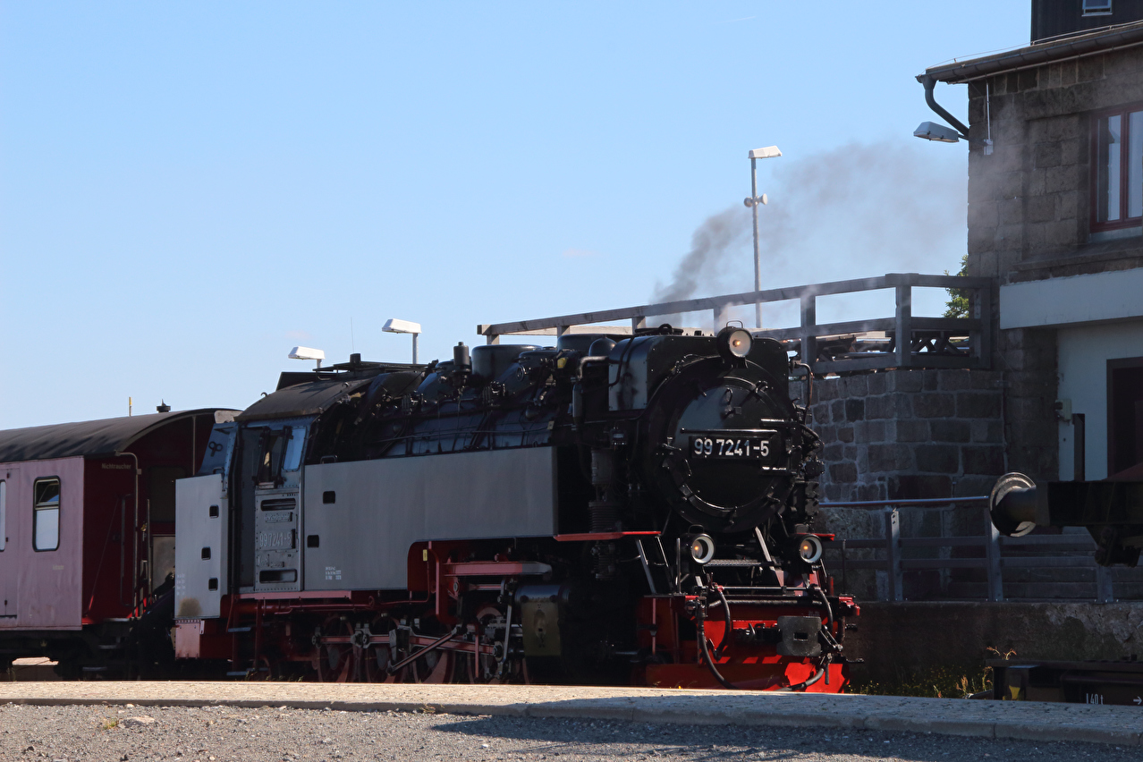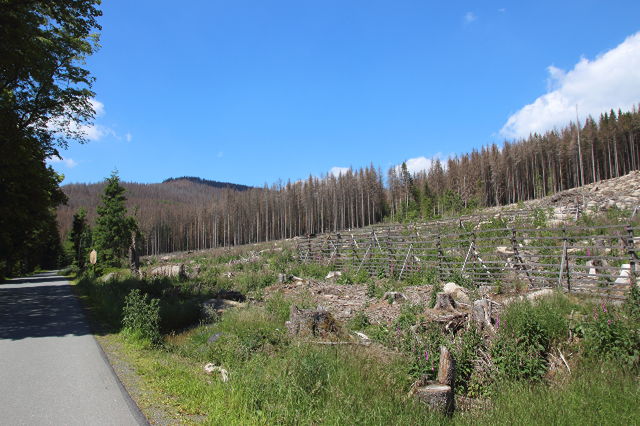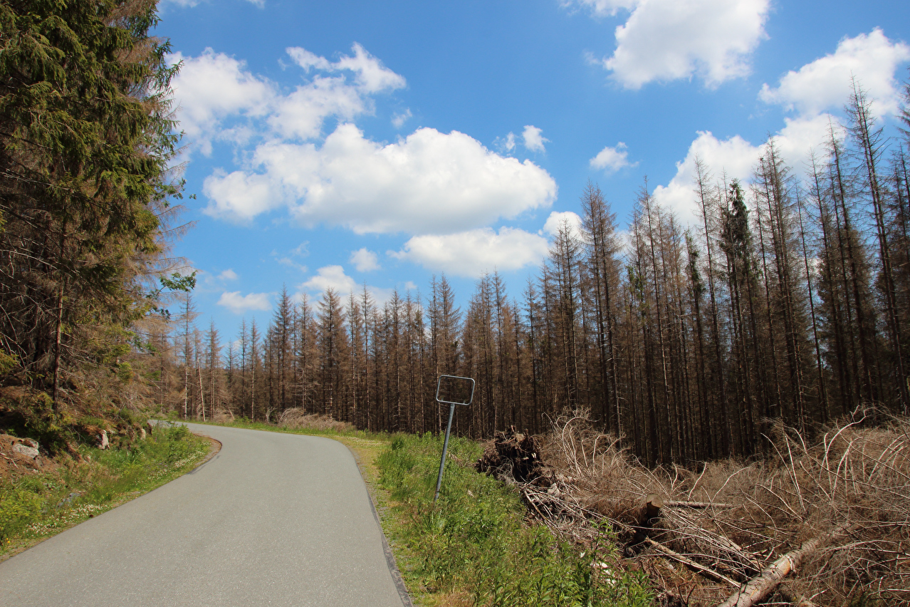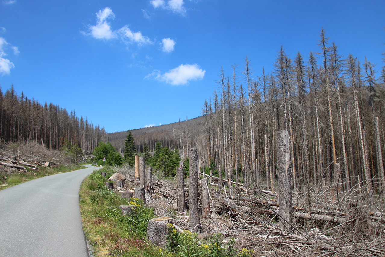 Beschreibung | Ohne den Stress einer morgendlichen Bahnanreise startete die zweite Etappe dieser Tour gleich in die richtige Richtung, also bergauf. Durch den früheren Etappenstart ab Wernigerode-Hasserode konnte ohne Zeitdruck gefahren werden, da bei planmäßigem Etappenverlauf zuverlässig noch ein Zug von Wernigerode mit Umstieg in Goslar nach Hannover erreicht werden würde. Während bis Schierke der Wald noch größtenteils grün war, zeigte sich gleich hinter Schierke ein ganz anderes Bild. Große Flächen neuer Totwald säumten die Brockenstraße. Weite Abschnitte der Brockenstraße, die früher ganztägig im Schatten lagen, lagen nun in der prallen Sonne. Die Dürre 2018 hatte den Bäumen schon arg zugesetzt, nur waren diese Dürreschäden im letzen Jahr vornehmlich an der Bodenvegetation zu erkennen, während die meisten Bäume noch grün waren. Das Wasserdefizit im Boden wurde aber im Winter und Frühjahr nicht aufgefüllt, womit die Bäume geschwächt blieben. Mit der Wärme kamen dann die Borkenkäfer und gaben den Bäumen den finalen Rest, da die Bäume wegen der Trockenheit nicht genug Harz zur Käferabwehr bilden konnten und sich zudem die Borkenkäfer bei dem trocken-warmen Wetter explosionsartig vermehrten. Bekämpft wird der Borkenkäfer im Nationalpark nicht. Dort lässt man der Natur freien Lauf, schützt also momentan den Borkenkäfer. Spannend wird es, wenn so eine große neue Totwaldfläche, die eine enorme Brandlast darstellt, durch einen natürlichen Vorgang, etwa einen Blitzeinschlag in Brand gerät. Wird man dann auch der Natur freien Lauf lassen und allenfalls Gebäude und Infrastruktur zu schützen versuchen oder doch versuchen, alles großflächig zu löschen? Lediglich in der Krummholzzone bis zur montanen Baumgrenze konnte sich der Borkenkäfer bisher nicht etablieren, da es dem dort vermutlich (noch) zu kalt ist. Auf dem Brockengipfel wurde dieses Mal etwas mehr Zeit verbracht, da kein Grund zur Eile bestand. Die Fernsicht war sehr gut und reichte bis zum Hohen Meißner im Hessischen Bergland. Der Andrang auf dem Gipfel hielt sich für einen Sonntag im Sommer in Grenzen. Die Abfahrt erfolgte zwar zügig, einige Fotos wurden dennoch geschossen. In Wernigerode wurde der Zug ab 19:21 Uhr erreicht, also mitnichten der letzte. |