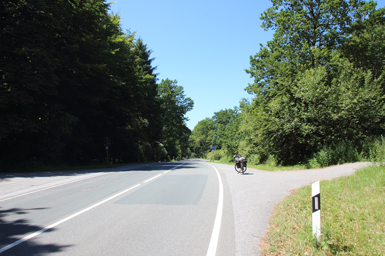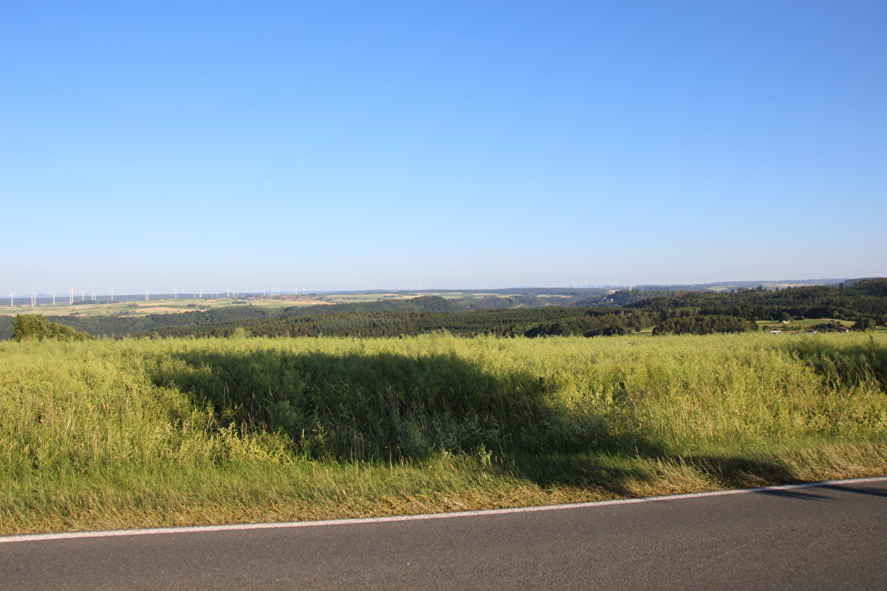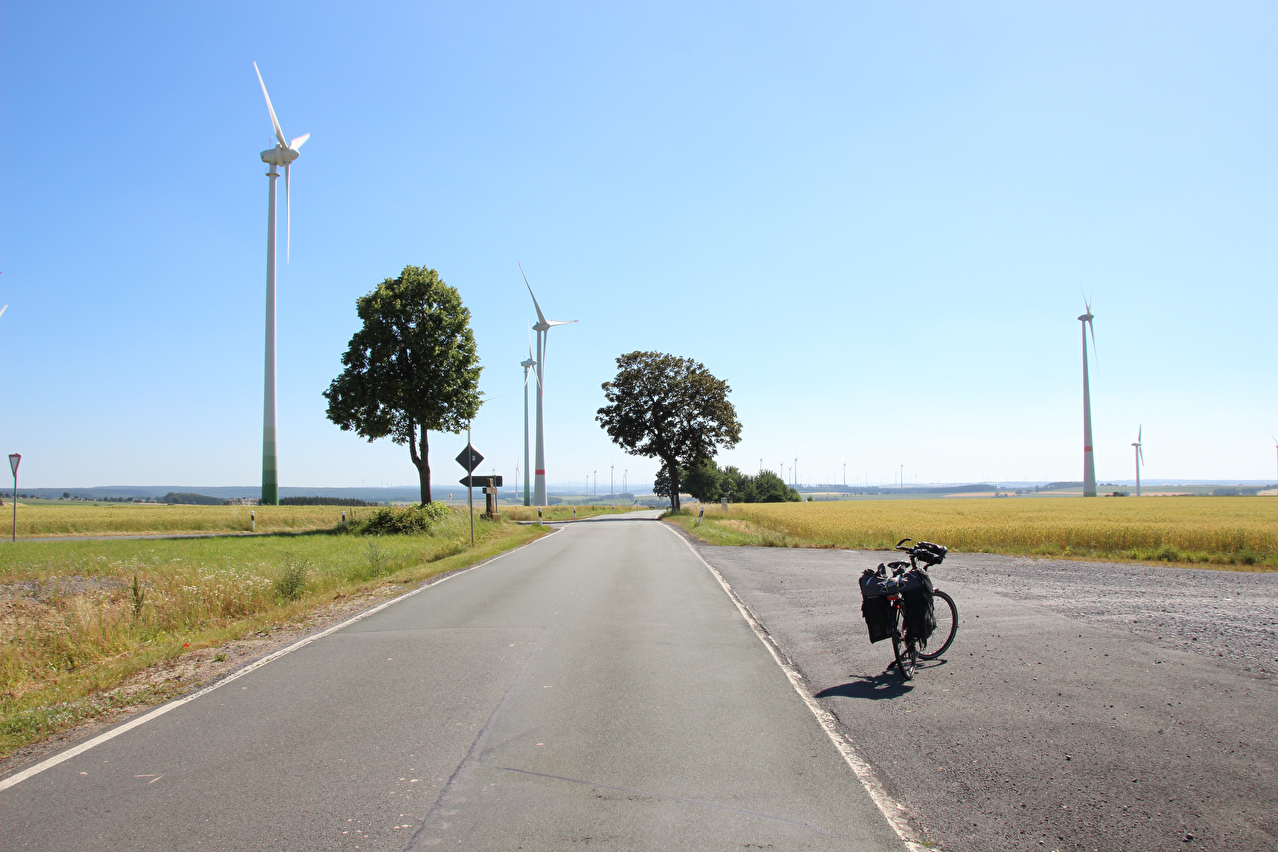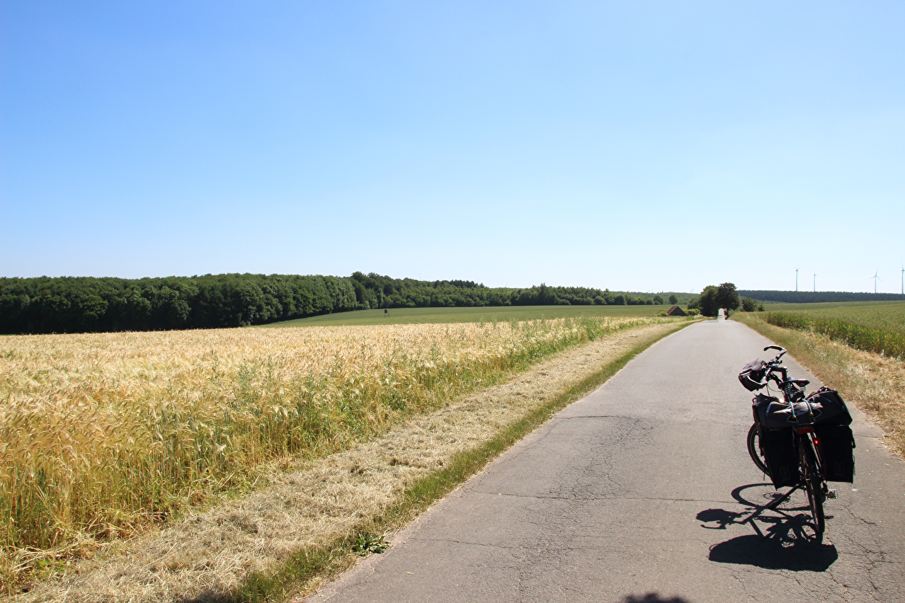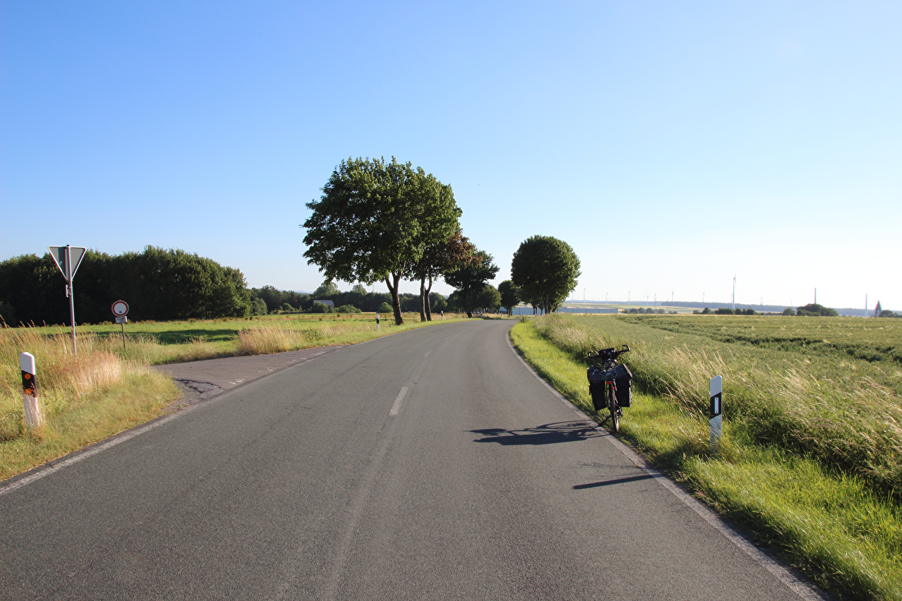 Beschreibung | Das Eggegebirge (kurz: die Egge) war bei den Anfahrten zu früheren Sauerlandtouren immer mit dem Zug durchquert worden und dabei war auch immer mal der Gedanke aufgekommen, dort Fahrrad zu fahren. Wegen der beiden Hitzewellen war statt einer Viertagestour dieses Mal die Entscheidung für zwei Zweitagestouren genau zwischen den Hitzewellen gefallen. Nach der Harztour am Wochenende folgte die erste dreitägige Hitzewelle. Diese zweite Zweitagestour führte nun in die Egge und angrenzende Gebiete und nutzte genau die beiden Tage bis zur nächsten Hitzewelle. Warm war es wegen des wolkenlosen Himmels trotzdem. Die Tour führte notwendigerweise zu Beginn durch die landschaftlich wenig attraktive Steinheimer Börde, da es zwischen Steinheim und Altenbeken keinen S-Bahn-Halt gibt und Überquerung des Eggehauptkamms von Langeland nach Altenbeken nicht ausgelassen werden sollte. Dieser erste Anstieg dieser Etappe war auch der längste. Da der Eggehauptkamm keine tiefen Einkerbungen in seinem Verlauf aufweist, steigen die Passstraßen über die Egge notwendigerweise sehr weit auf, wobei hier " sehr weit" in Relation zur Höhe der Egge und der umliegenden Mittelgebirge zu sehen ist. Die Passhöhe der L755 zwischen Langeland und Altenbeken liegt auf 376 m ü.NHN, der höchste Berg in der Egge ist gerade mal 464 m ü.NHN hoch. In der Westrampe der Passtraße liegen an mehreren Stellen Bremsschwellen quer über die gesamte Fahrbahn. Was der Verkehrsberuhigung dienen soll, stellt tatsächlich eine Gefahr für Zweiradfahrer dar! Von der Passhöhe kommend warnt lediglich ein Schild vor "Fahrbahnunebenheiten". Auch mit einer zur Sturzvermeidung reduzierten Geschwindigkeit sind diese Bremsschwellen oft erst sehr spät zu erkennen. Einen Materialschaden am Fahrrad können diese Bremsschwellen aufgrund ihrer Geometrie schon bei recht niedriger Geschwindigkeit verursachen. Eine Umfahrung ist mit dem Fahrrad selbst mit niedriger Geschwindigkeit nicht möglich, da diese Bremsschwellen sich über die gesamte Fahrbahn erstrecken. Ab Altenbeken, wo Mittag gegessen wurde, verlief diese Etappe mit Generalkurs Süd. Sie bot zwar keine langen Anstiege mehr, die Höhenmeter bergauf läpperten sich vielmehr durch das wellige Streckenprofil zusammen. Der Anstieg von Schwaney nach Herbram enthielt die steilste Rampe dieser Etappe mit bis zu 12 % Steigung. Nördlich oberhalb von Herbram erschienen zum ersten Mal die Berge des Sauerlandes am Südhorizont, davor allerdings zahlreiche Windkraftanlagen der beiden Windparks Asseln und Sintfeld. Die Fahrt führte dann auch durch den Windpark Asseln. Schön anzusehen sind diese Windspargel sicherlich nicht, aber zum einen ist die Paderborner Hochfläche im wesentlichen mit Feldern bestellt, also optisch wenig attraktiv, und zum anderen geht es ohne Windkraft hierzulande nicht, wenn der Strom nicht aus Kohle- und Kernkraftwerken kommen soll, denn "aus der Steckdose" kommt der Strom nun mal nicht. Der letzte, recht unscheinbare Sattelpunkt der Tour bildete auch das "Dach der Tour" kurz vor dem Etappenziel Essentho. |